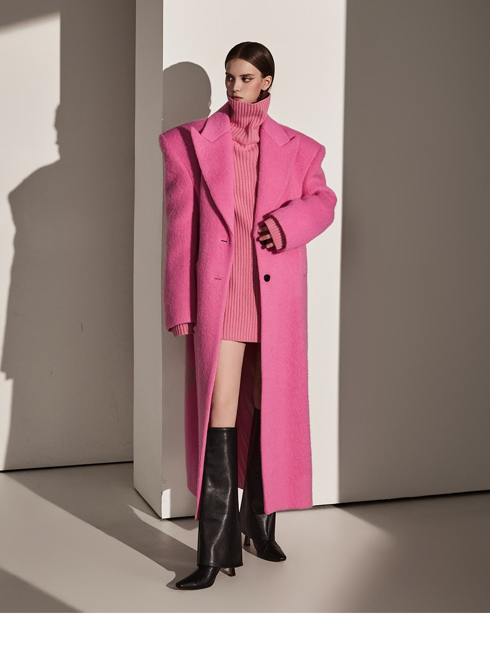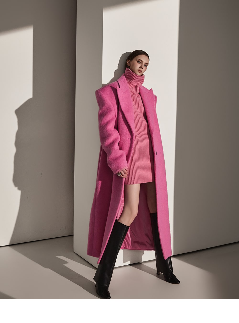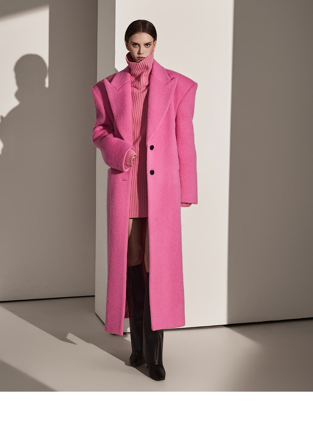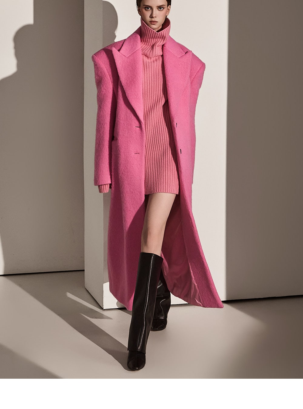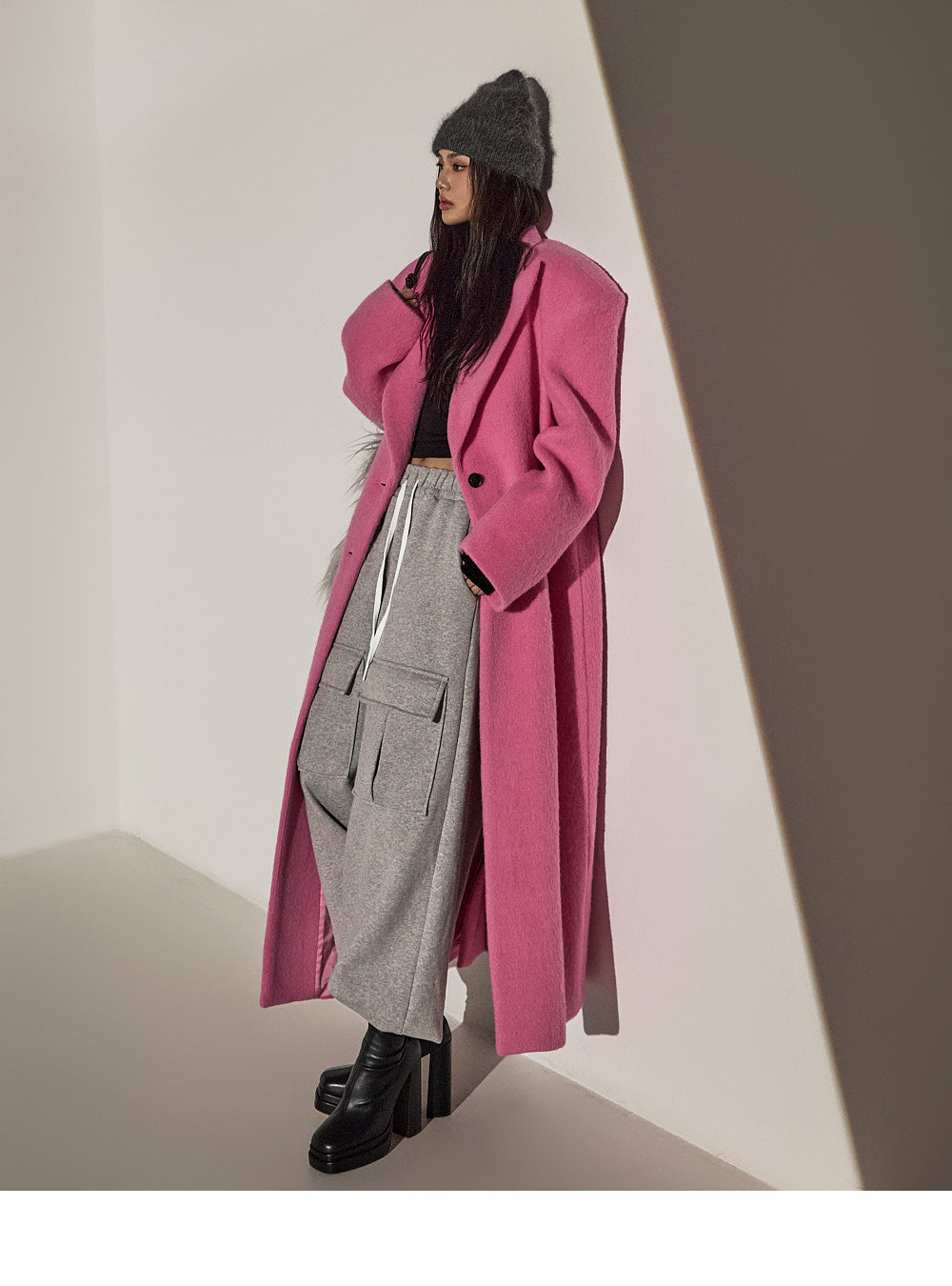 このコートは魅力的なピンク色で目立ちます。