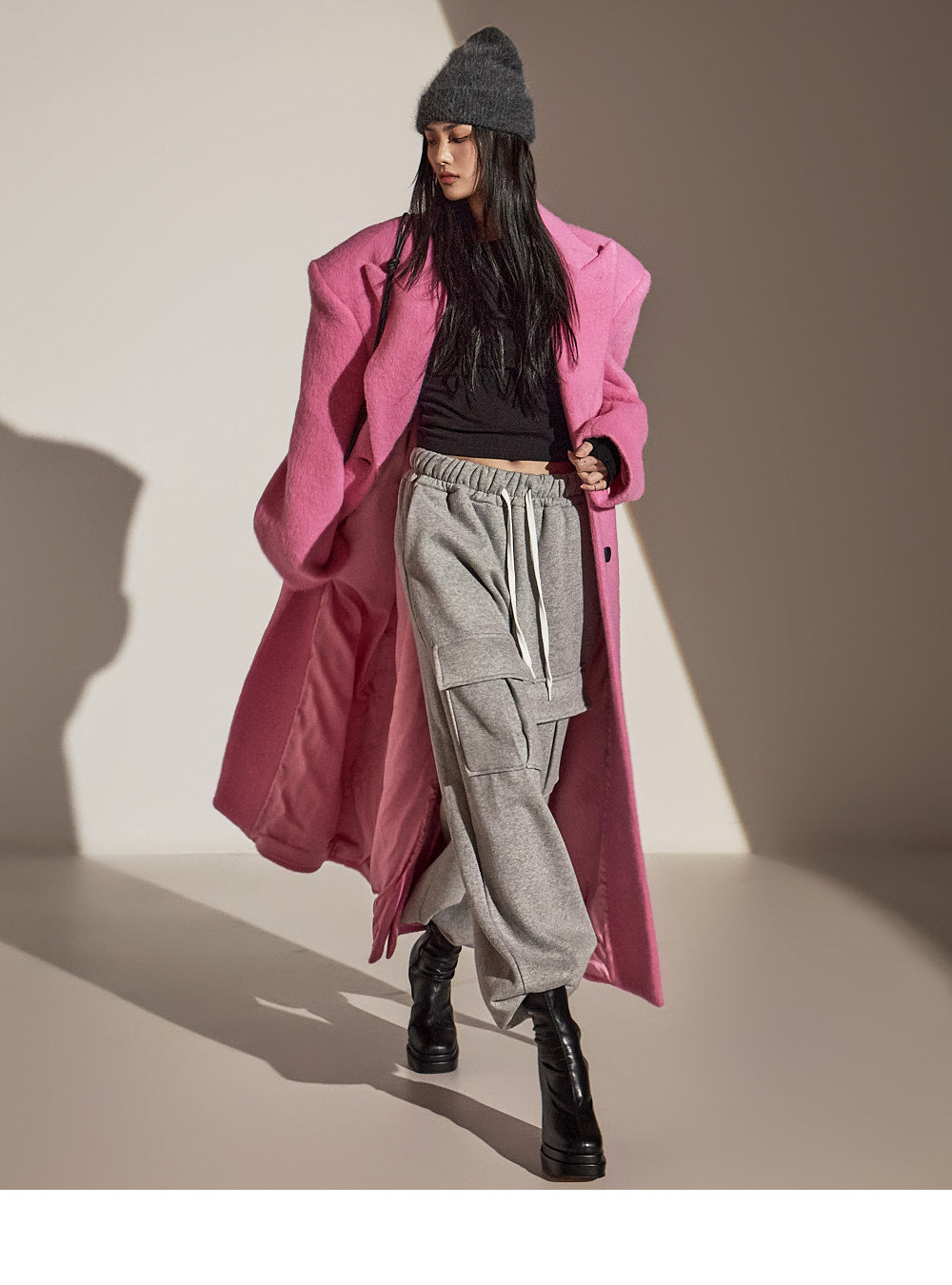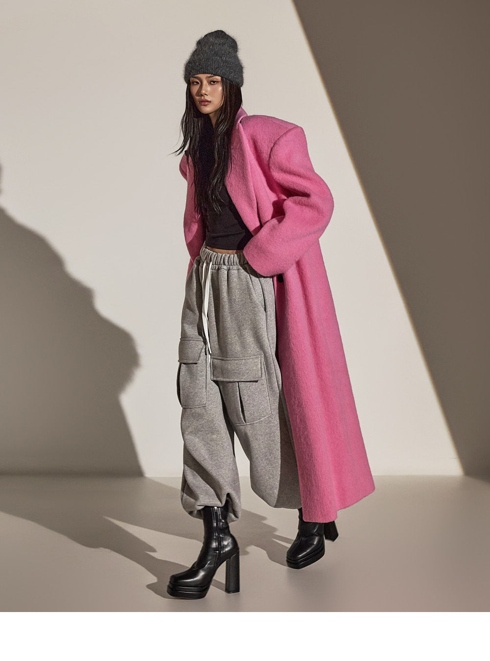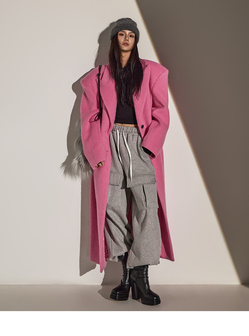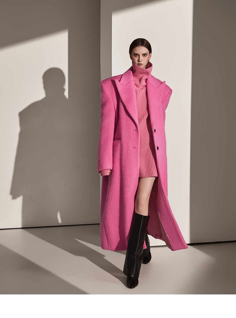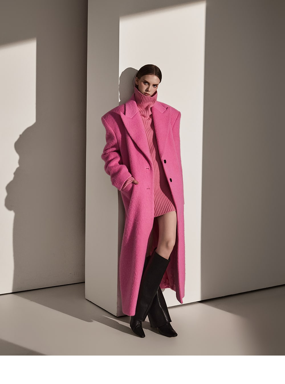 このコートは魅力的なピンク色で目立ちます。