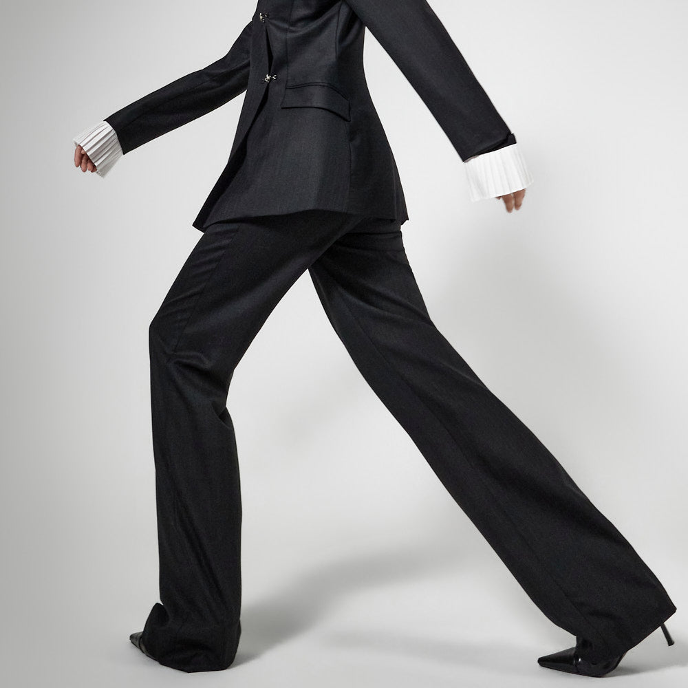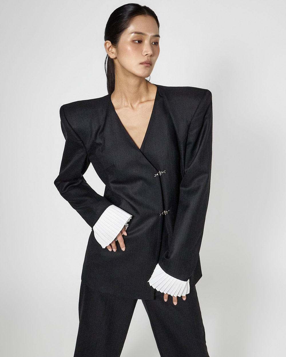 ワイドなショルダーラインに厚めのパッドを入れ、ボリューム感のあるシルエットを実現。
