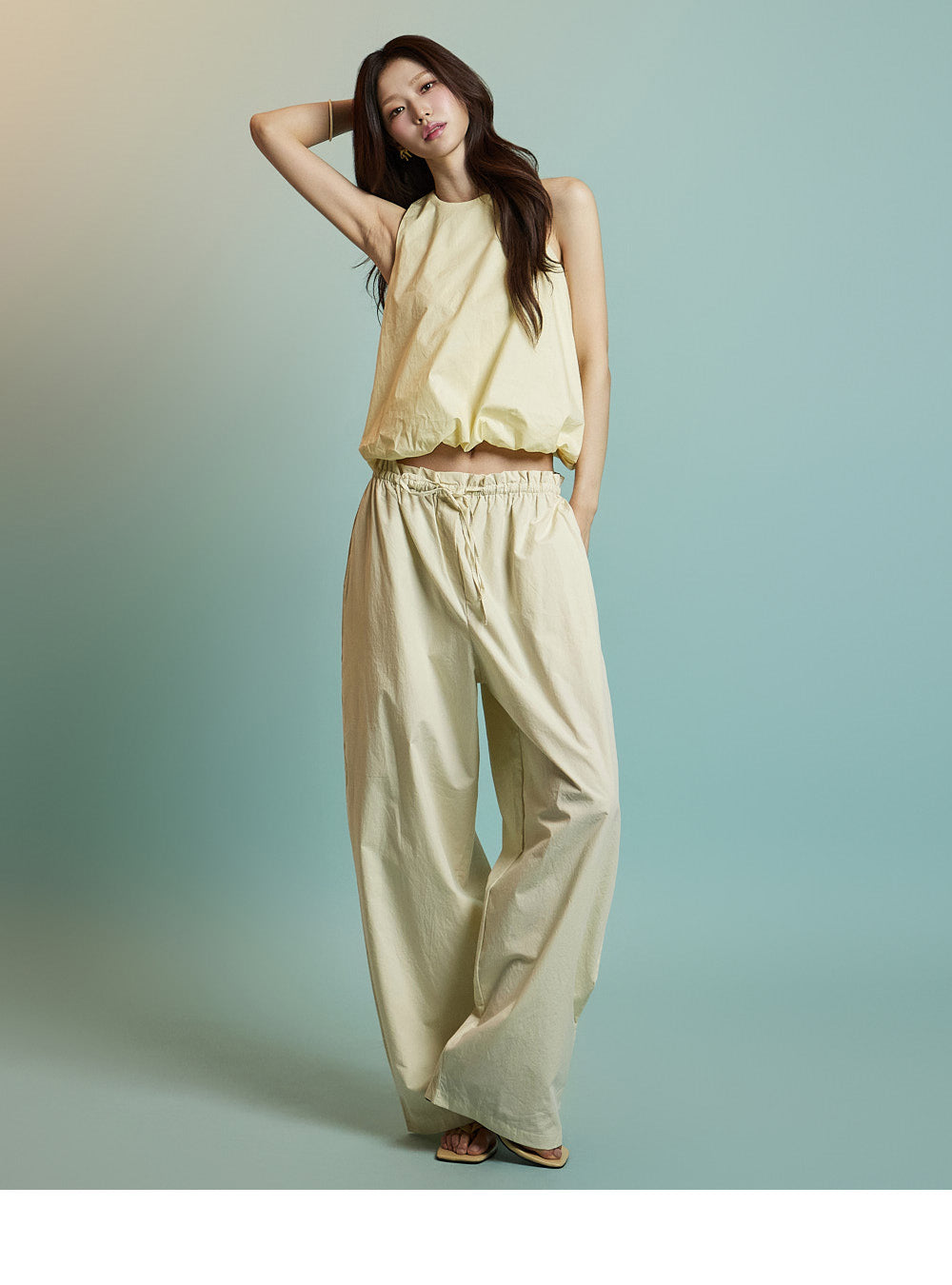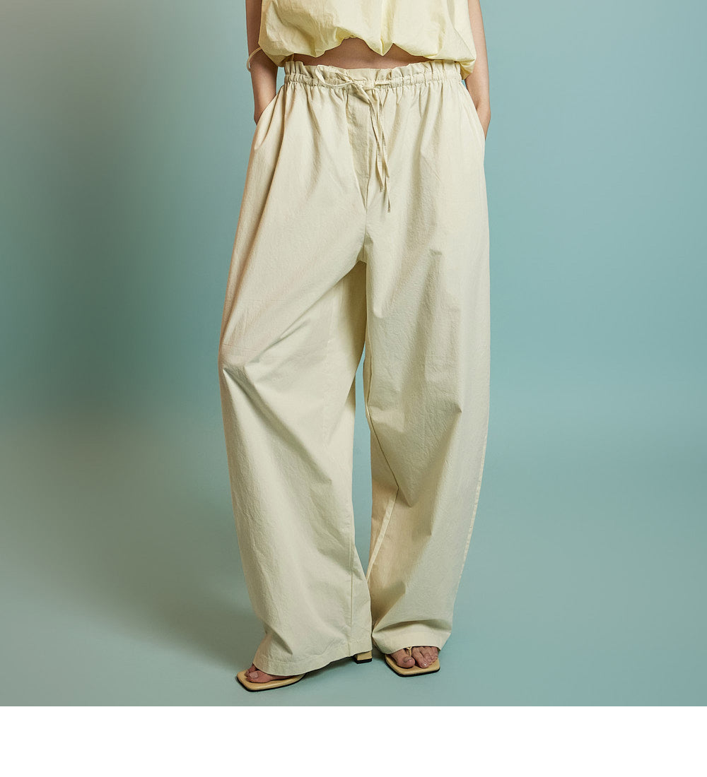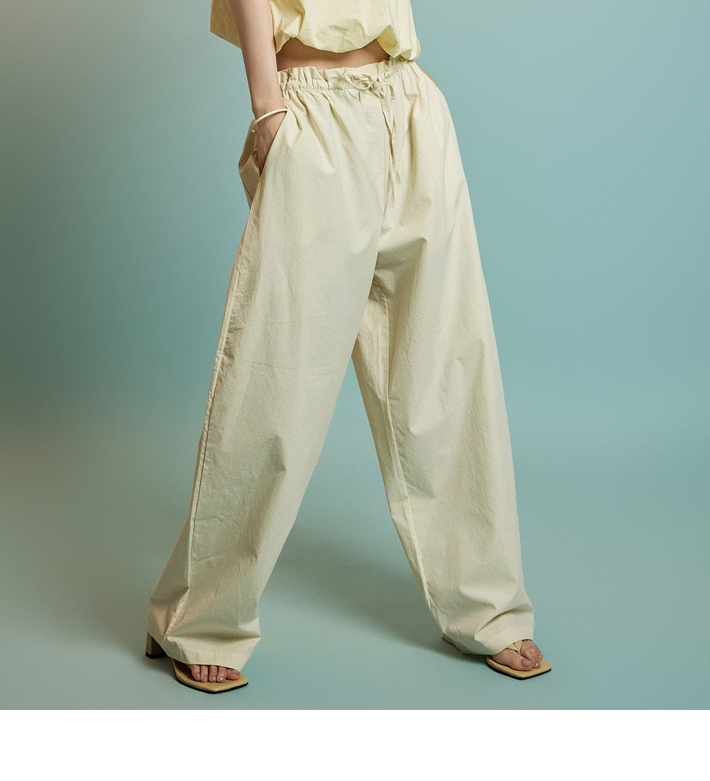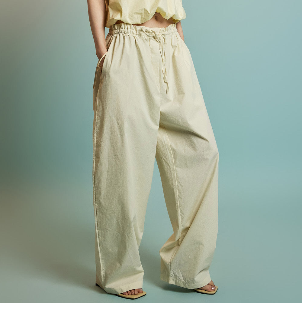 ドローストリングディテールを備えた伸縮性のあるウエストバンドにより、