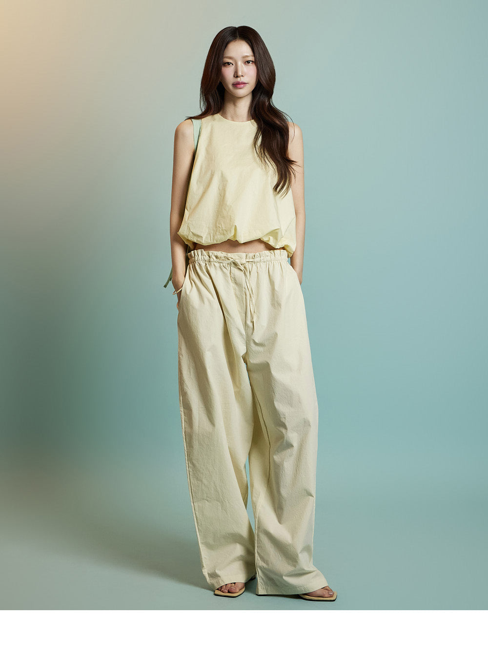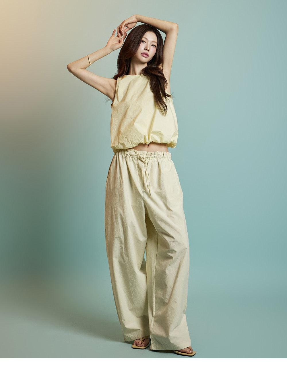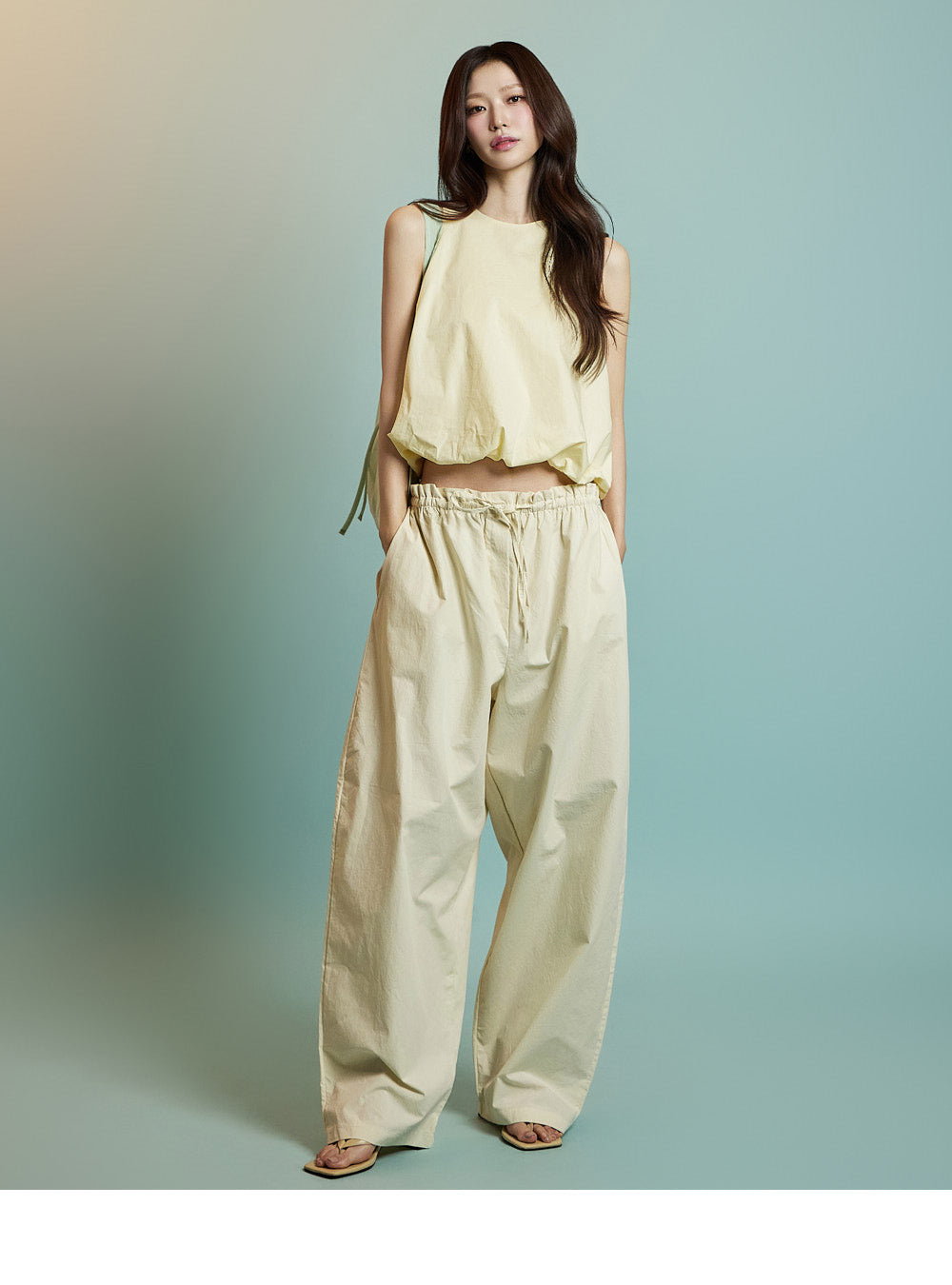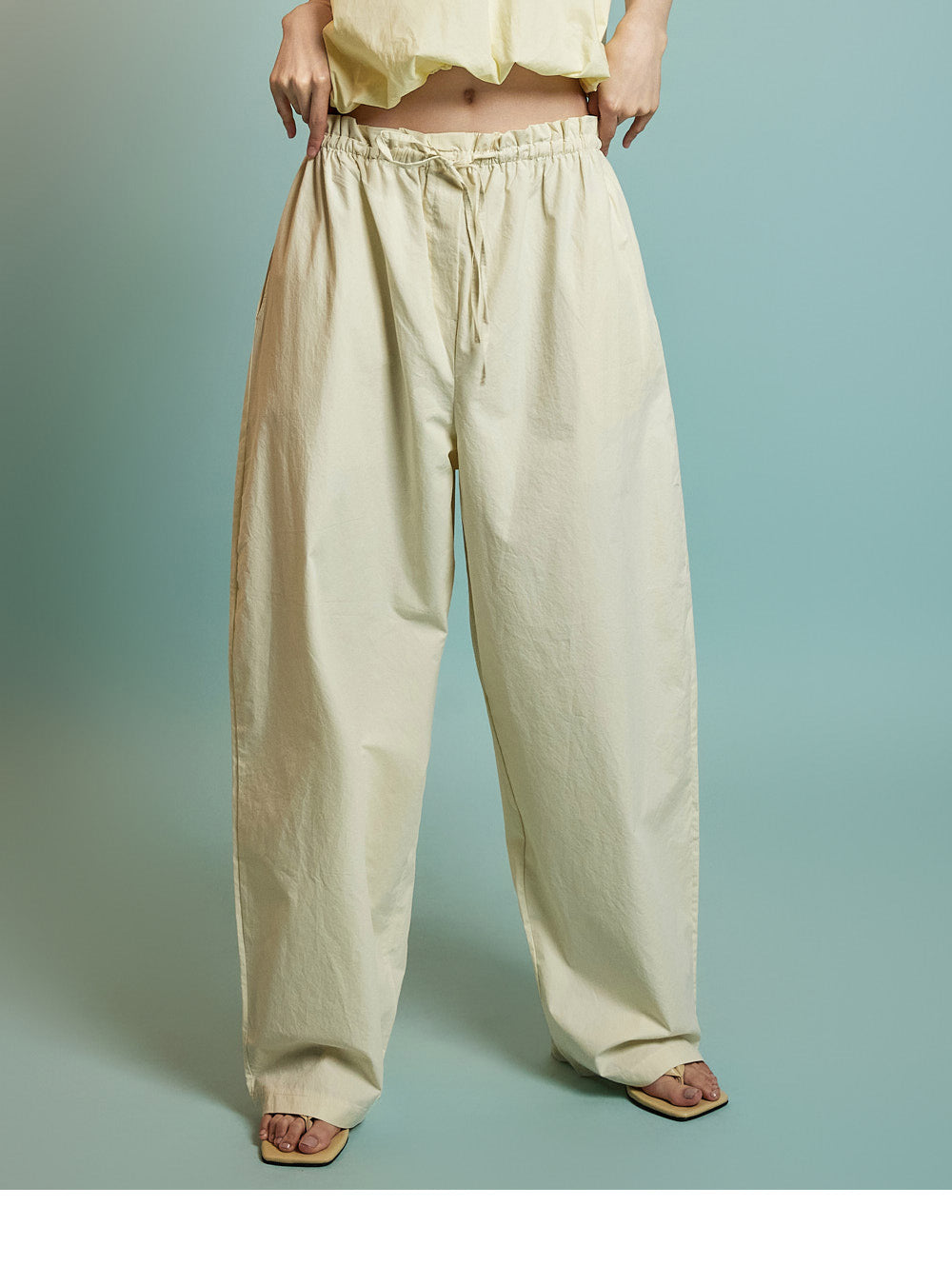 ドローストリングディテールを備えた伸縮性のあるウエストバンドにより、