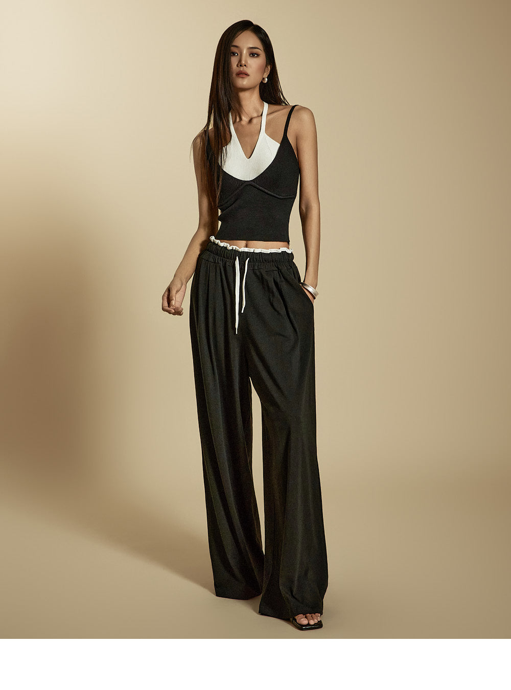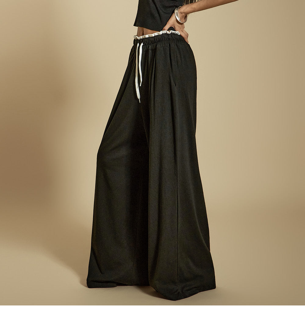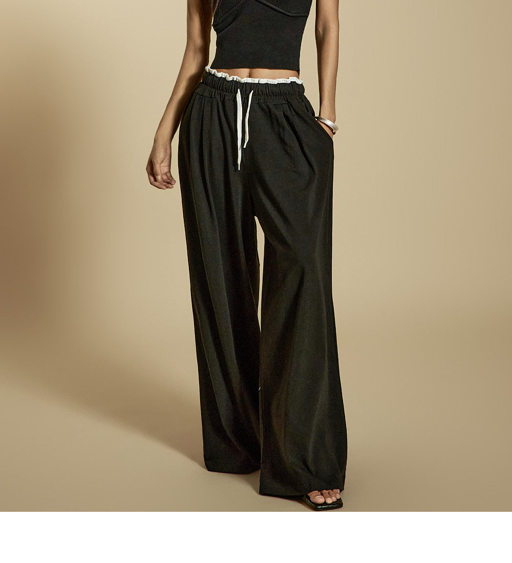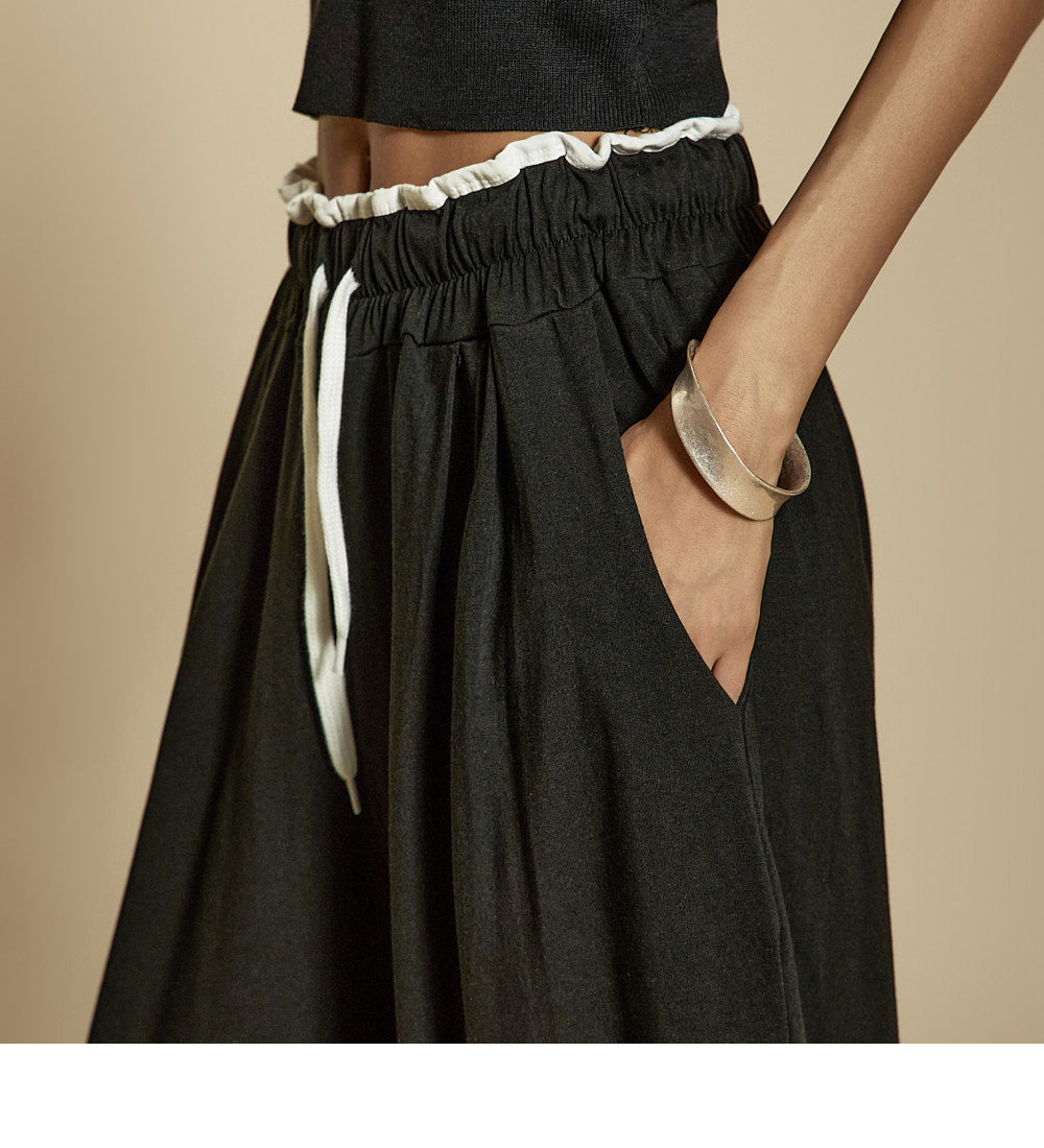 ハイライズのウエストバンドには、フィット感を調節できるドローストリングが付いており、サイドポケットがデザインに実用性を加えています。