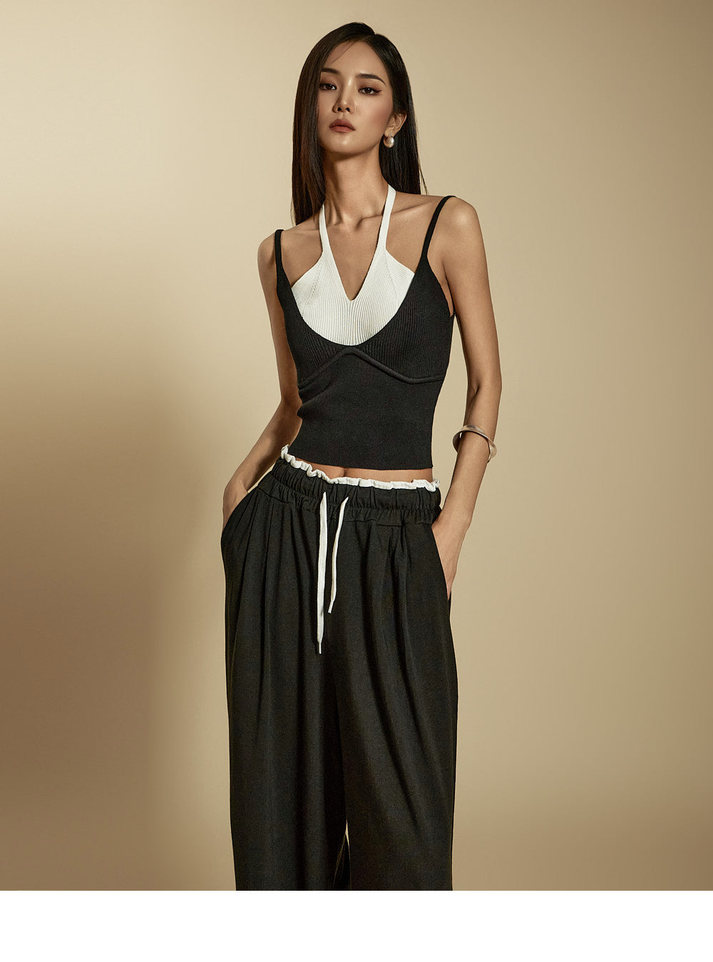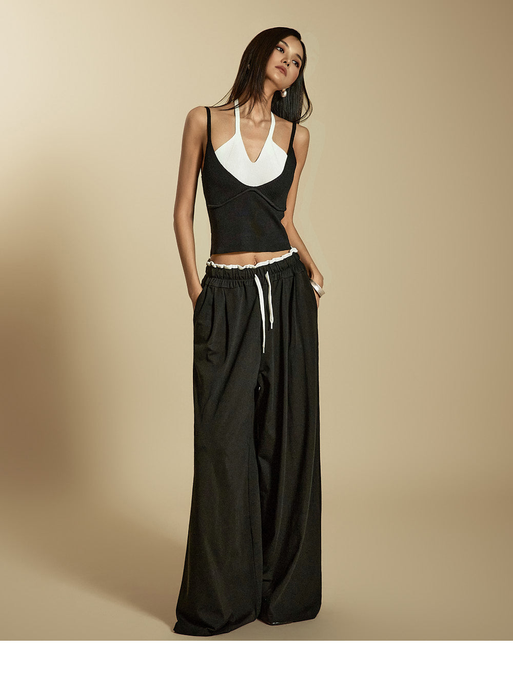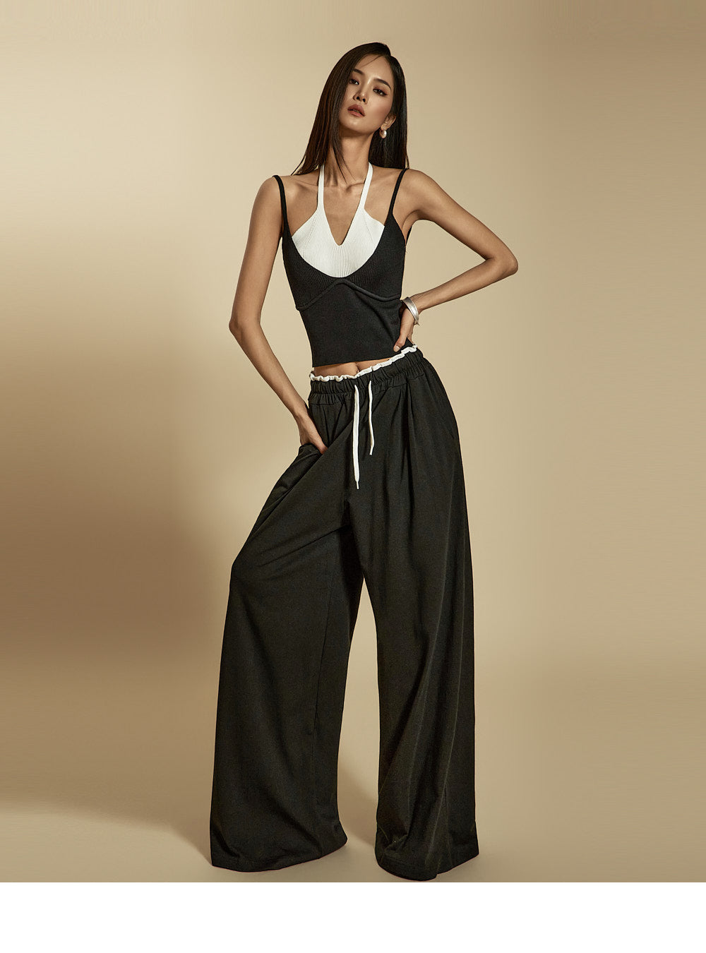 ハイライズのウエストバンドには、フィット感を調節できるドローストリングが付いており、サイドポケットがデザインに実用性を加えています。