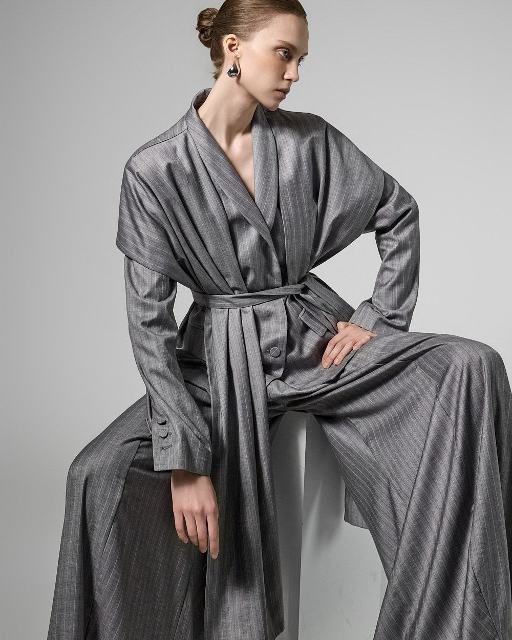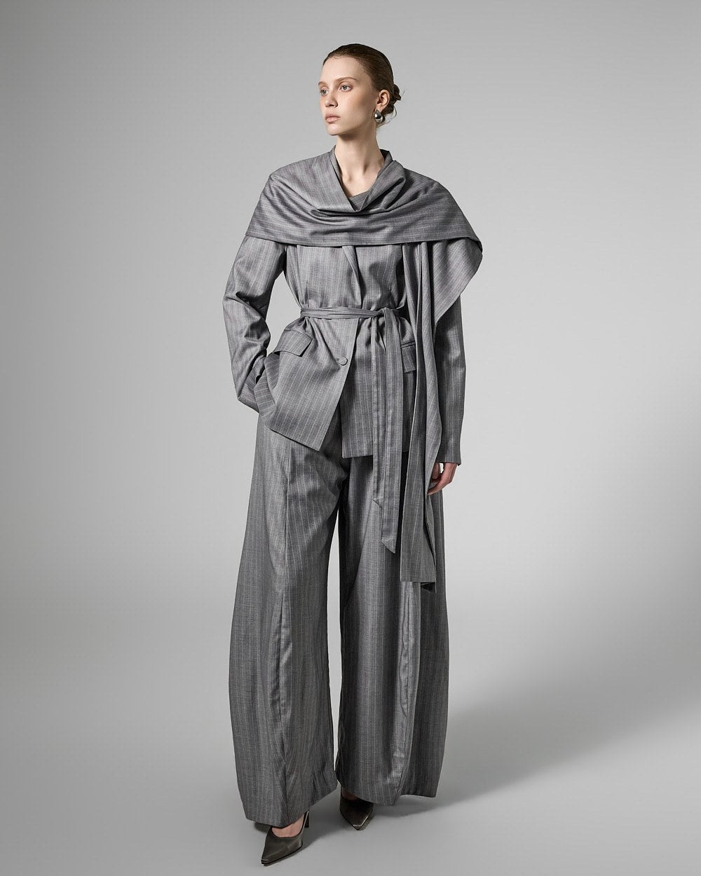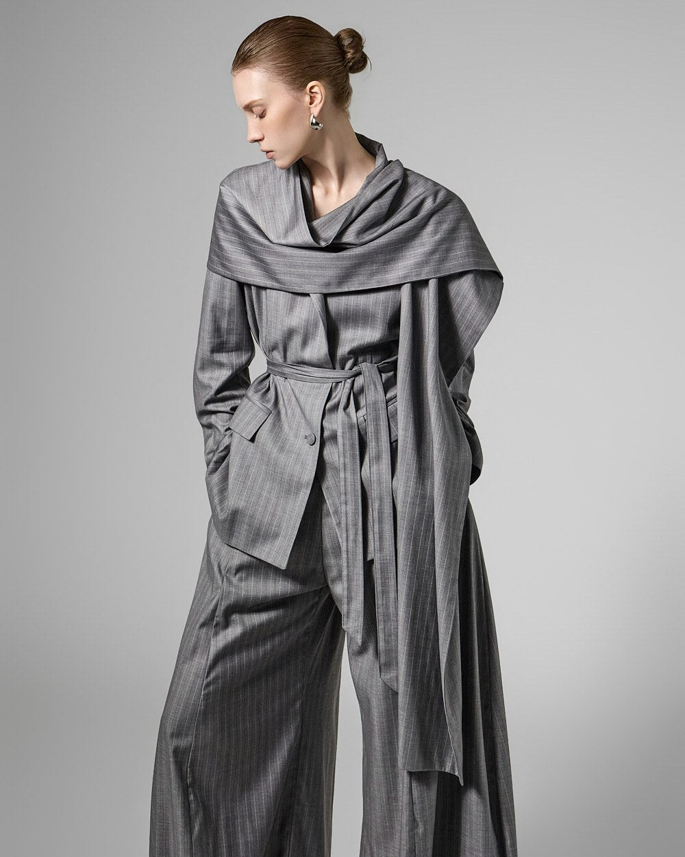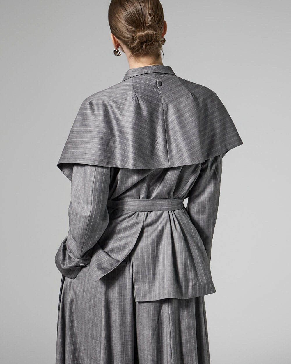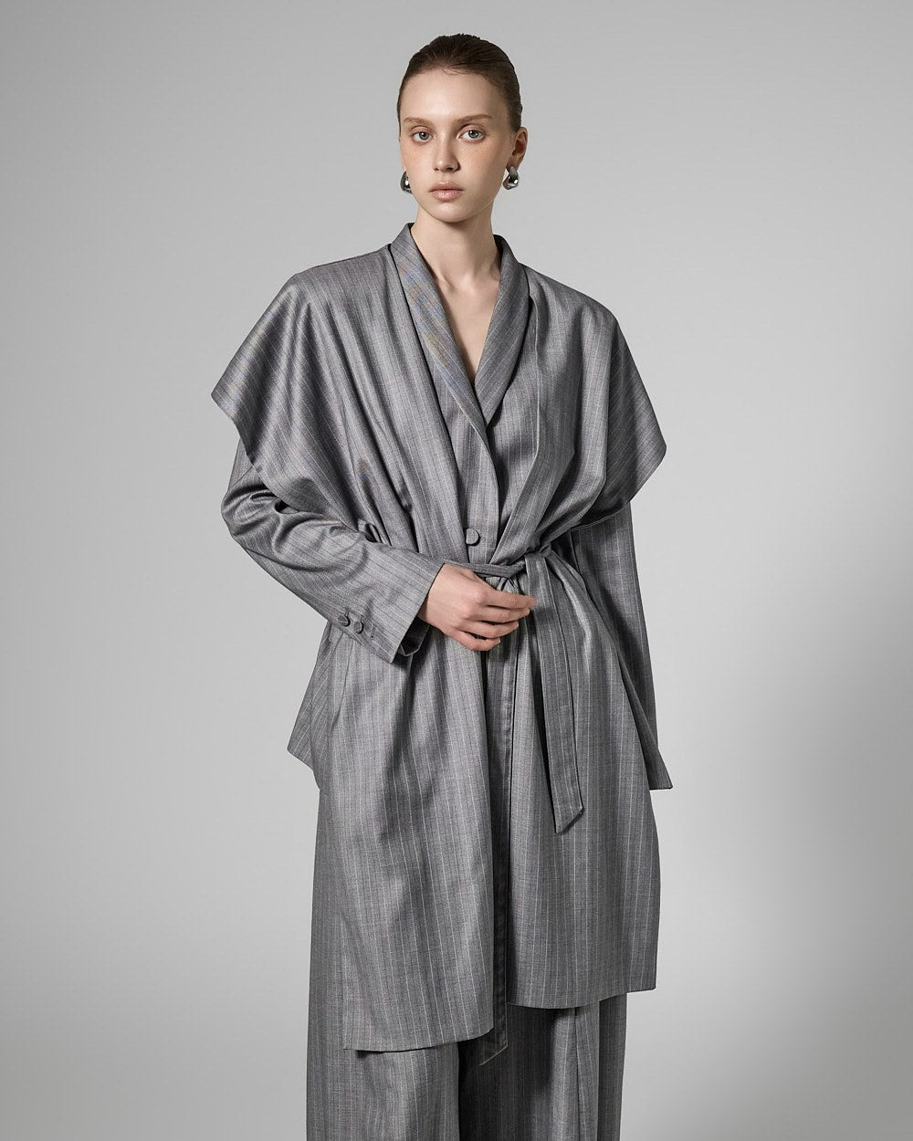 and the striped pattern adds a sophisticated touch to the overall silhouette.