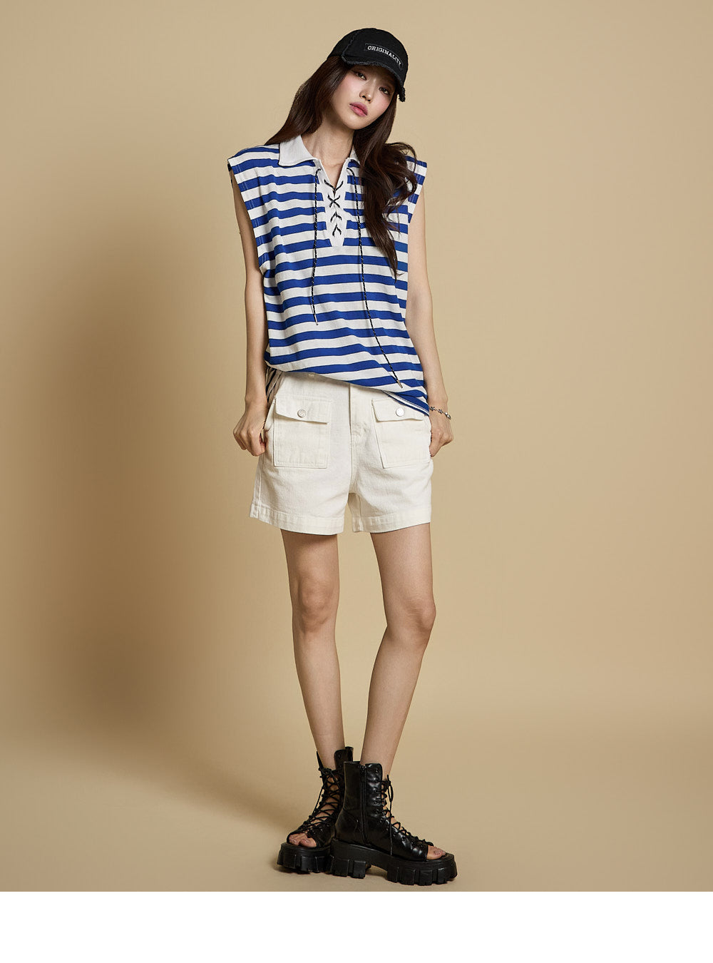 フロントのフラップポケットのディテールがカジュアルでありながらユニークなタッチを加えています。