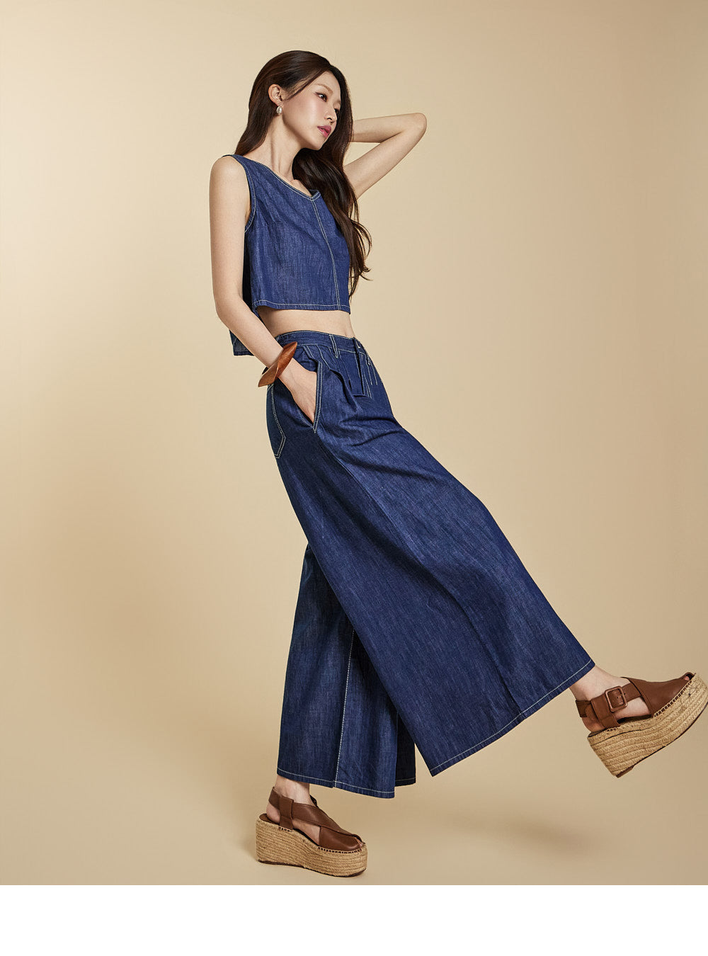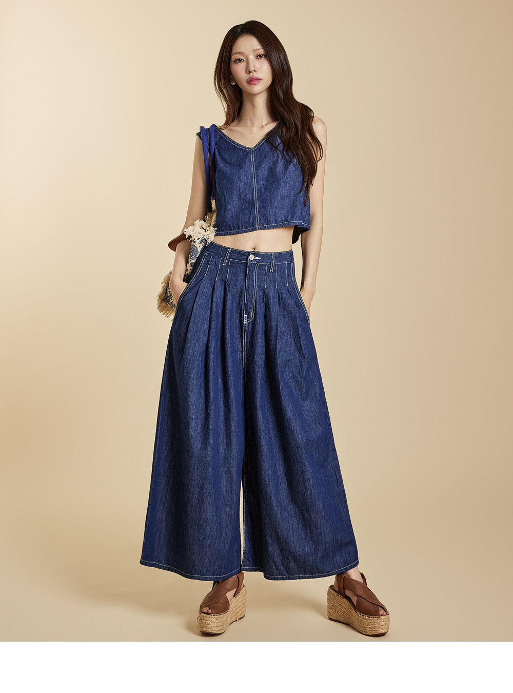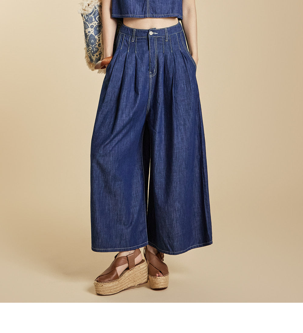 カジュアルスタイルのプリーツワイドレッグデニムパンツ