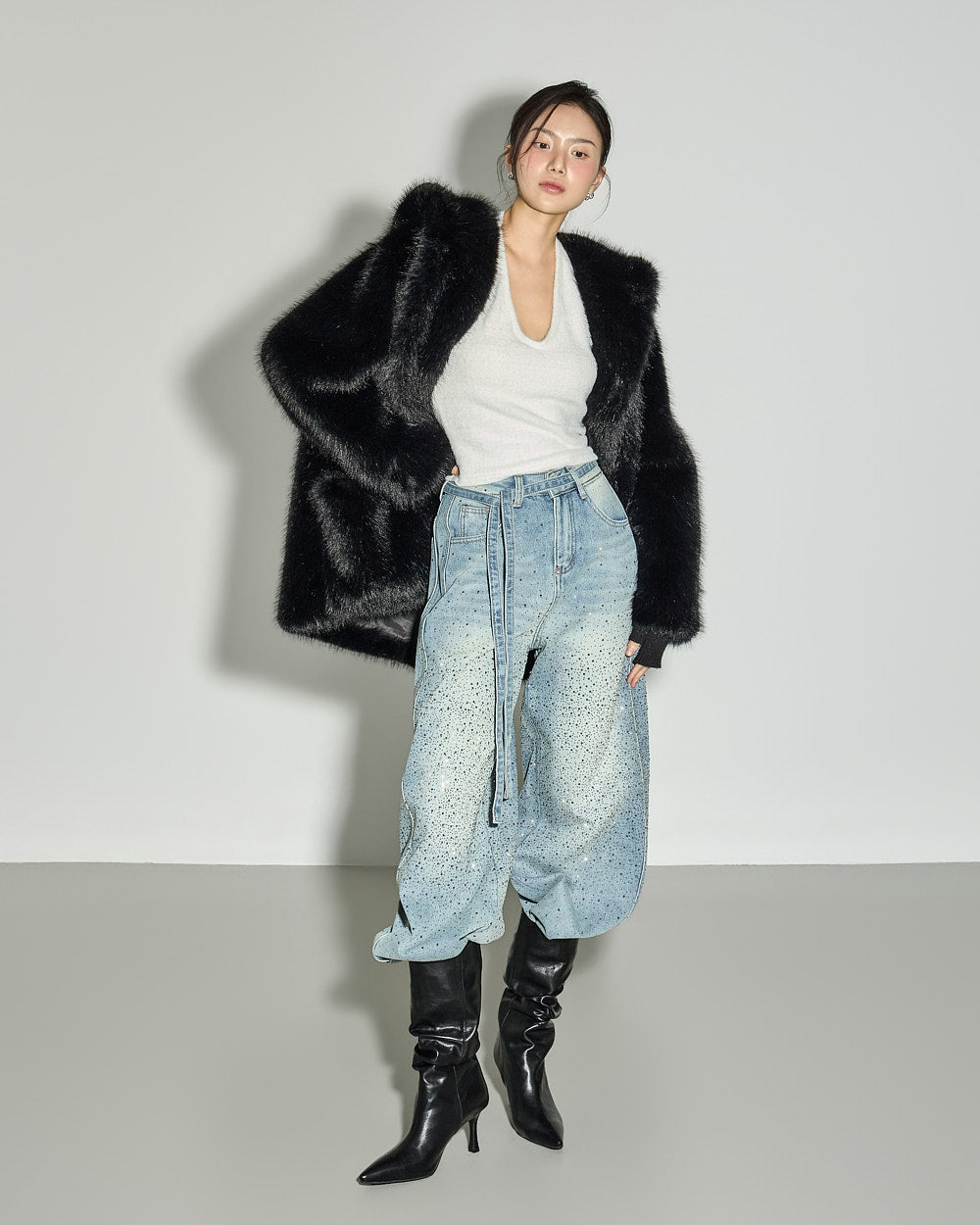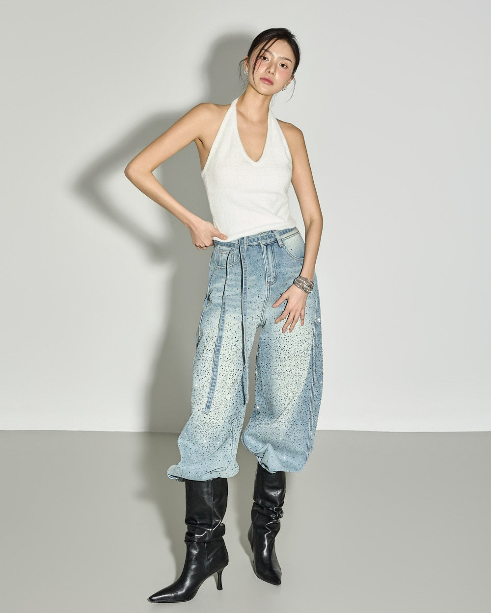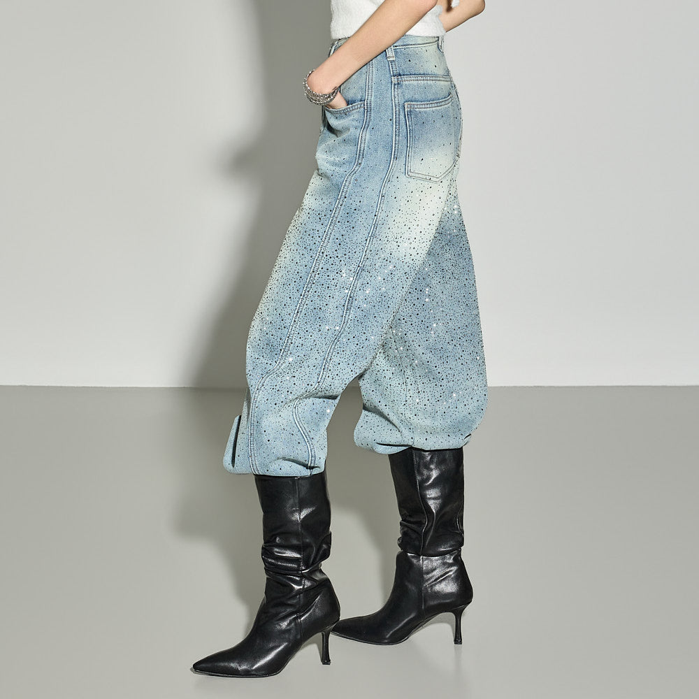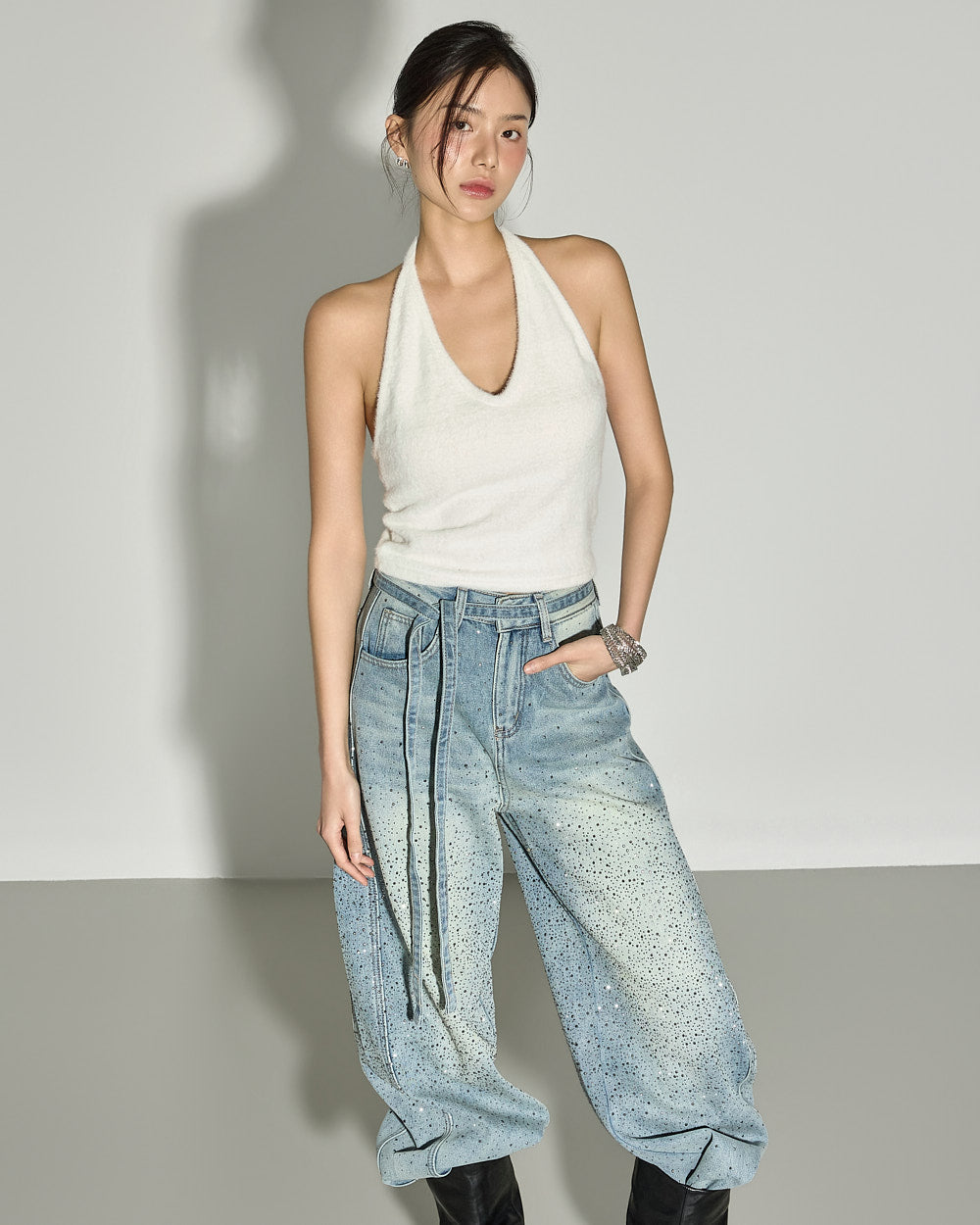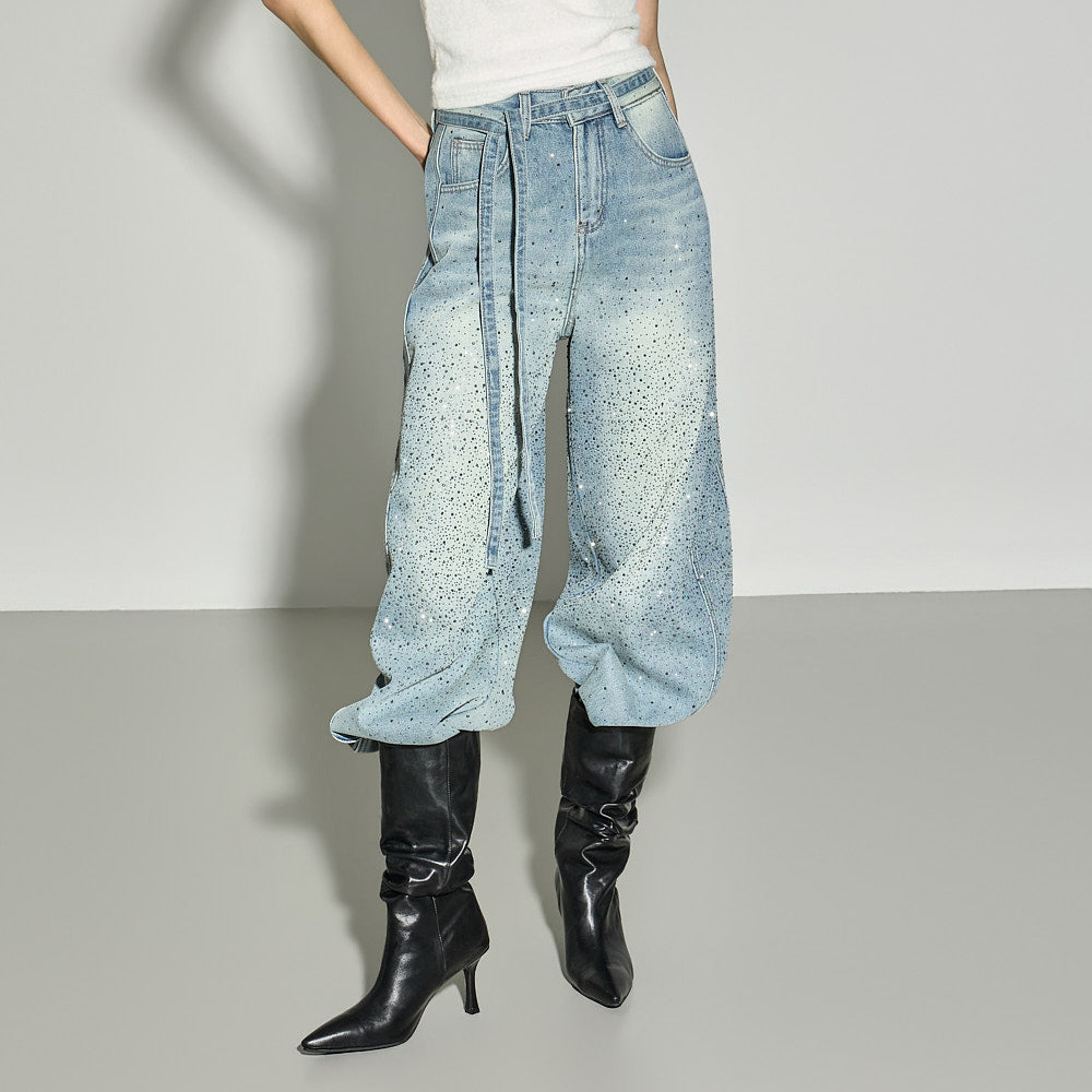 These strap set studded jeans offer a unique style.
