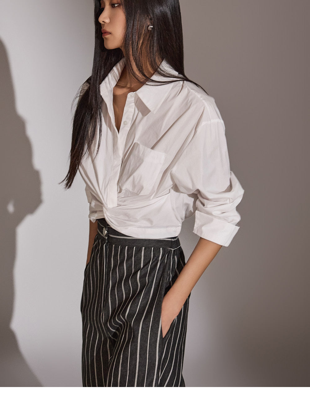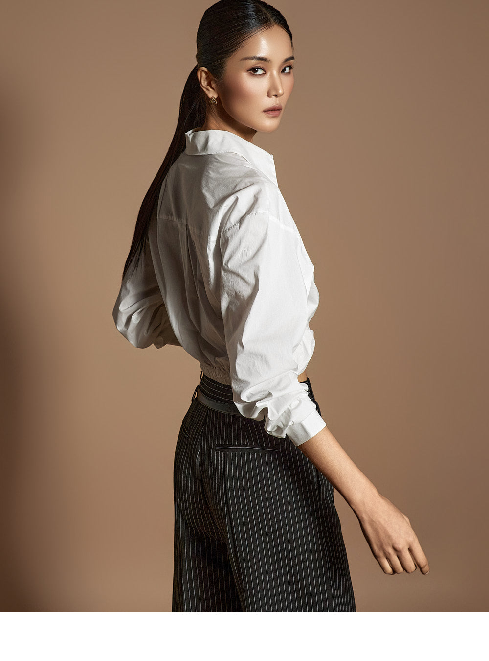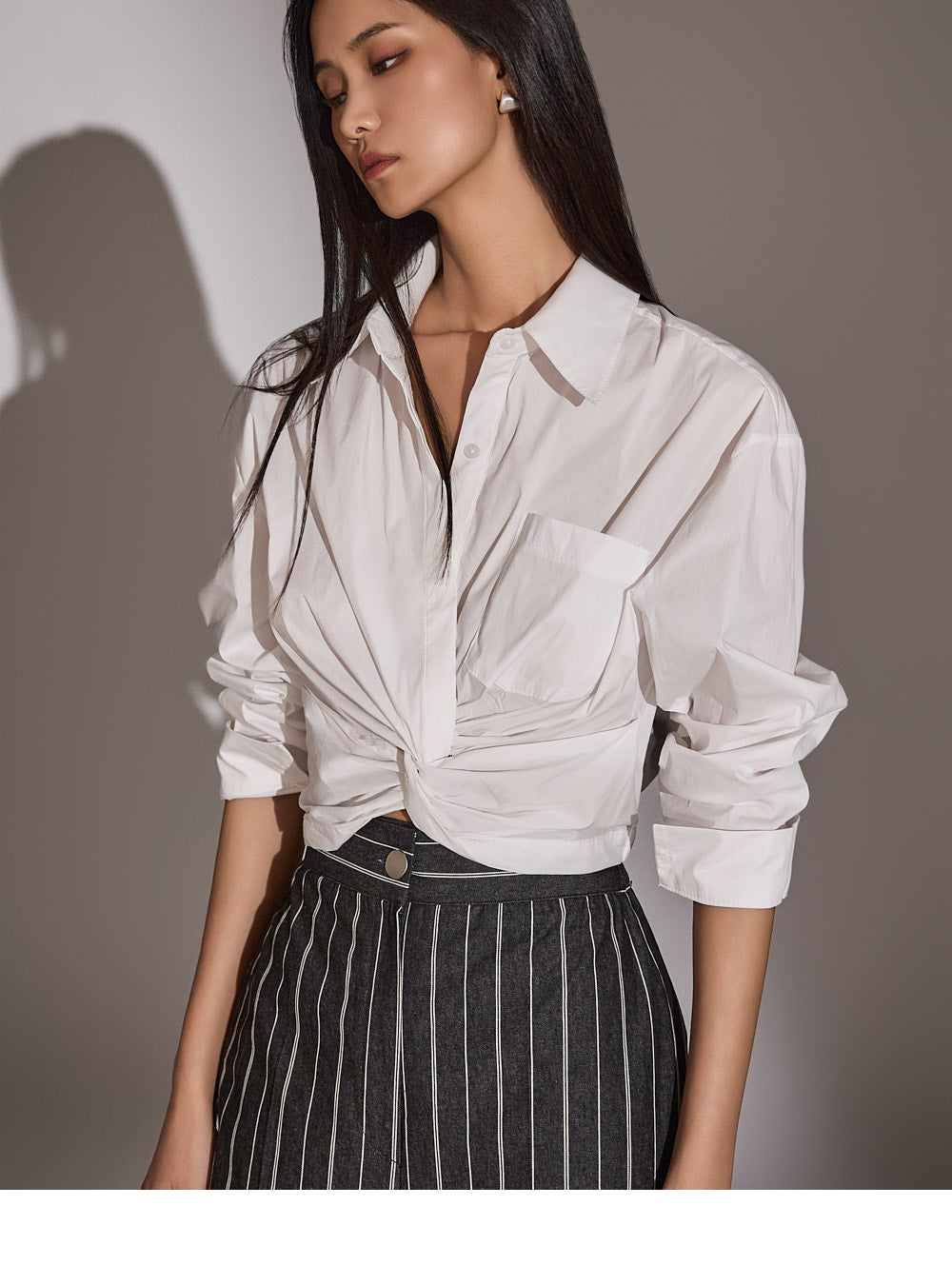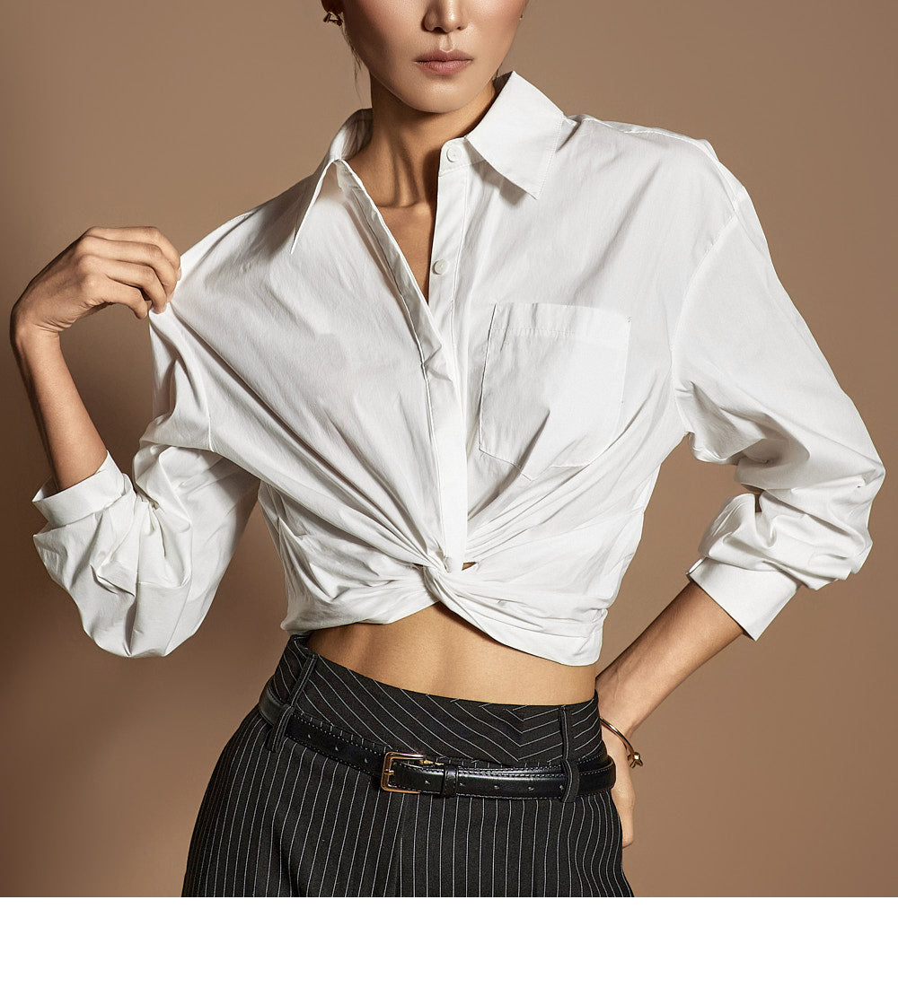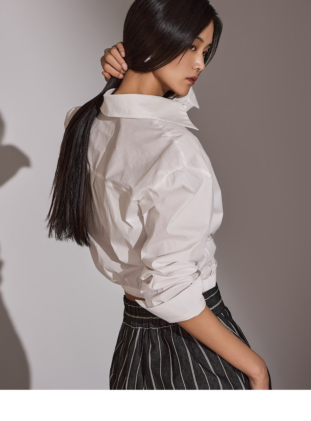 このシャツは、トレンド感のあるクロップド丈にスタイリングされています。