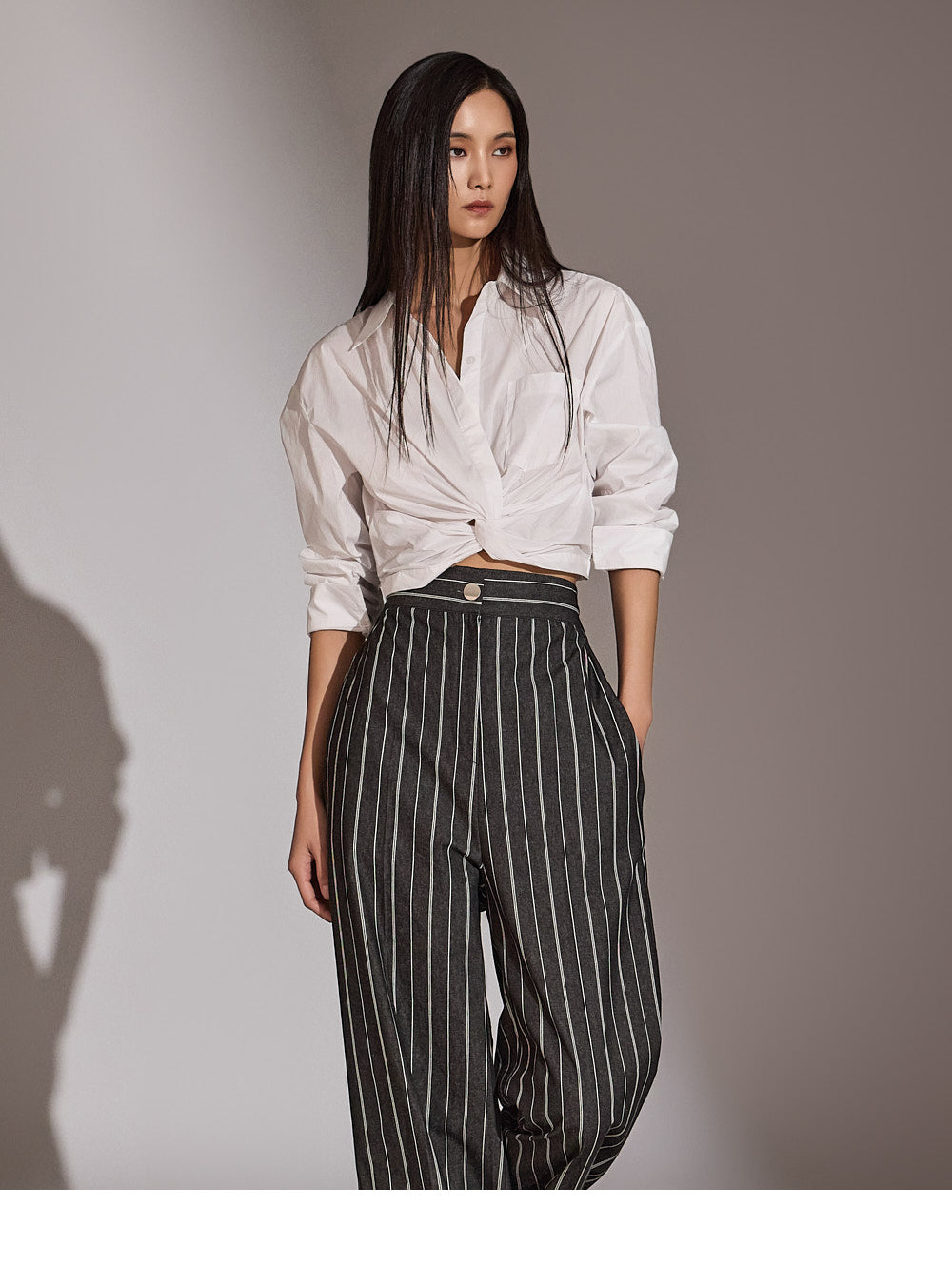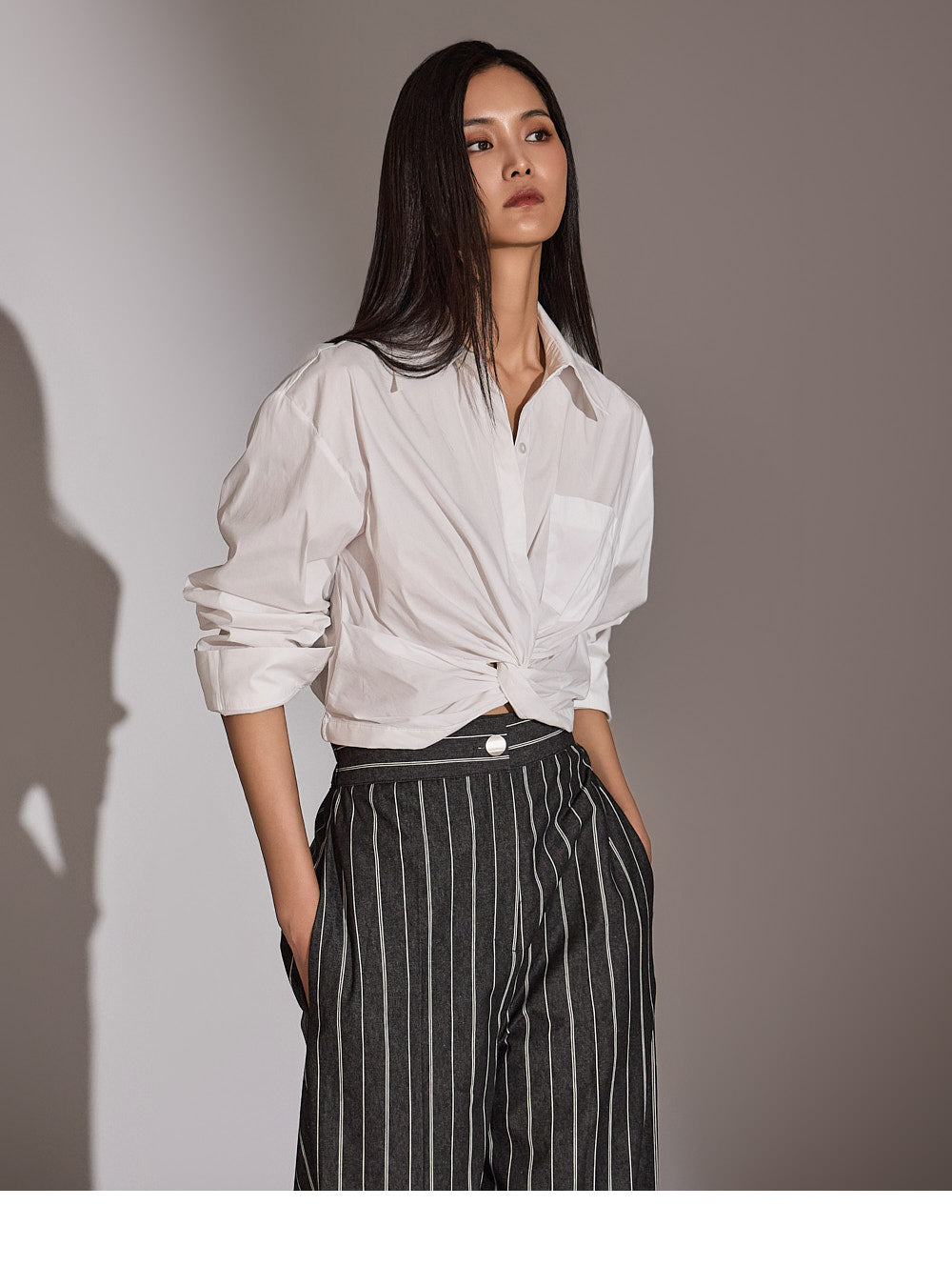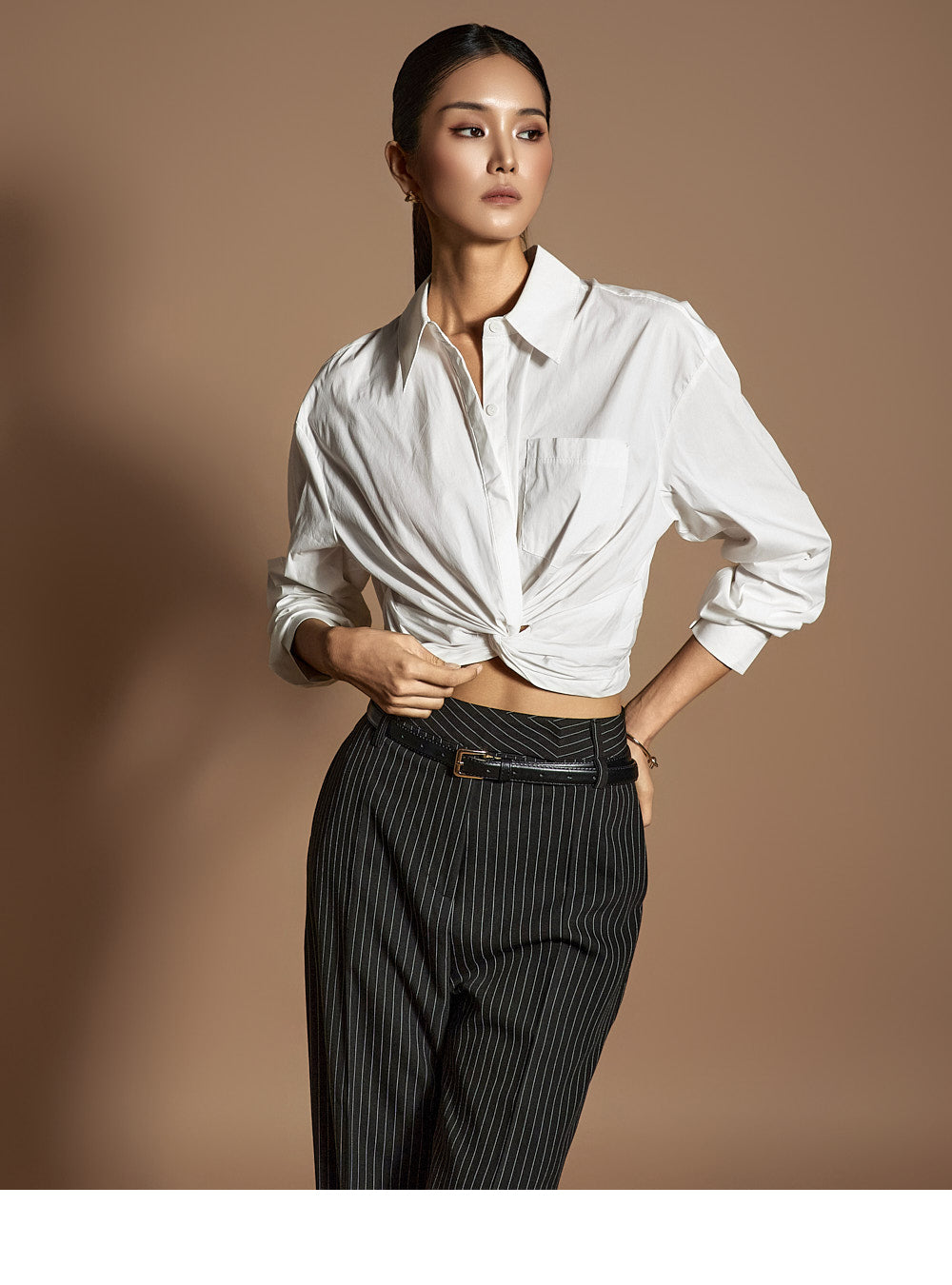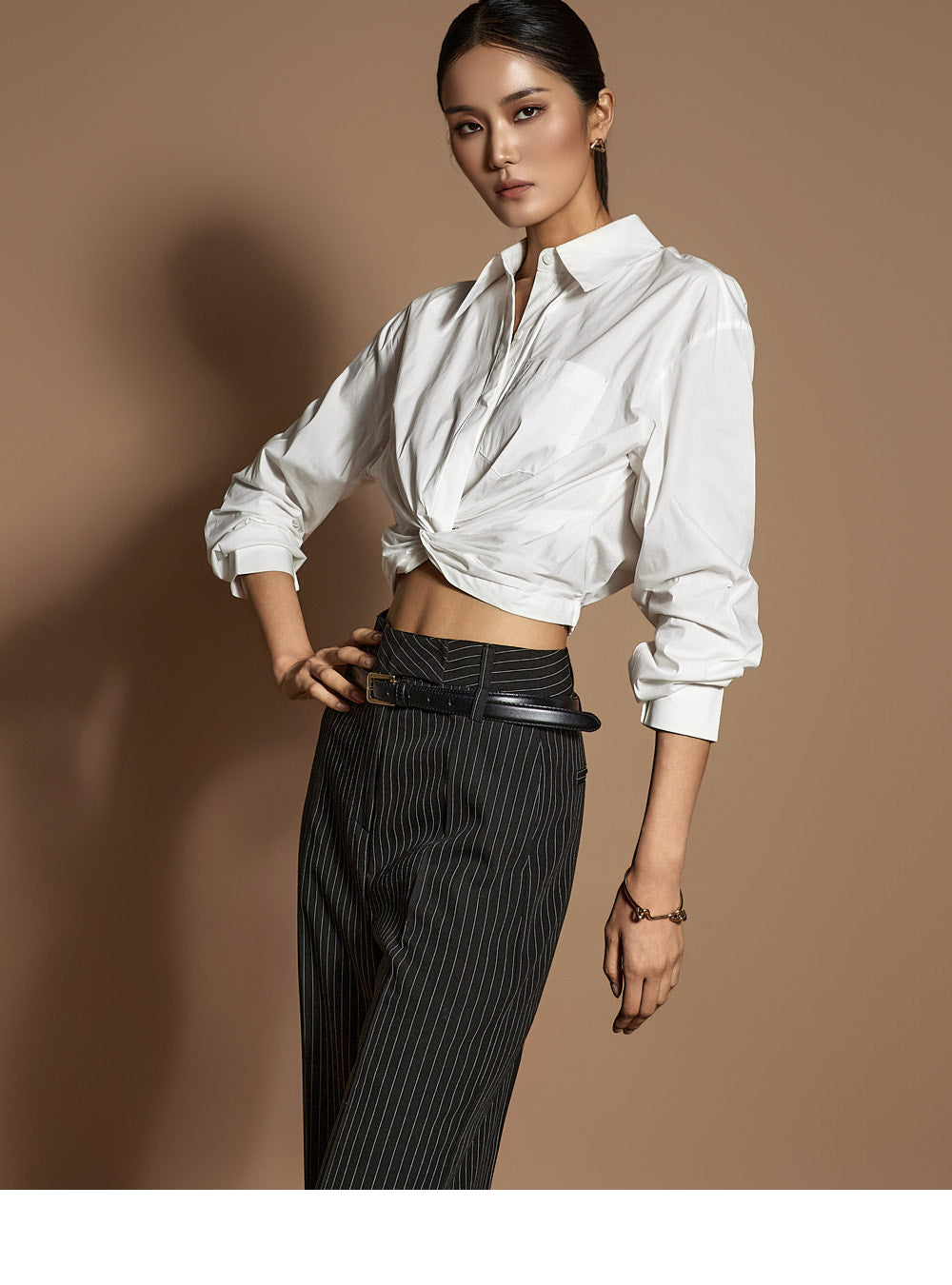 このシャツは、トレンド感のあるクロップド丈にスタイリングされています。