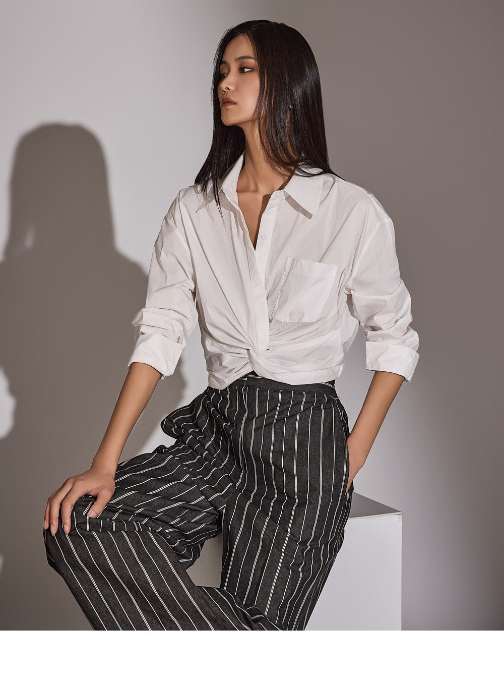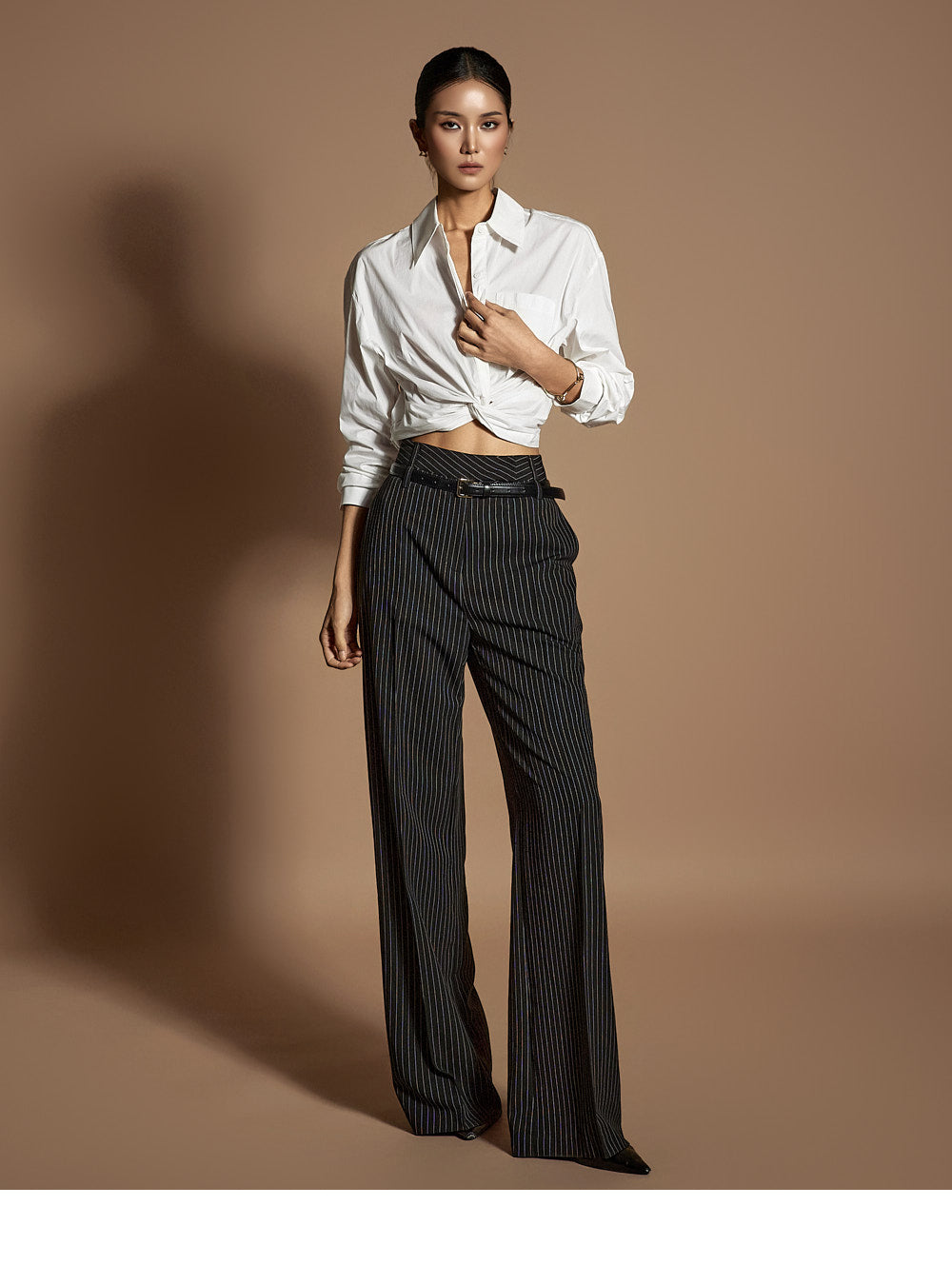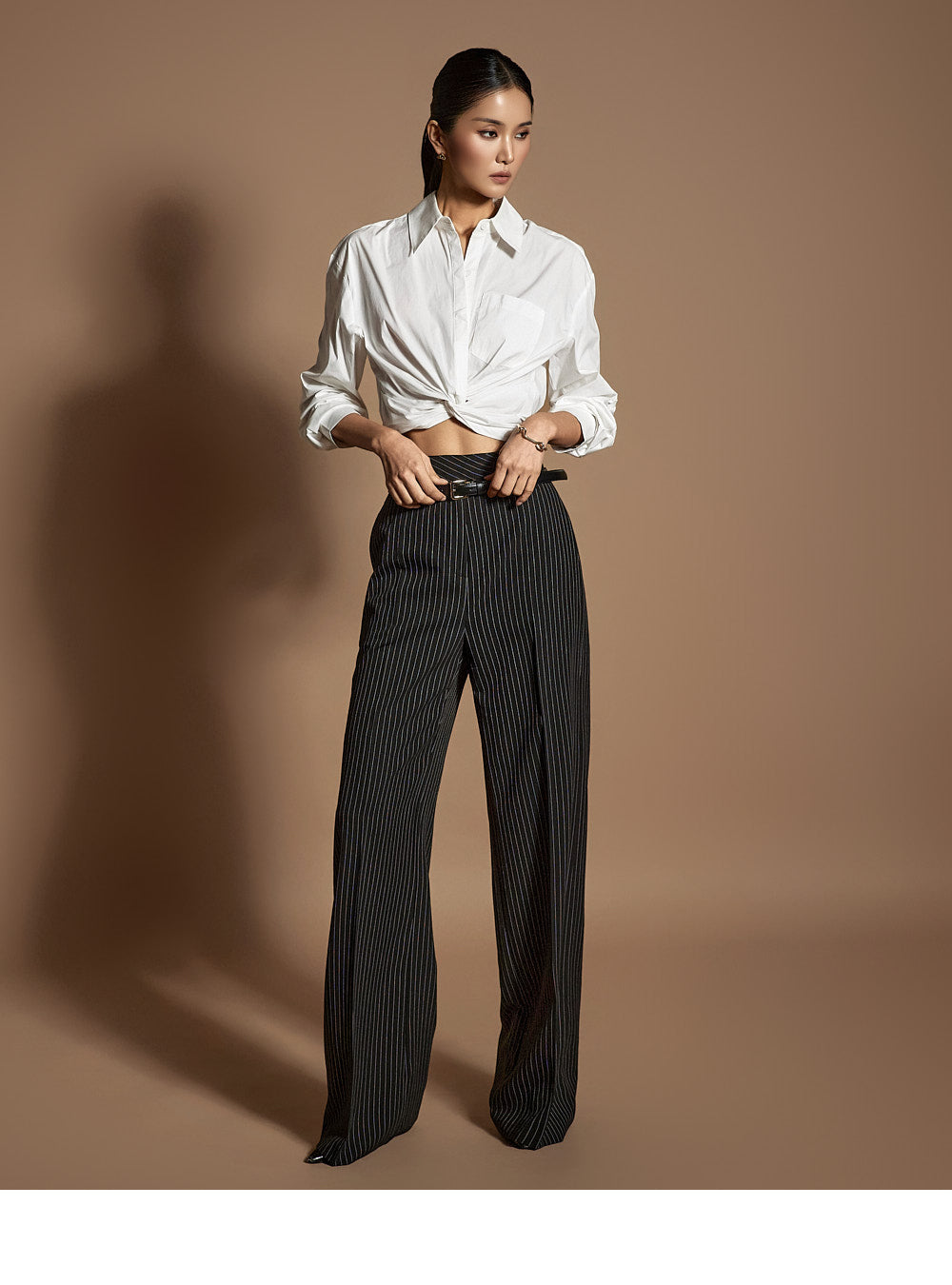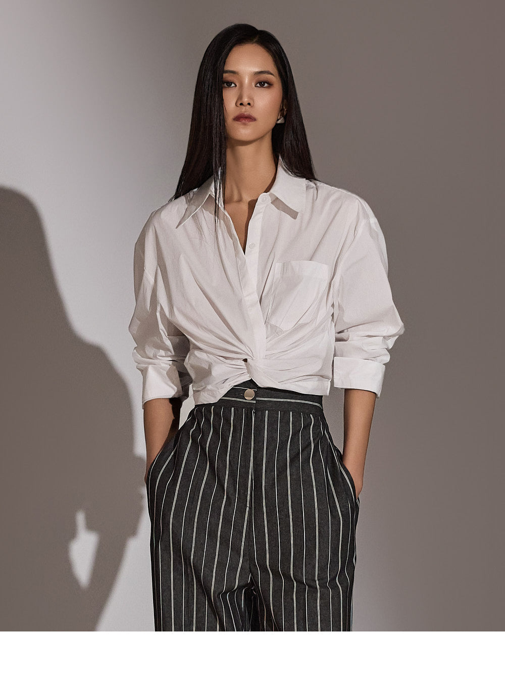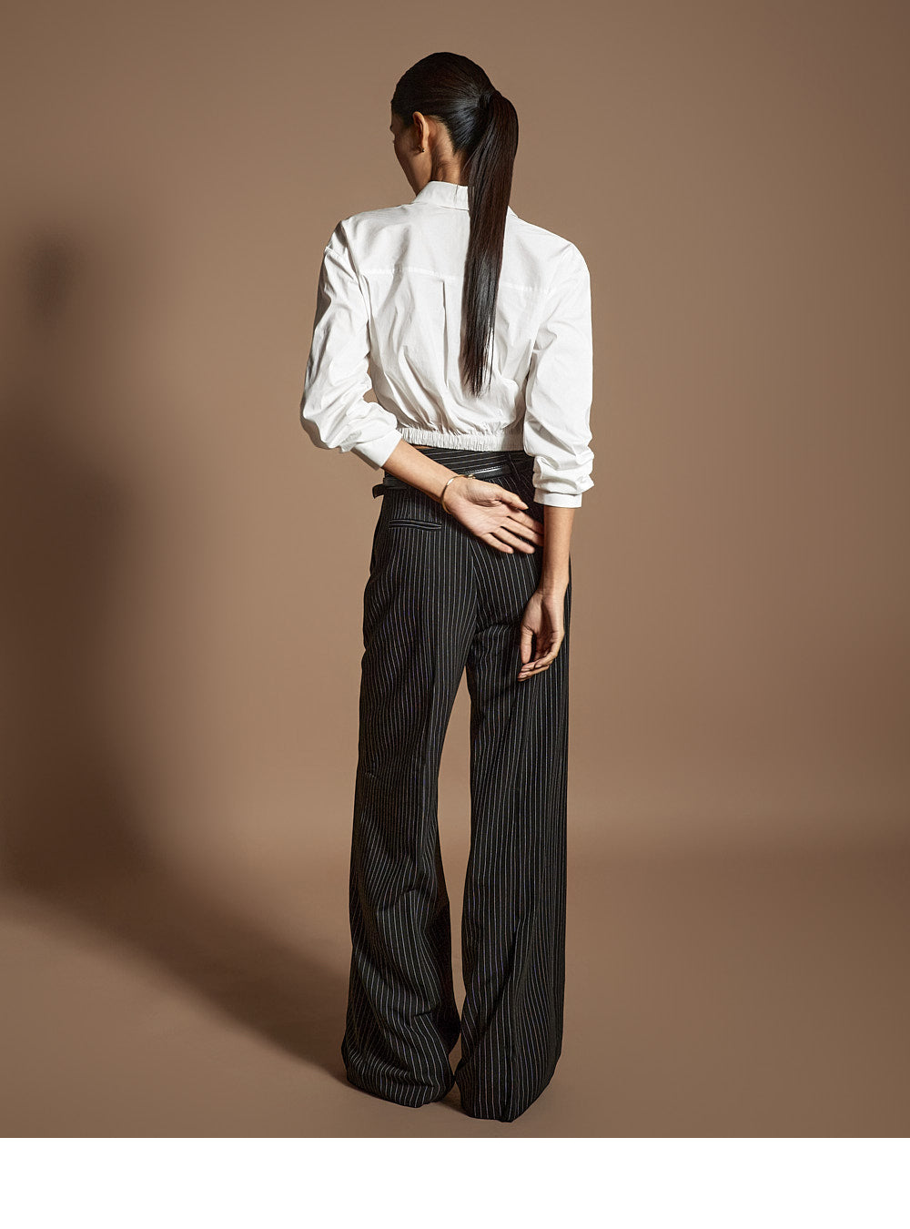 このシャツは、トレンド感のあるクロップド丈にスタイリングされています。