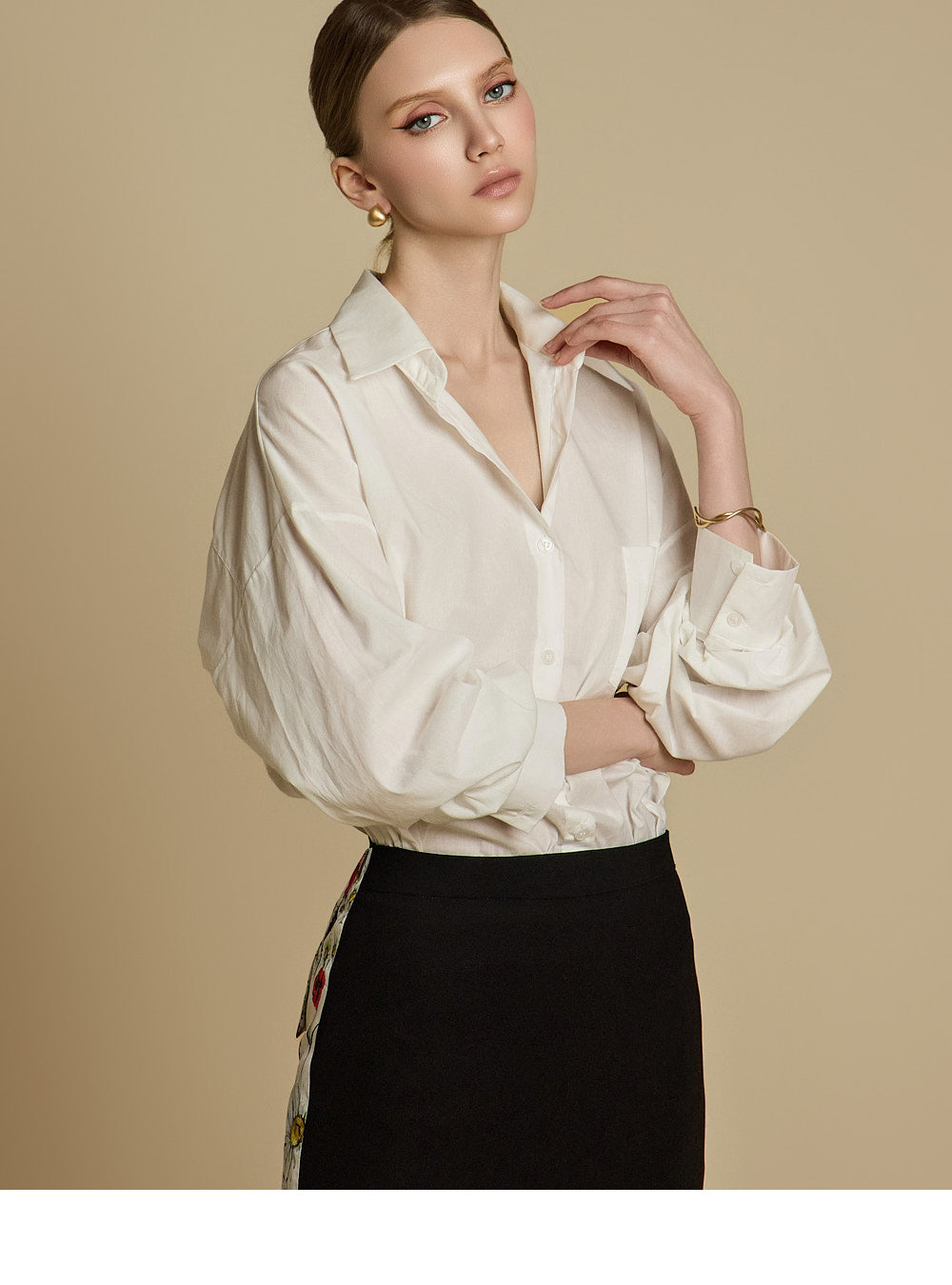 フロントボタン留めと袖ボタンのディテールがすっきりとした仕上がりになっています。