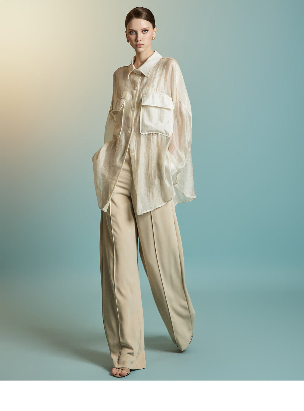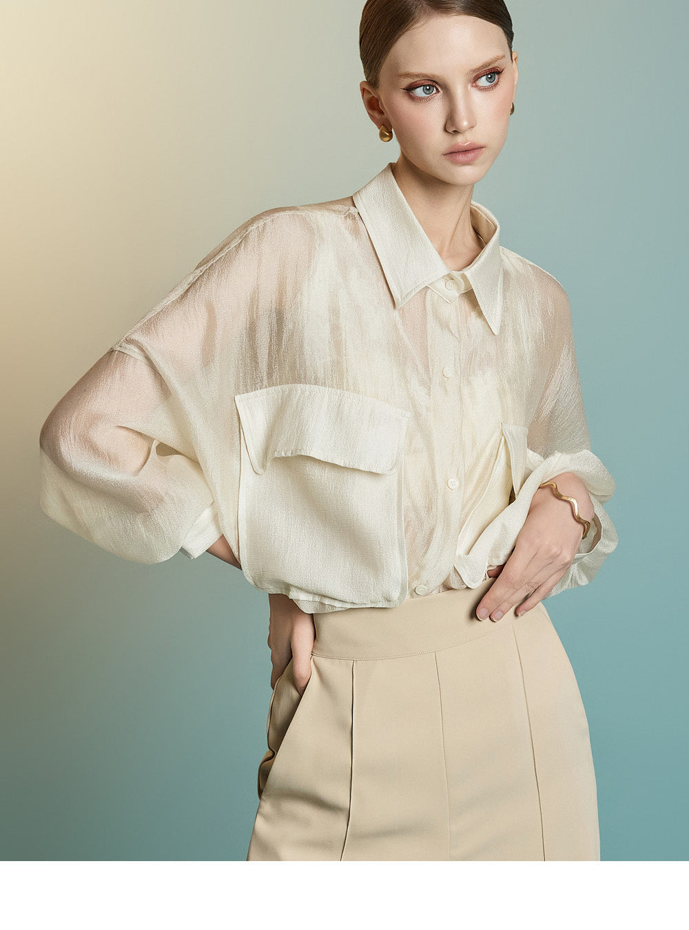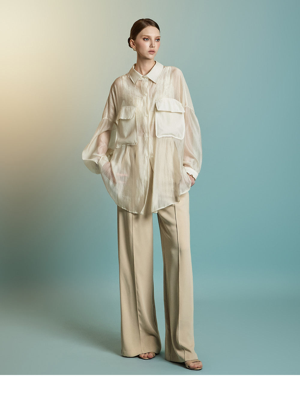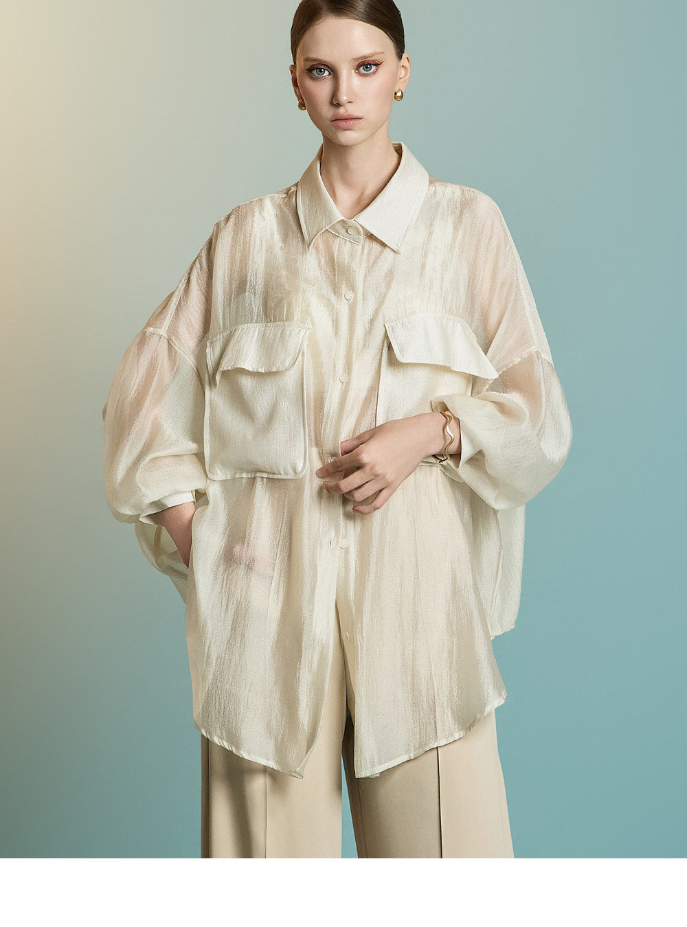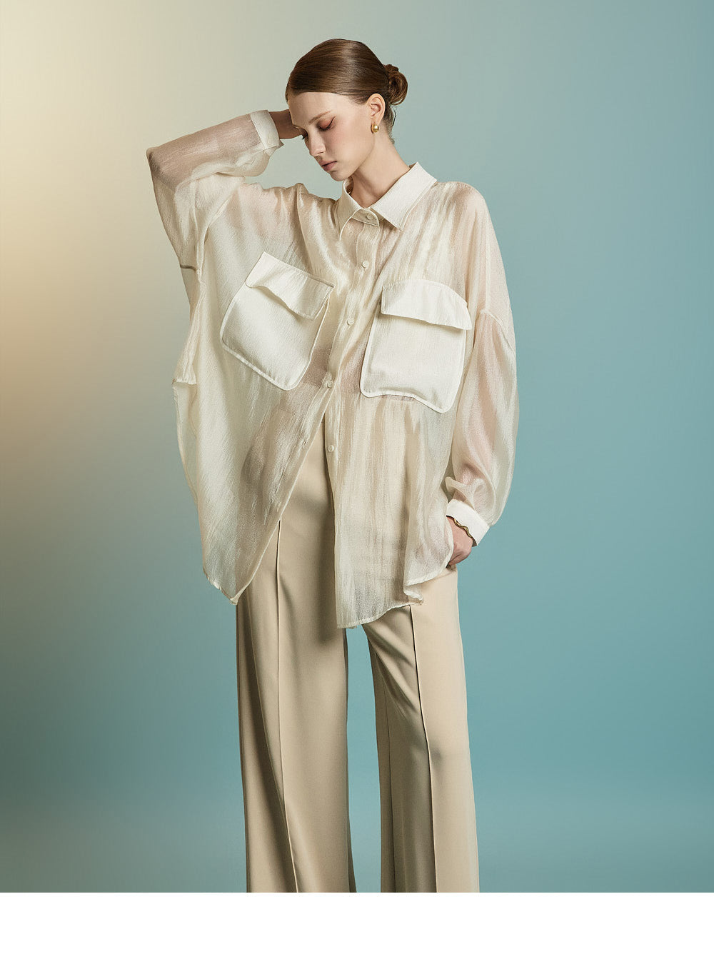 この透け感のあるオーバーサイズのシャツは、カジュアルでリラックスした雰囲気を醸し出します。