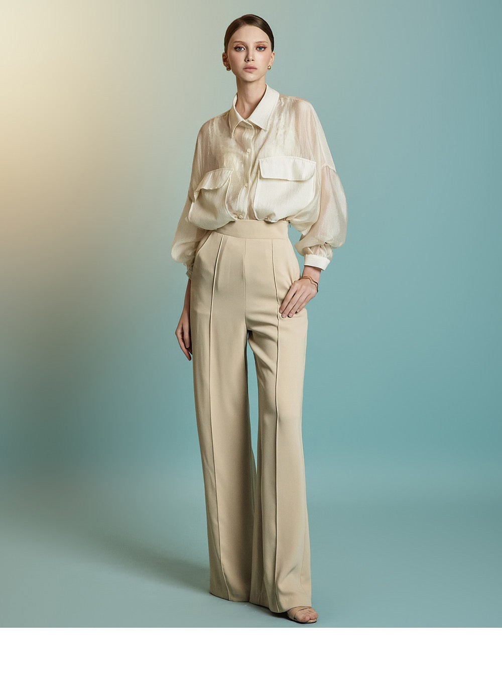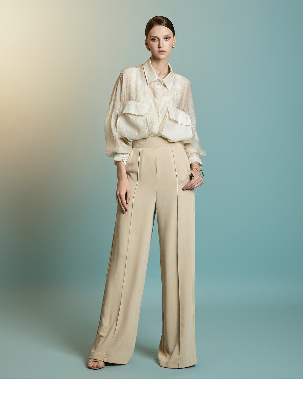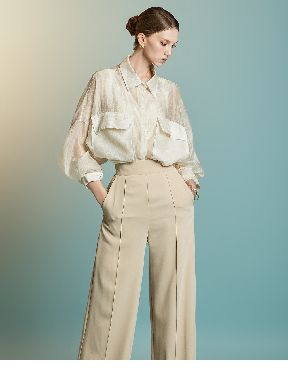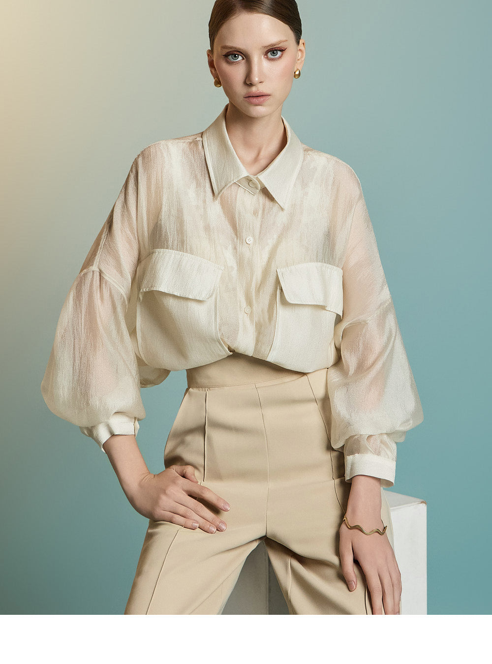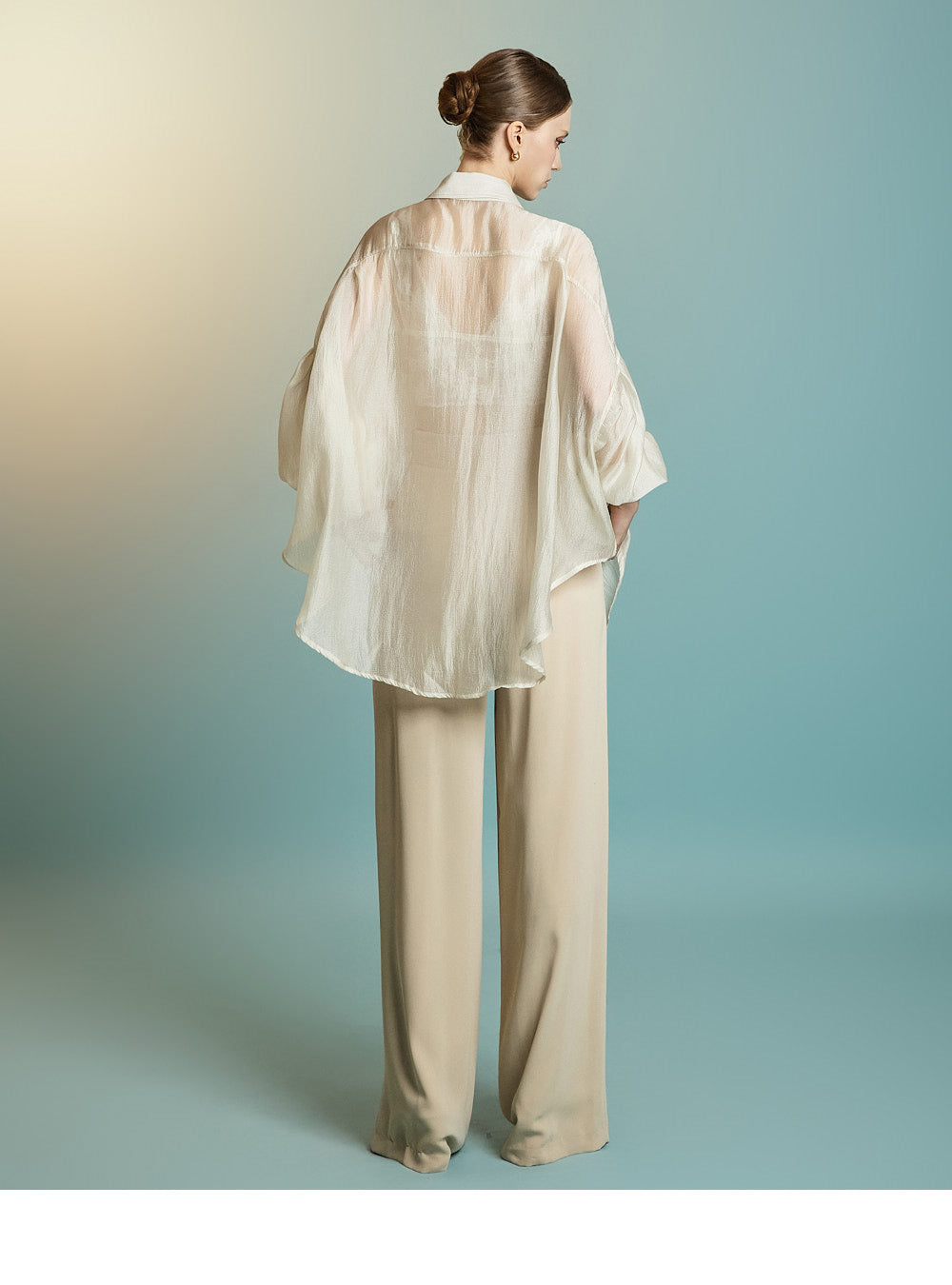 この透け感のあるオーバーサイズのシャツは、カジュアルでリラックスした雰囲気を醸し出します。