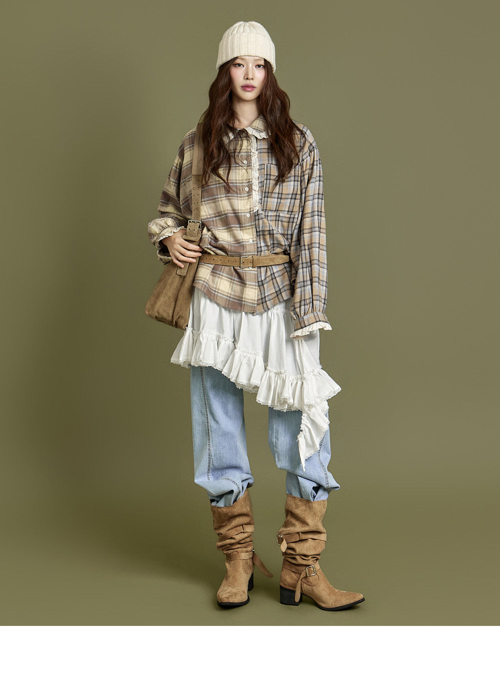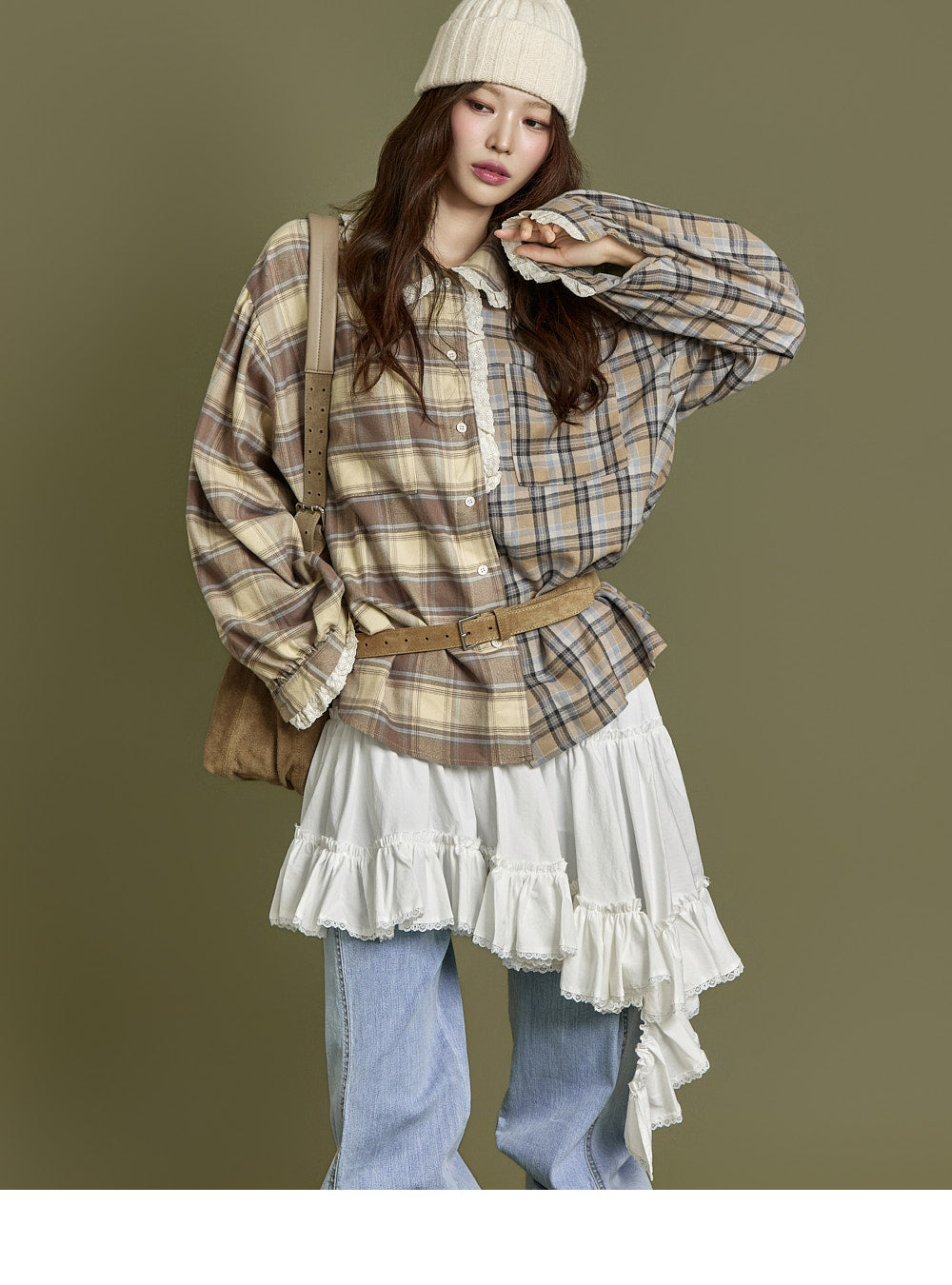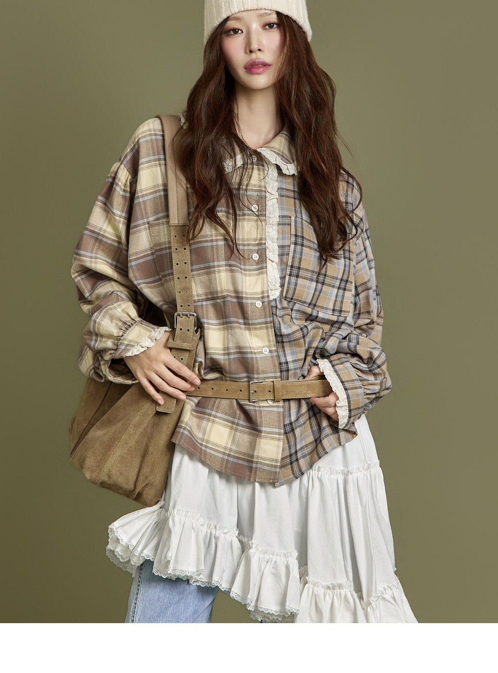 This check lace shirt exudes a casual vibe.