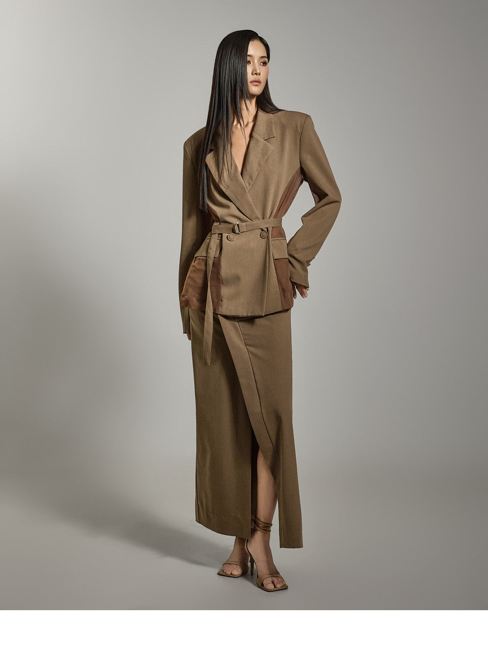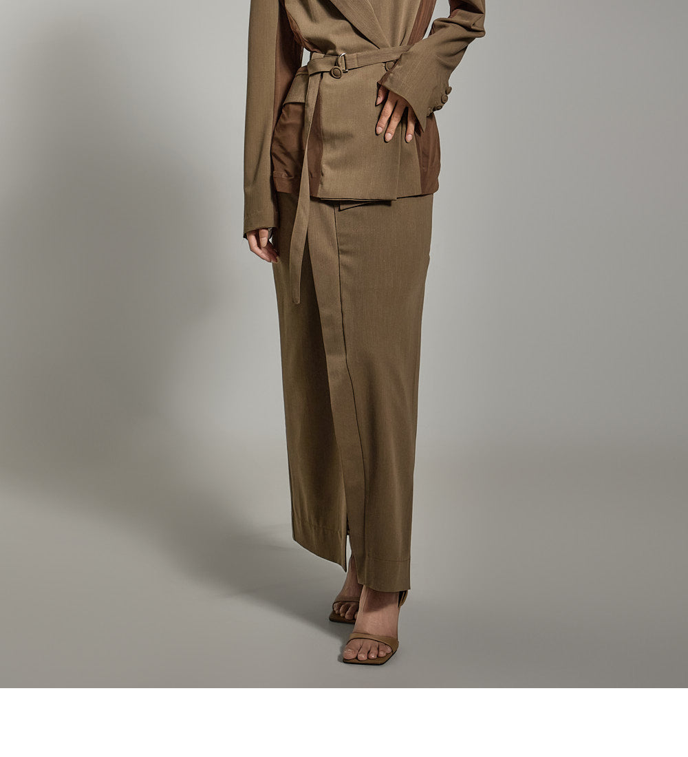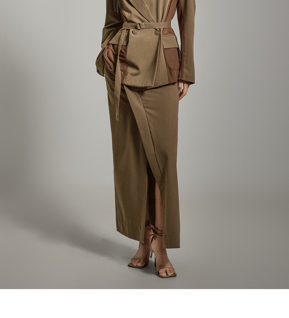 モダンで洗練された雰囲気を演出するラップスカートです。