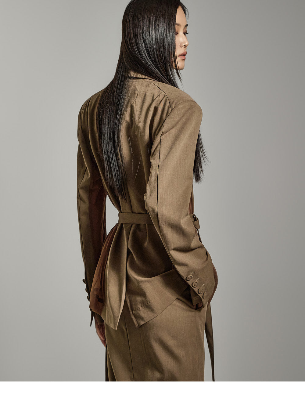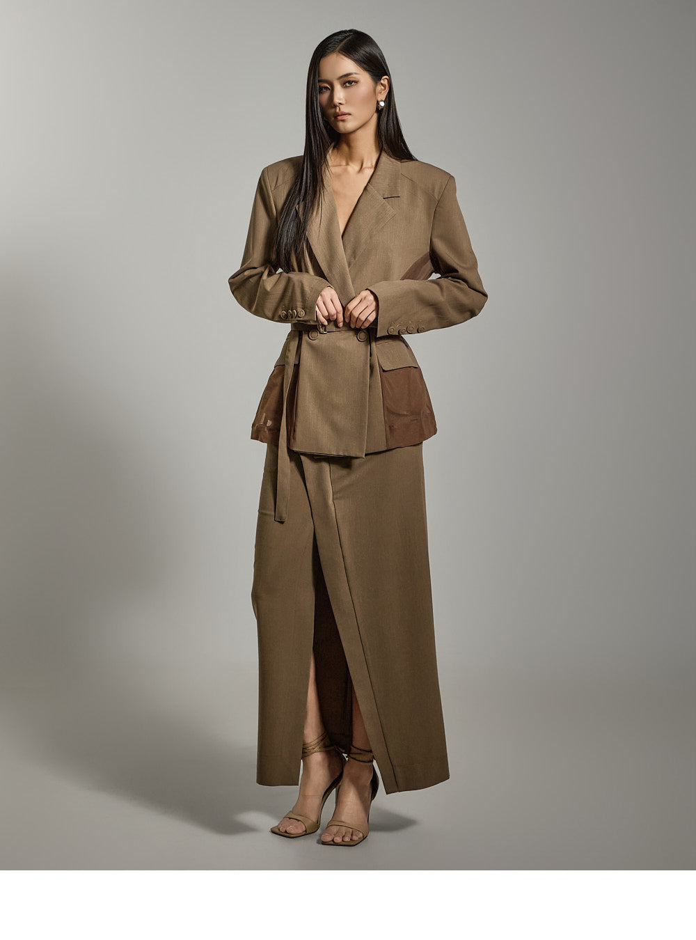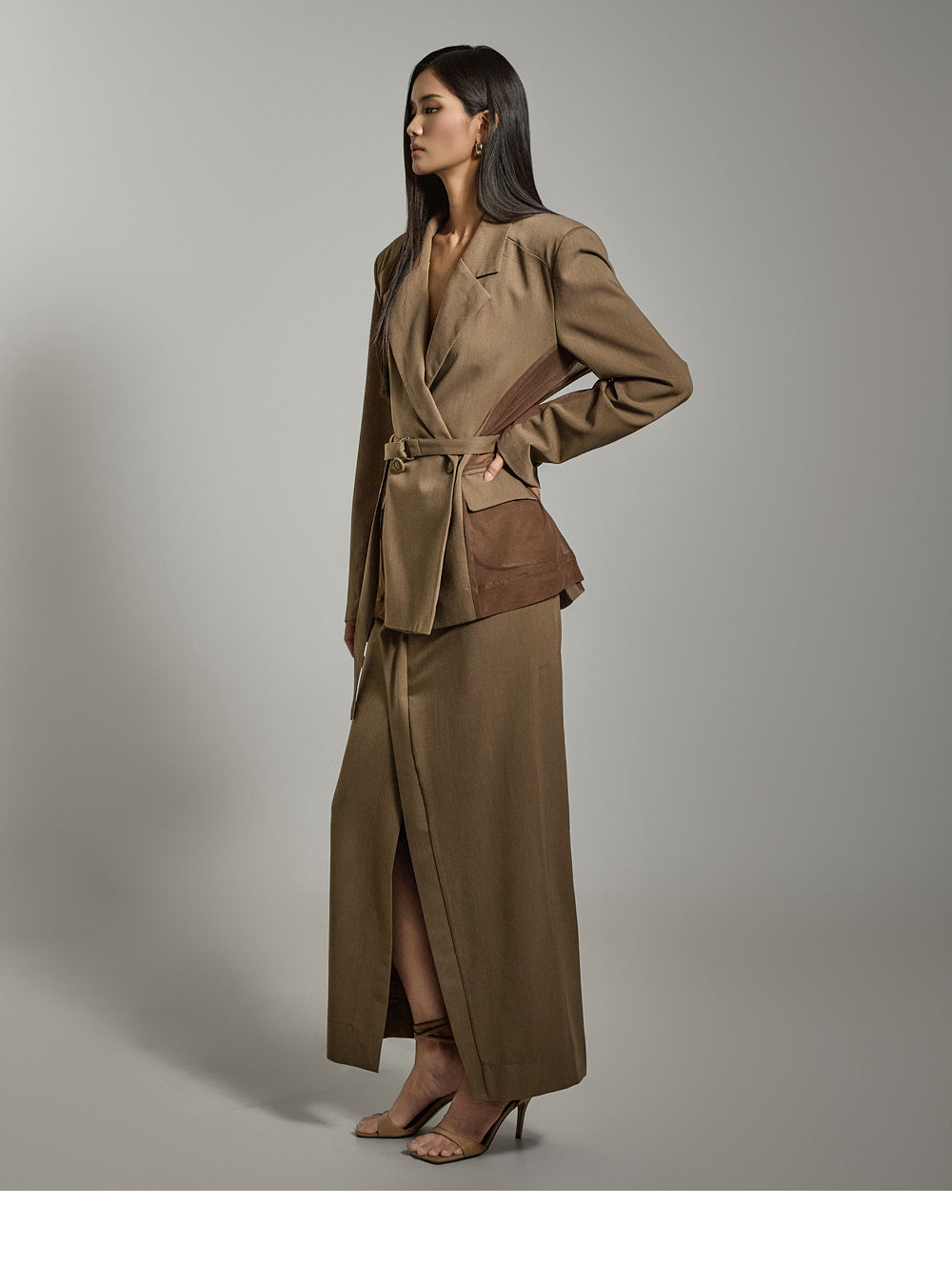 長めの丈とラップスタイルのデザインが洗練された印象を与えます。