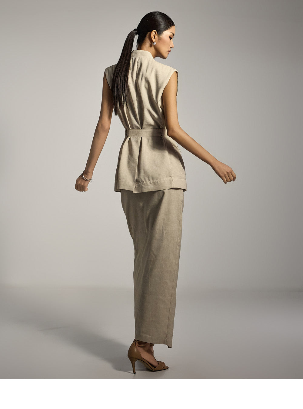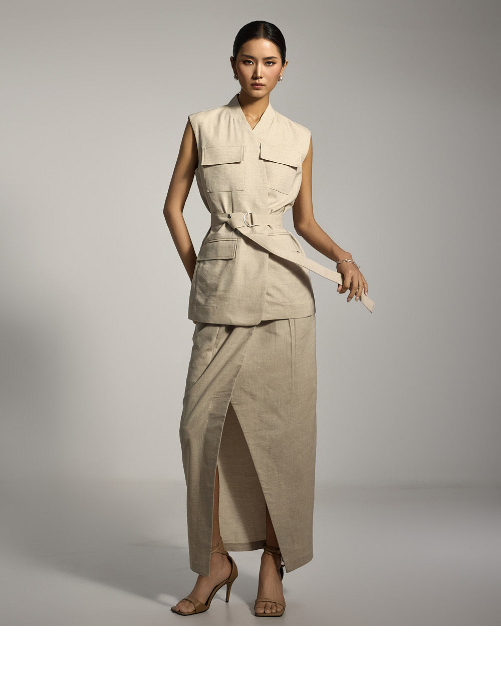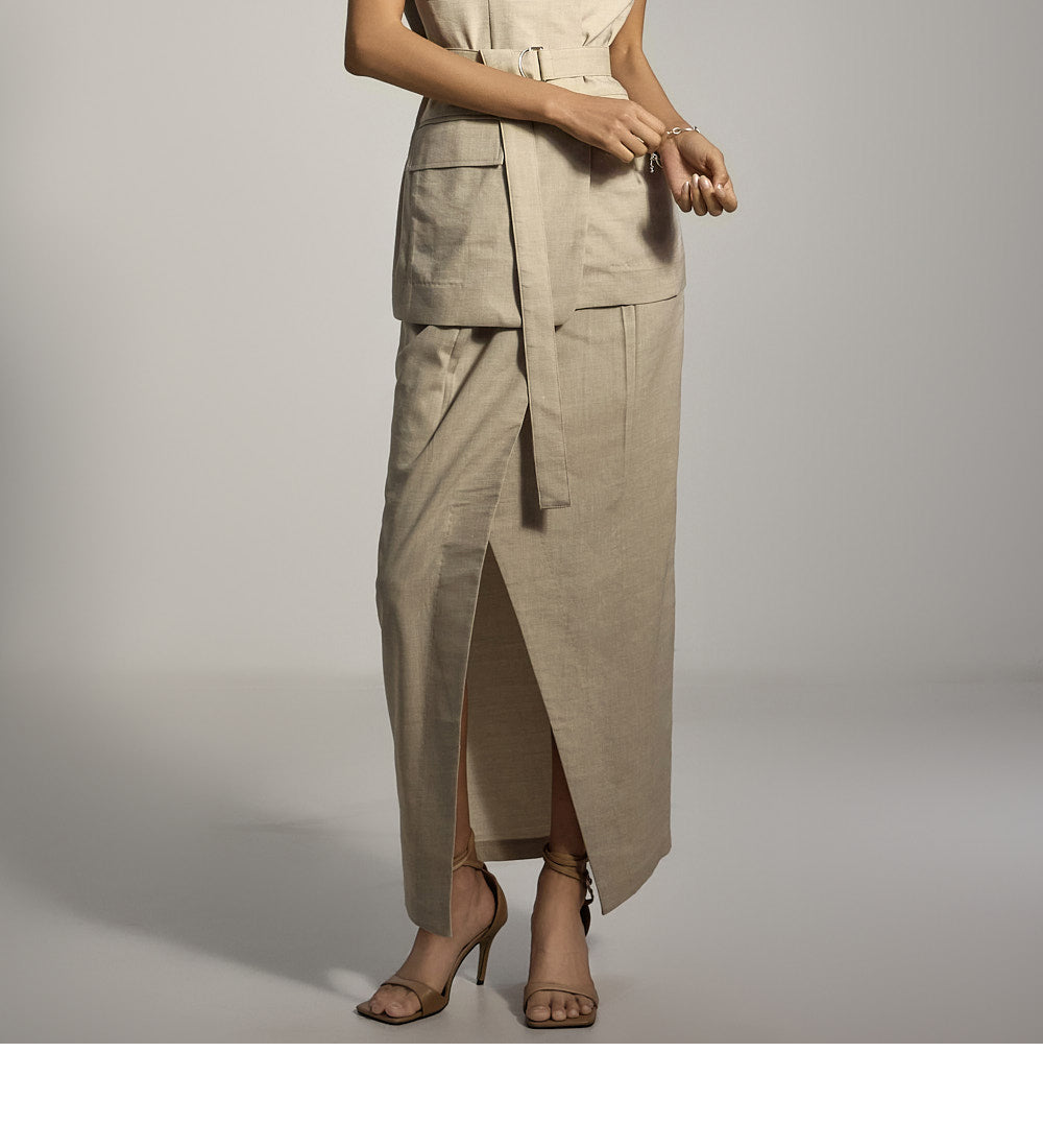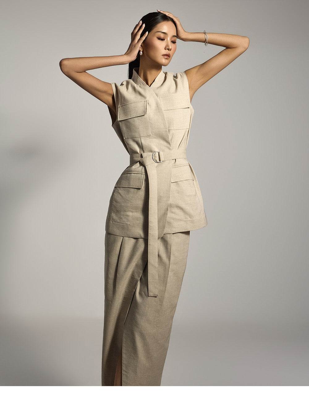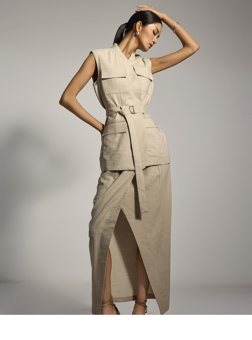 Hラインシルエットとラップデザインがすっきりとした女性らしさを演出し、