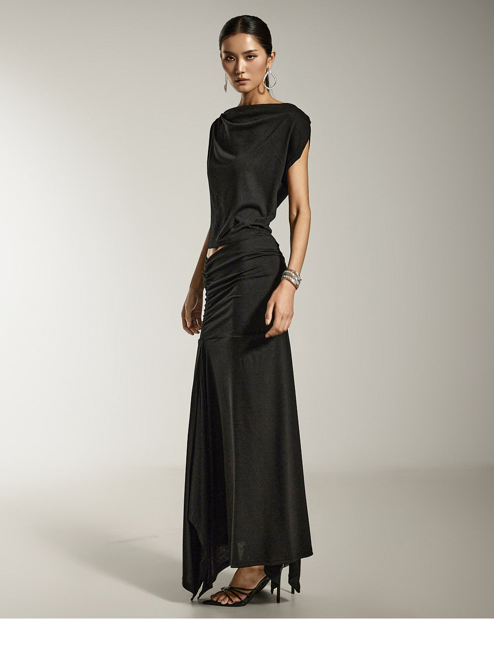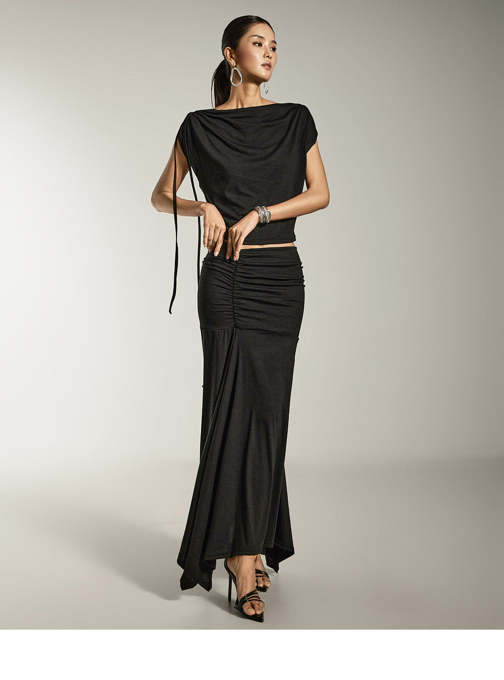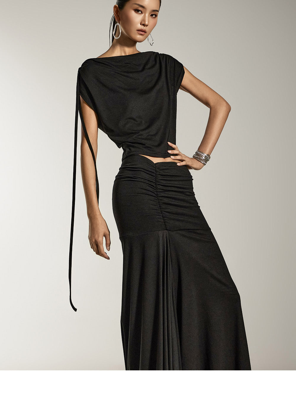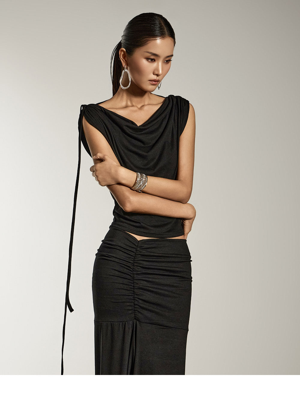 両サイドのシャーリングディテールが自然なボリューム感を演出し、