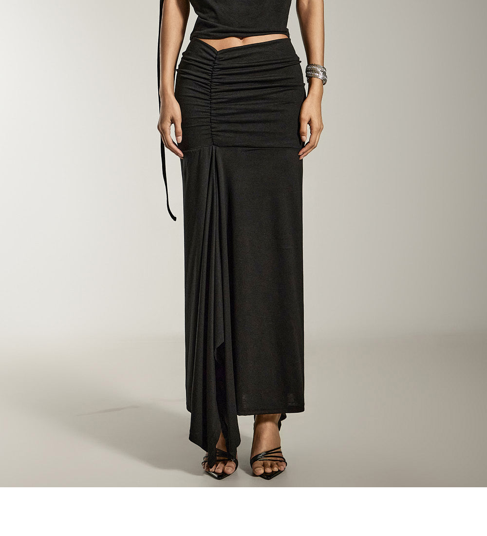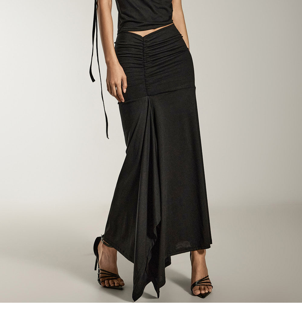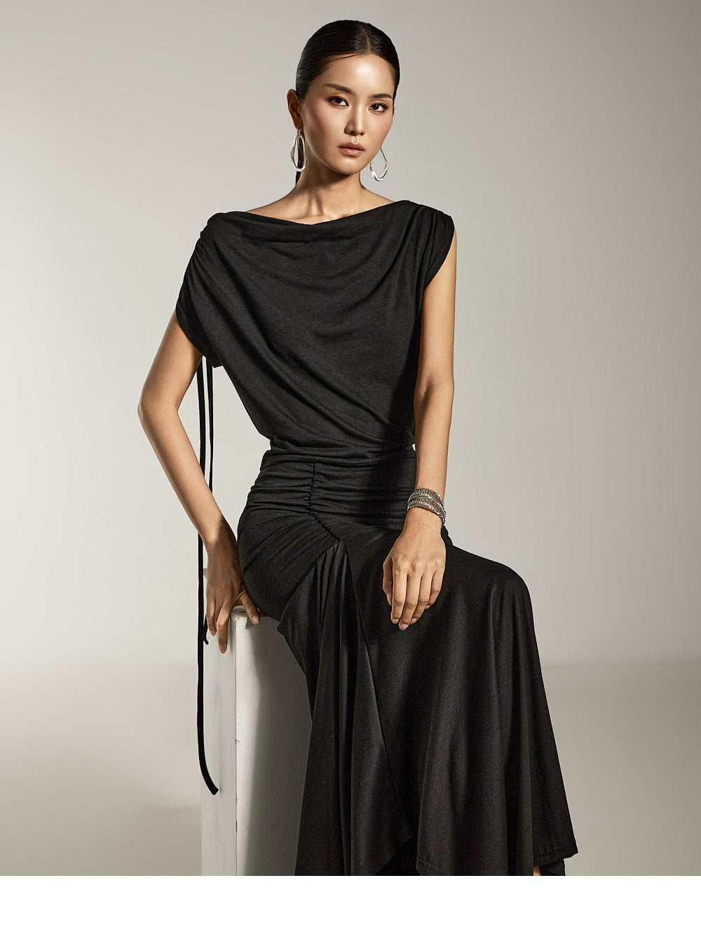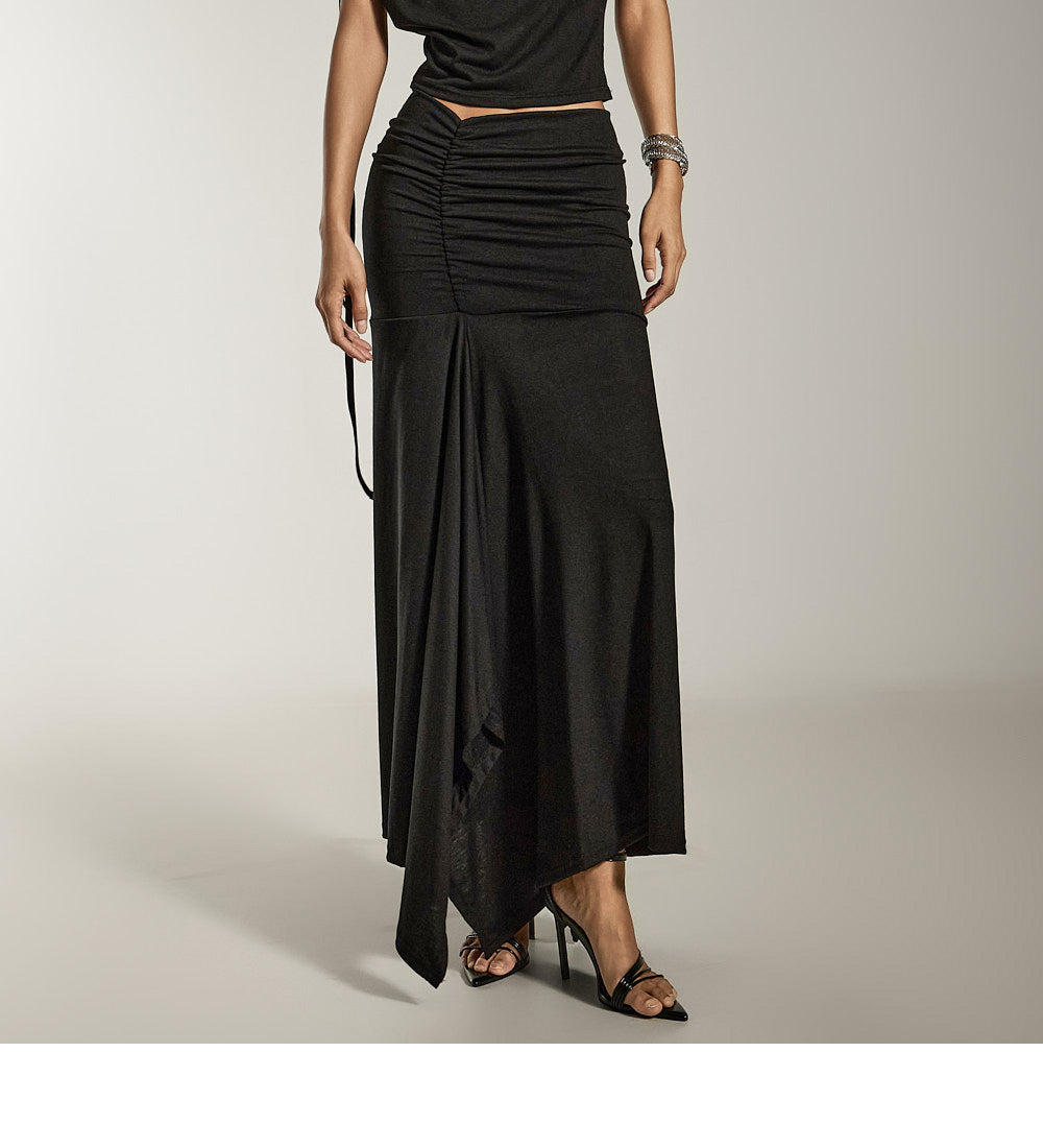 両サイドのシャーリングディテールが自然なボリューム感を演出し、