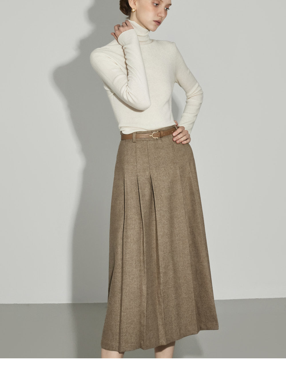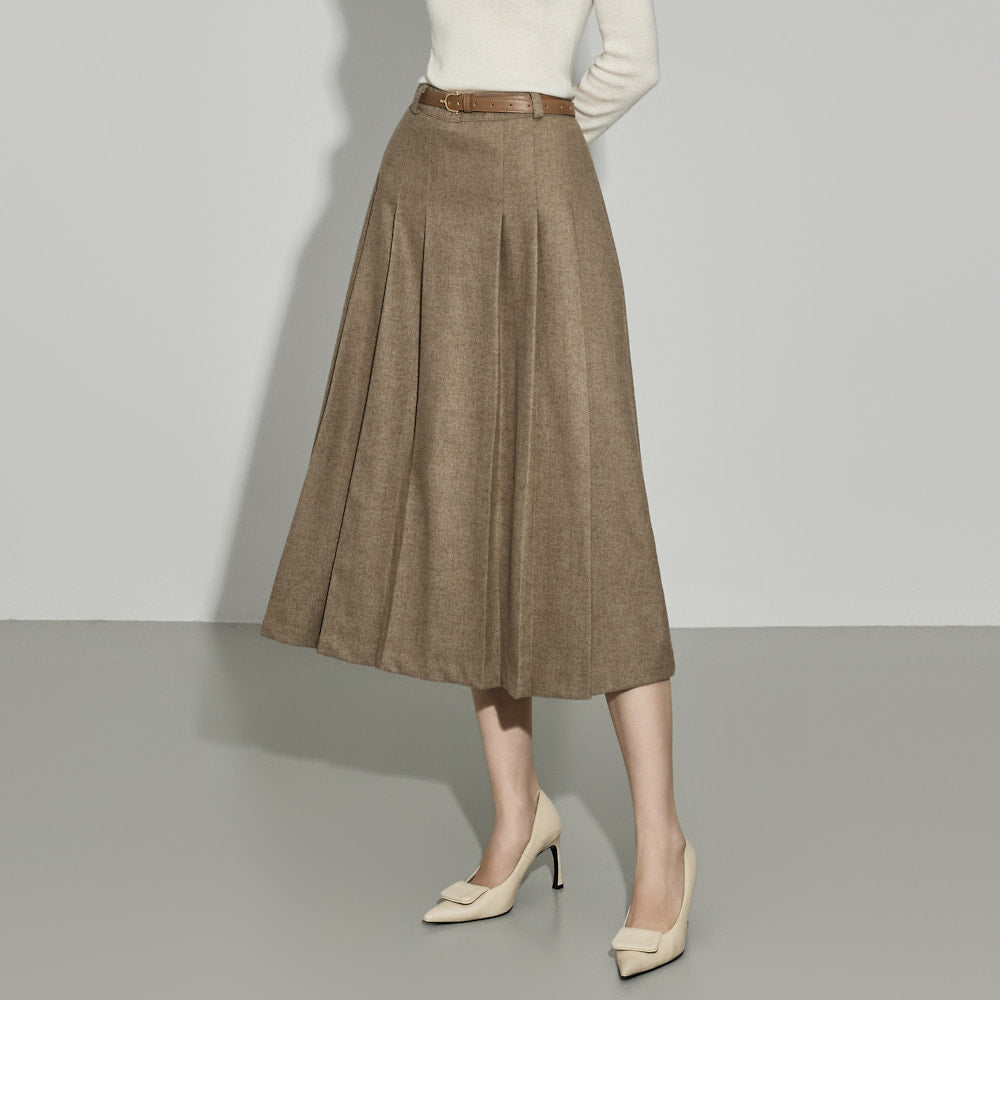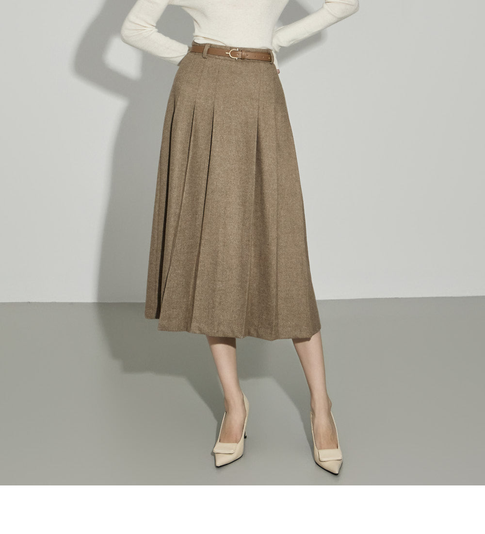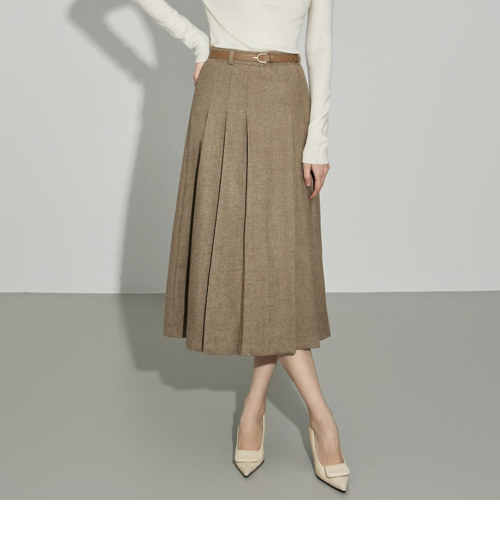 This modern pleated wool skirt is crafted from a blend of polyester, wool, rayon, and spandex.