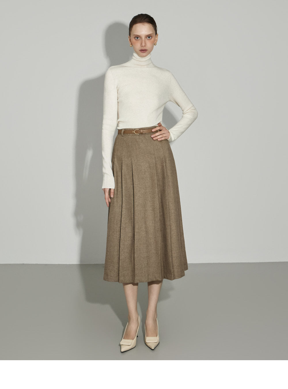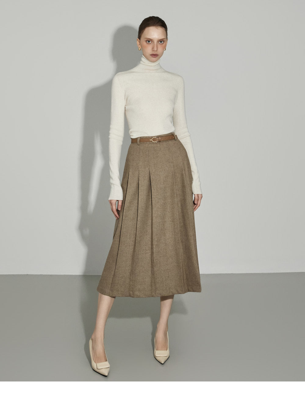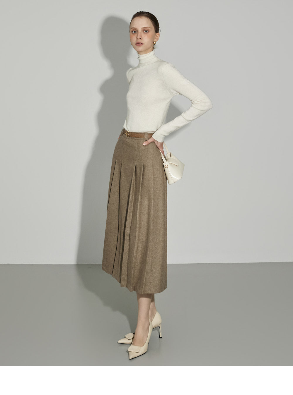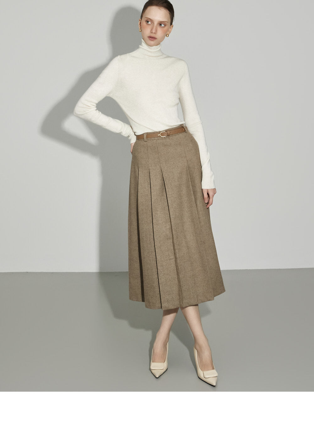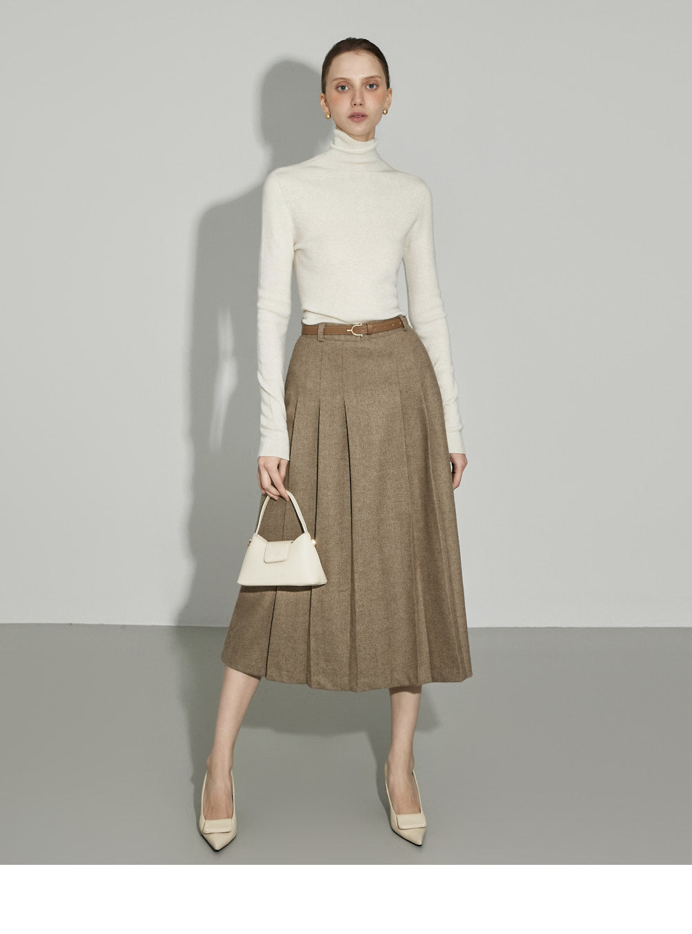 This modern pleated wool skirt is crafted from a blend of polyester, wool, rayon, and spandex.