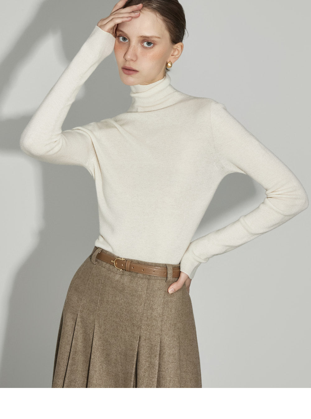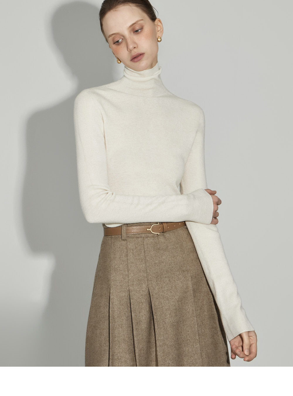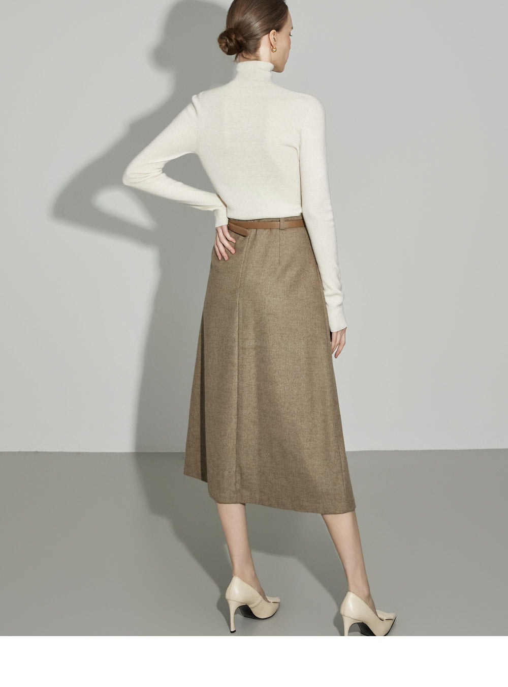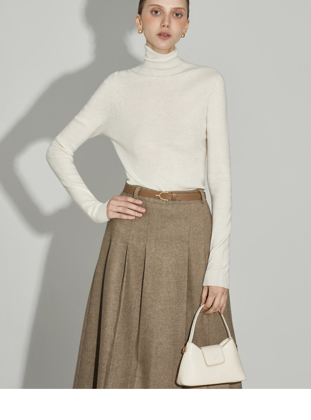 This modern pleated wool skirt is crafted from a blend of polyester, wool, rayon, and spandex.