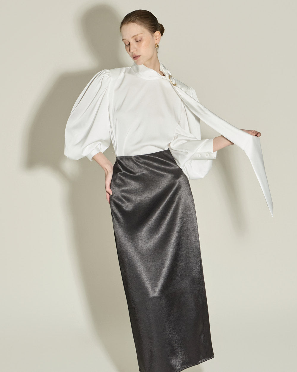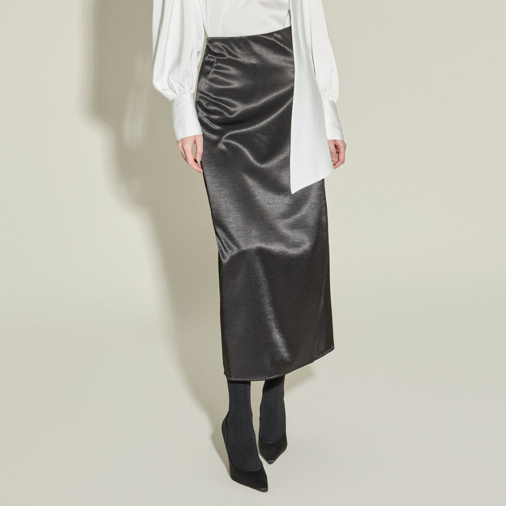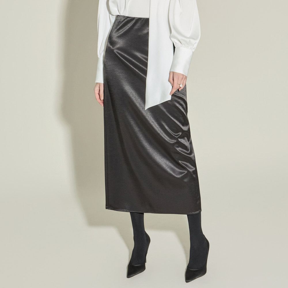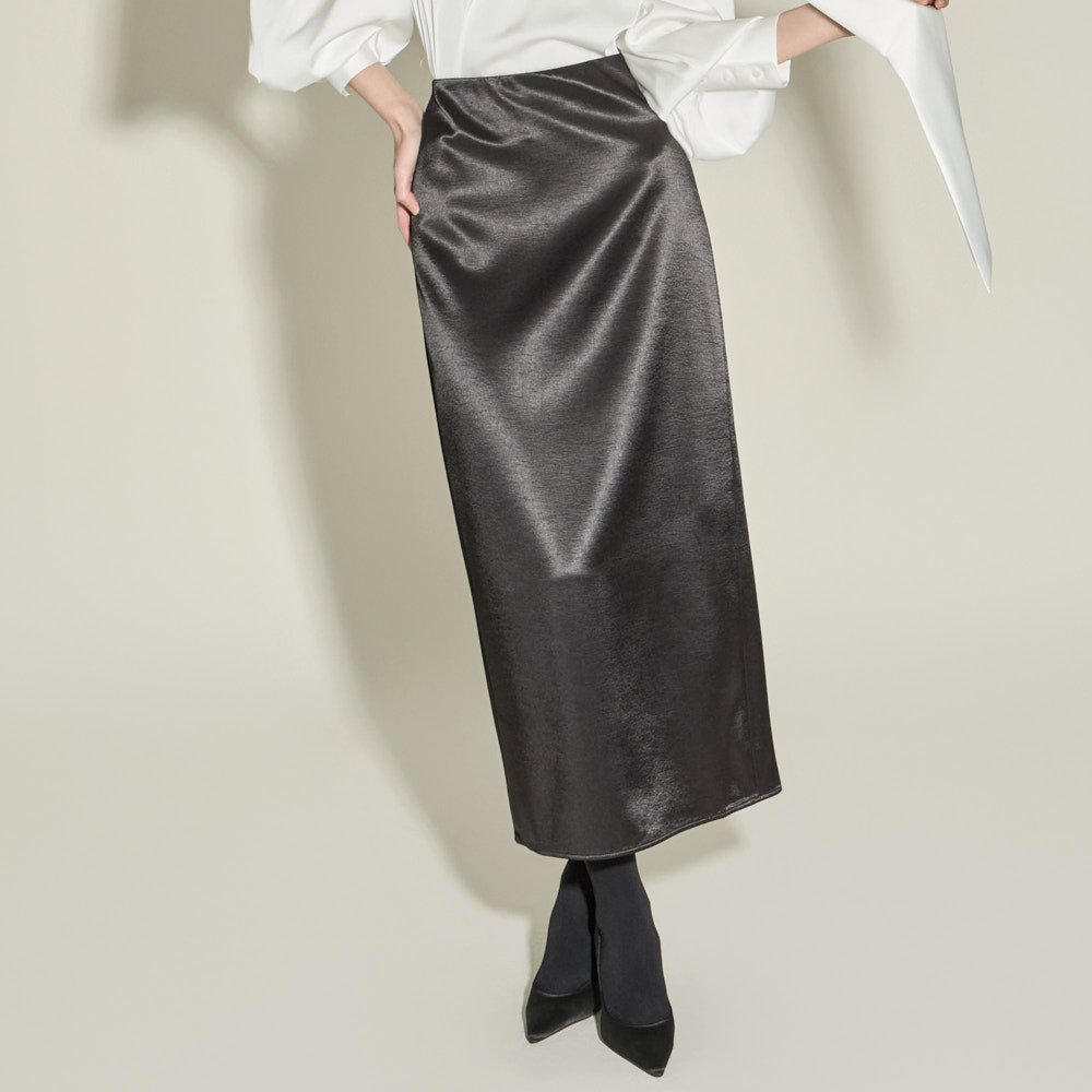 This satin long skirt exudes a feminine and luxurious vibe.