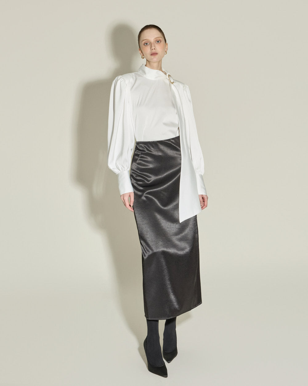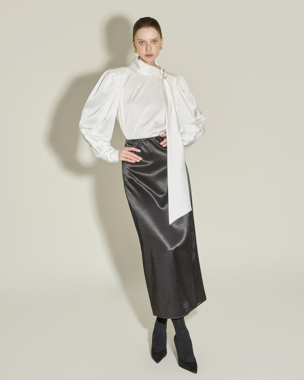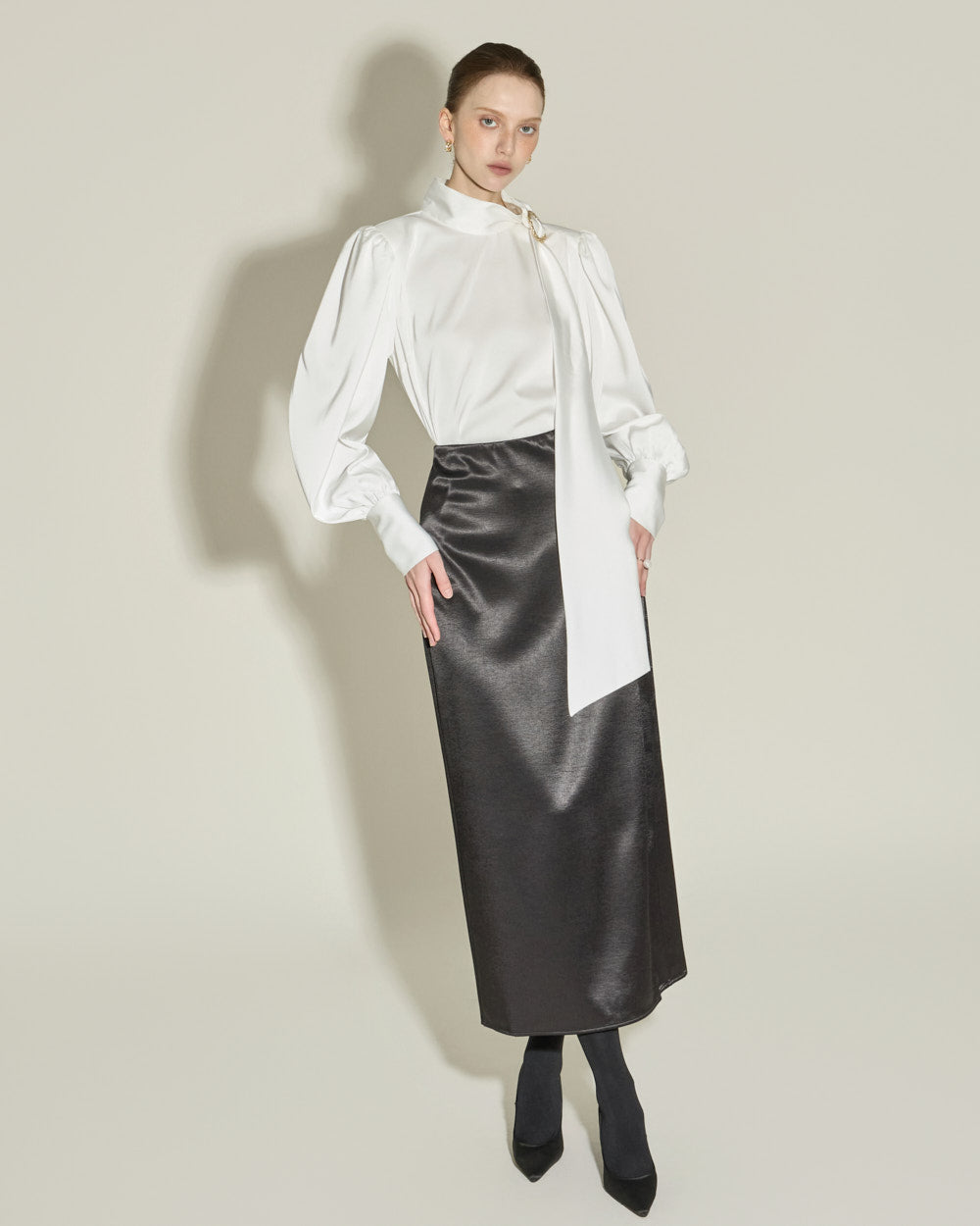 This satin long skirt exudes a feminine and luxurious vibe.