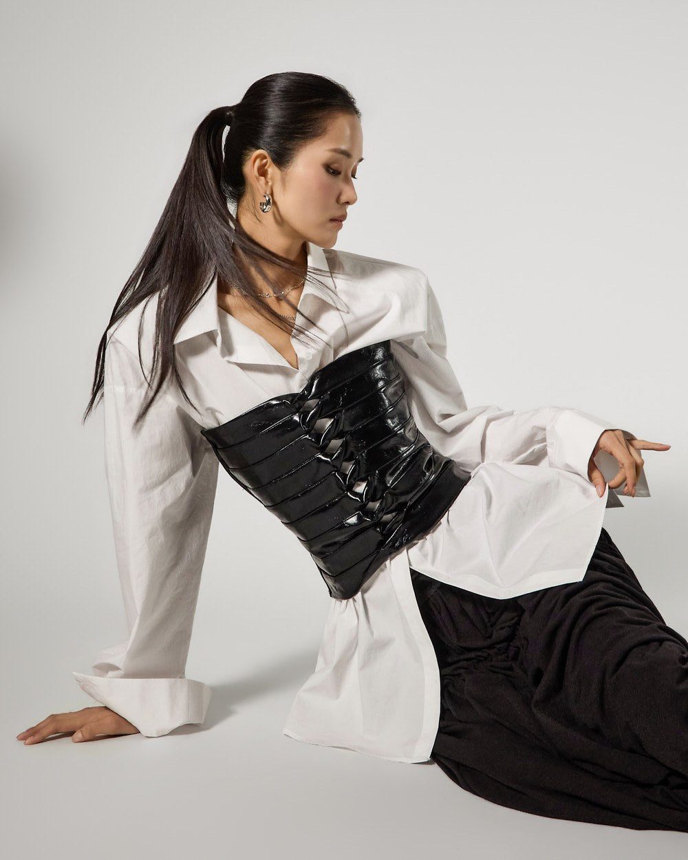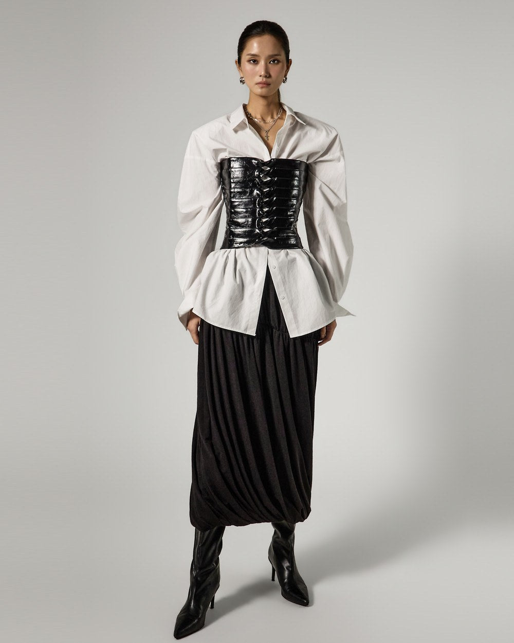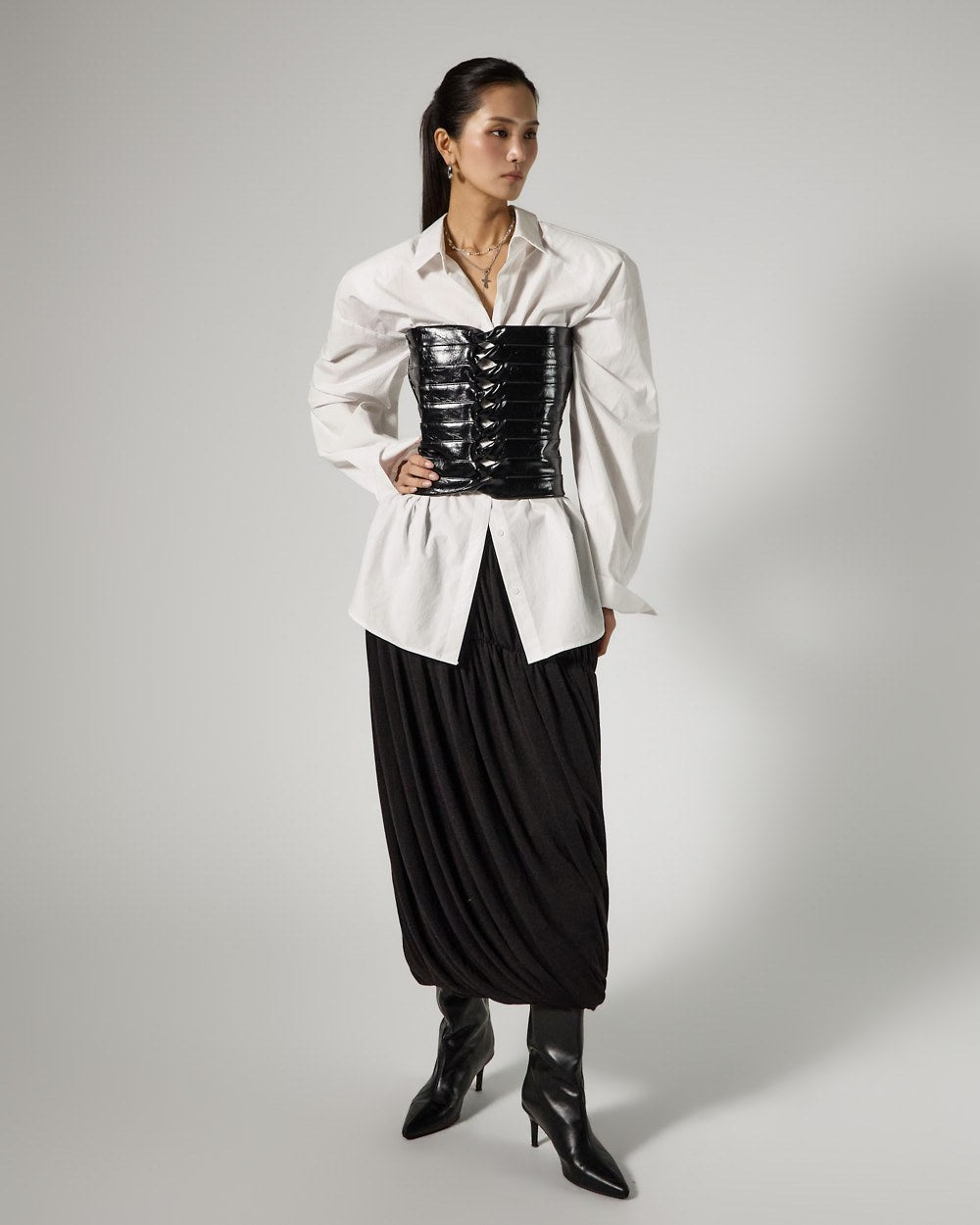 This unique rune shirring skirt is perfect for styling as a statement piece.