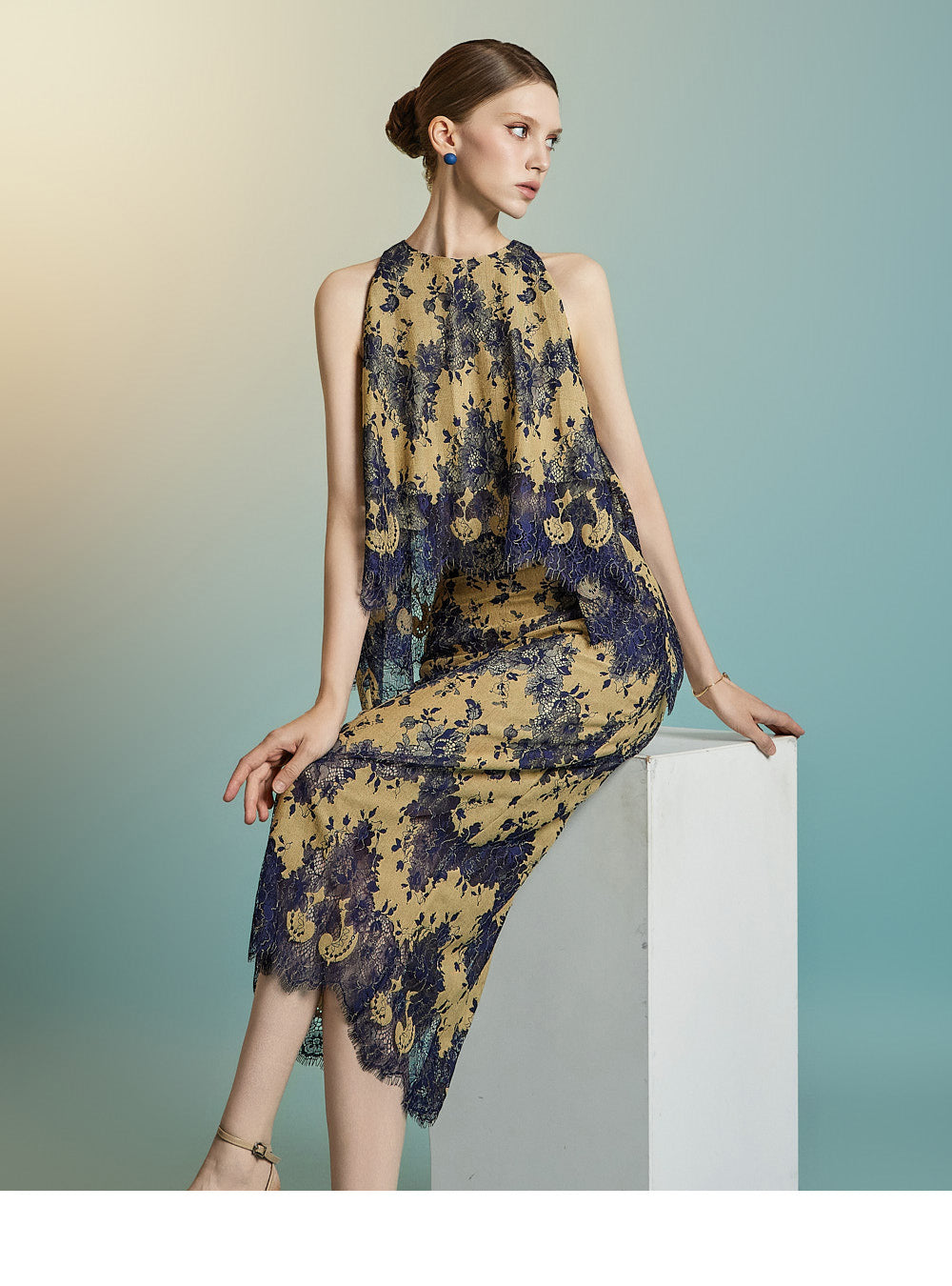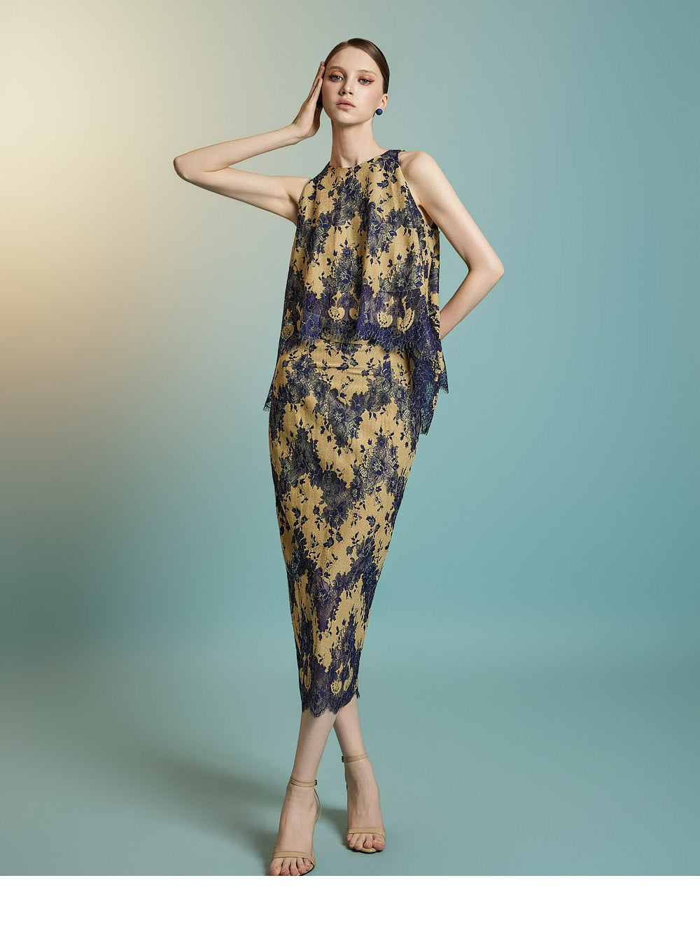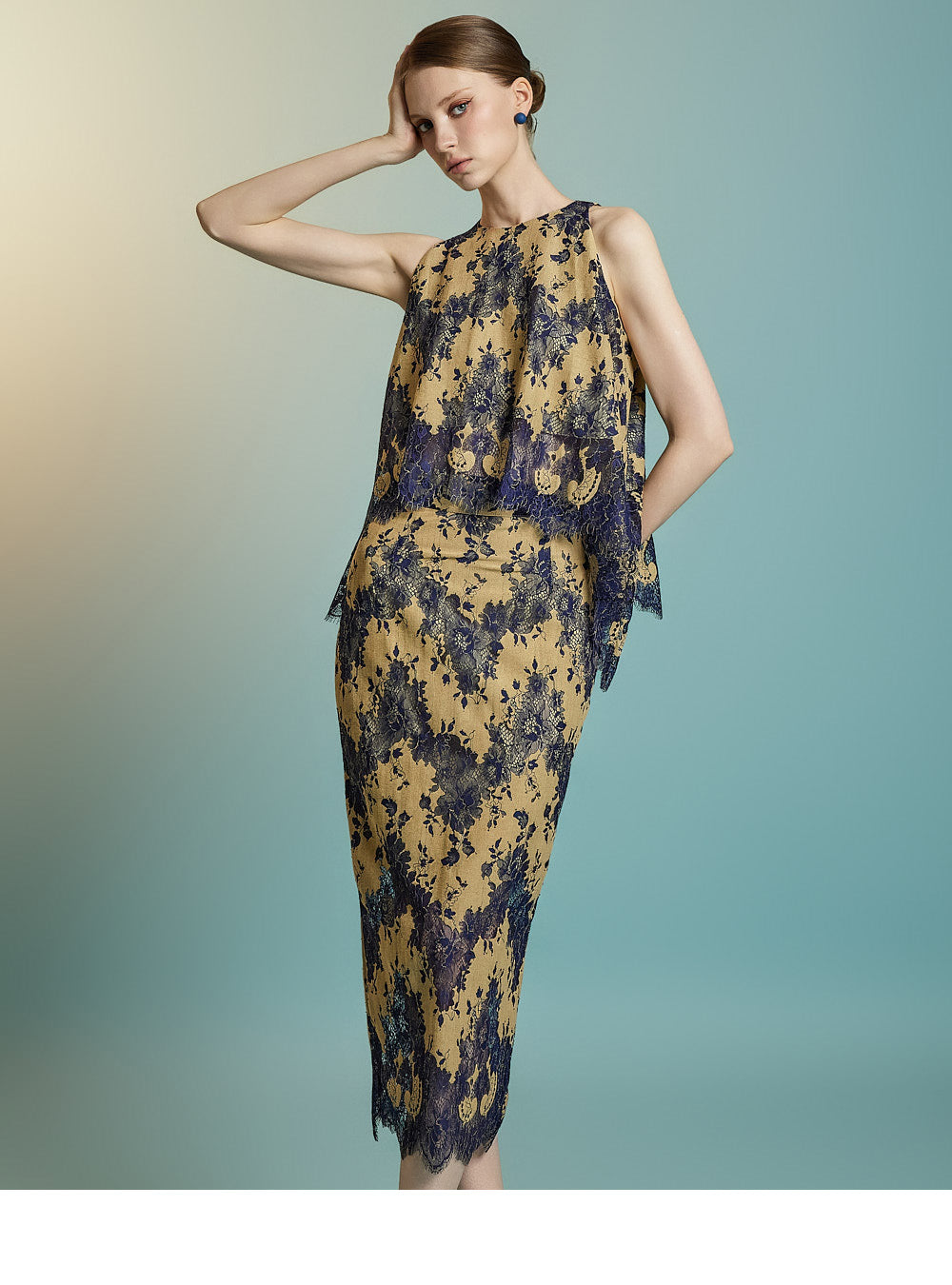 全体に花柄のレース生地を使用し、裾には透け感のあるディテールを施し、さりげないアクセントを添えています。