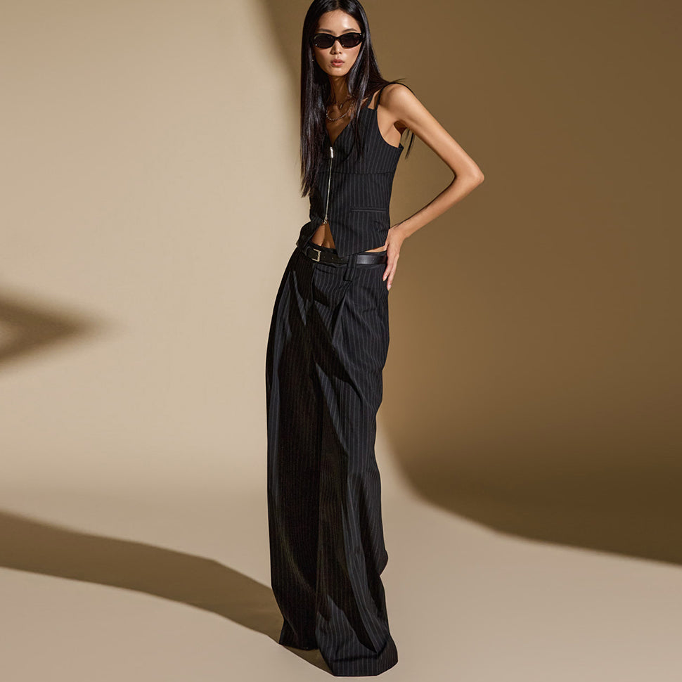 パンツはモダンでスタイリッシュな印象を与えます。ストライプ柄
