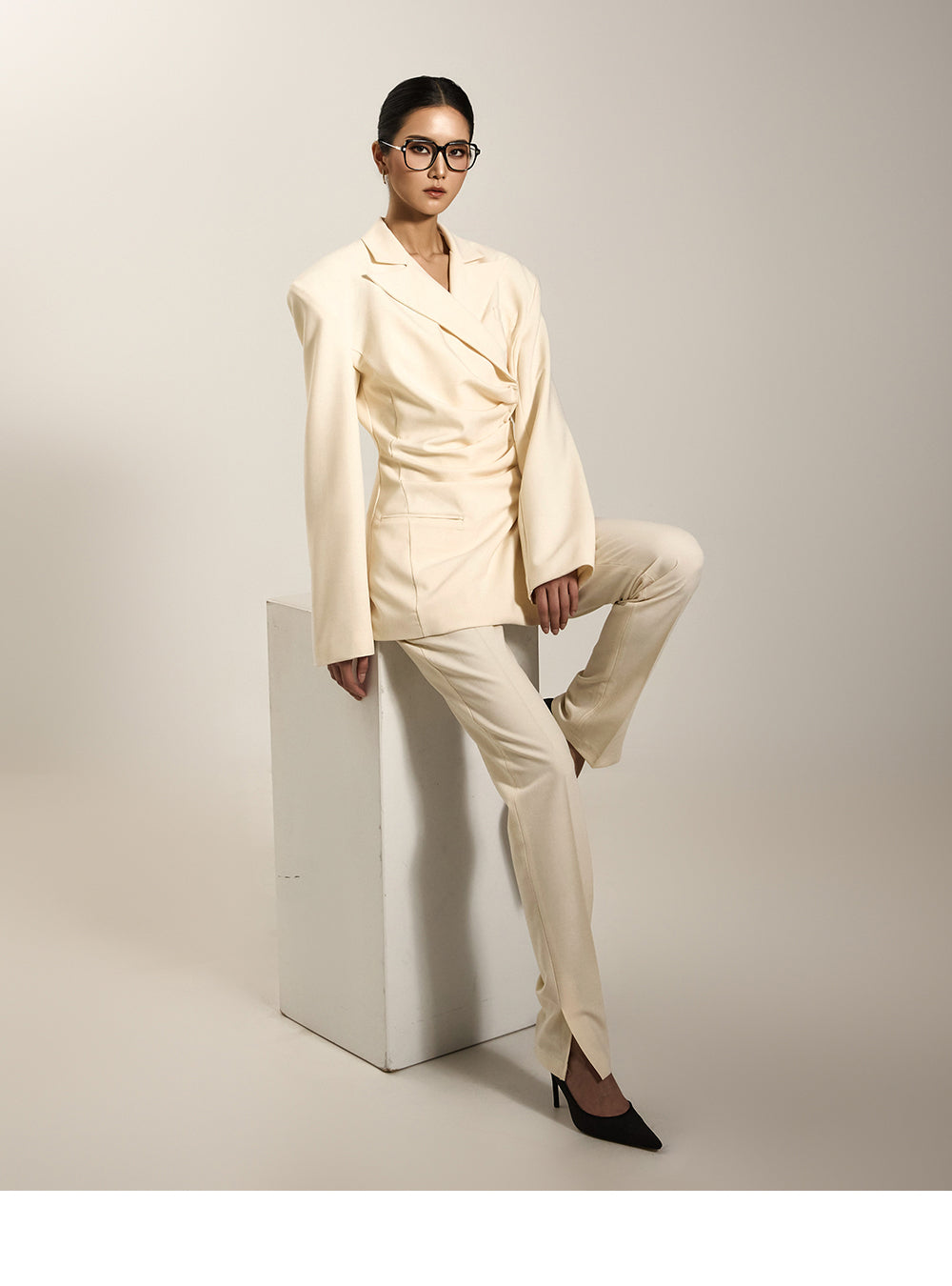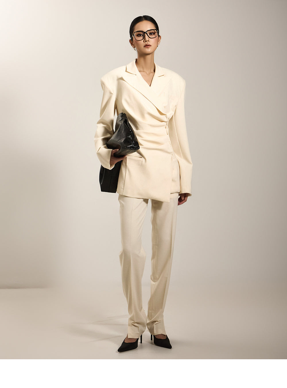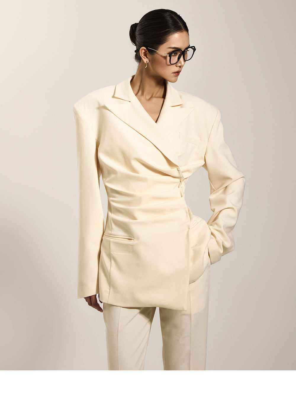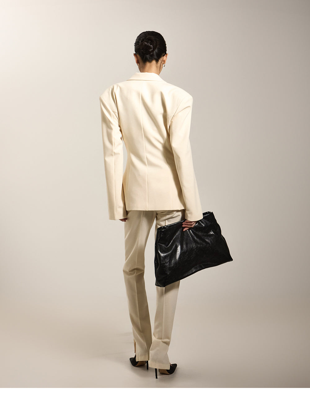 ジャケットはシルエットをはっきりさせる構造化されたショルダーパッドが特徴で、