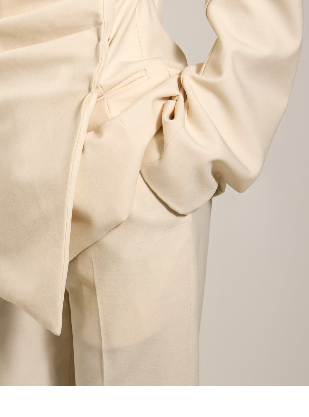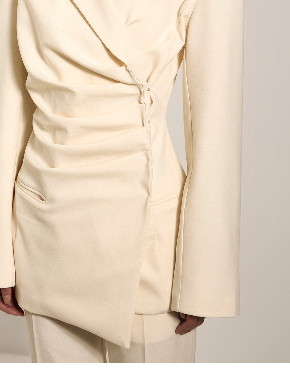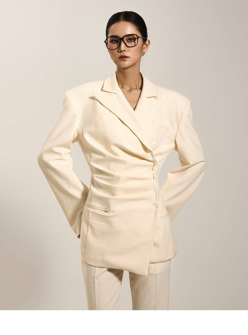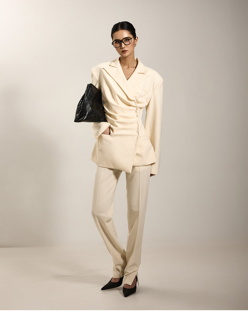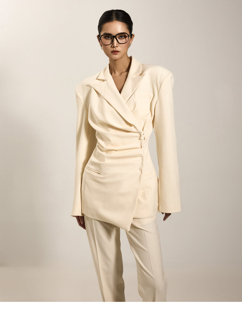 ジャケットはシルエットをはっきりさせる構造化されたショルダーパッドが特徴で、