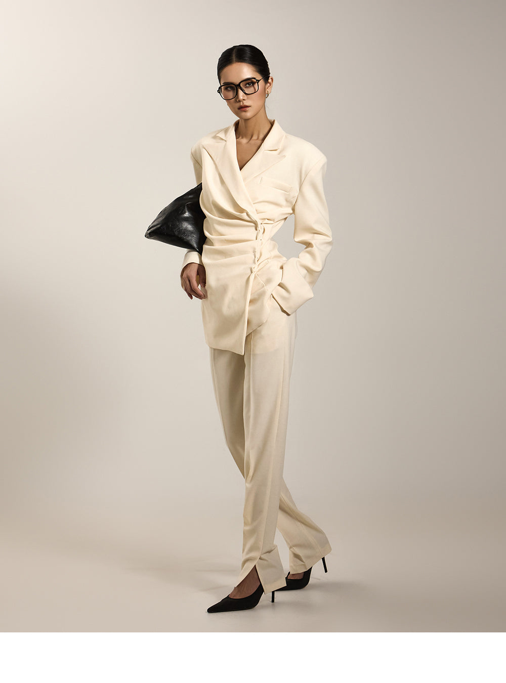 ウエストのシャーリングディテールがスタイリッシュで洗練された印象を与えます。