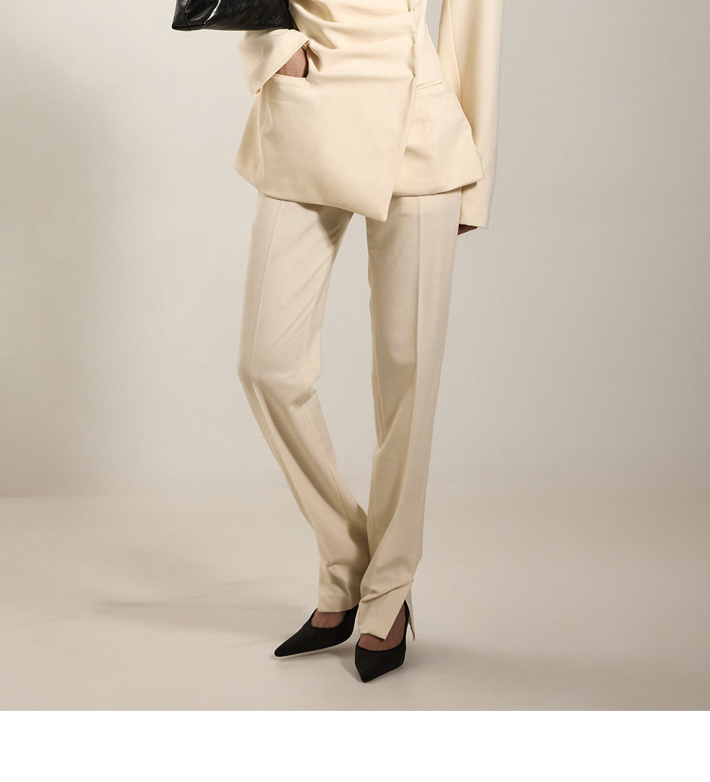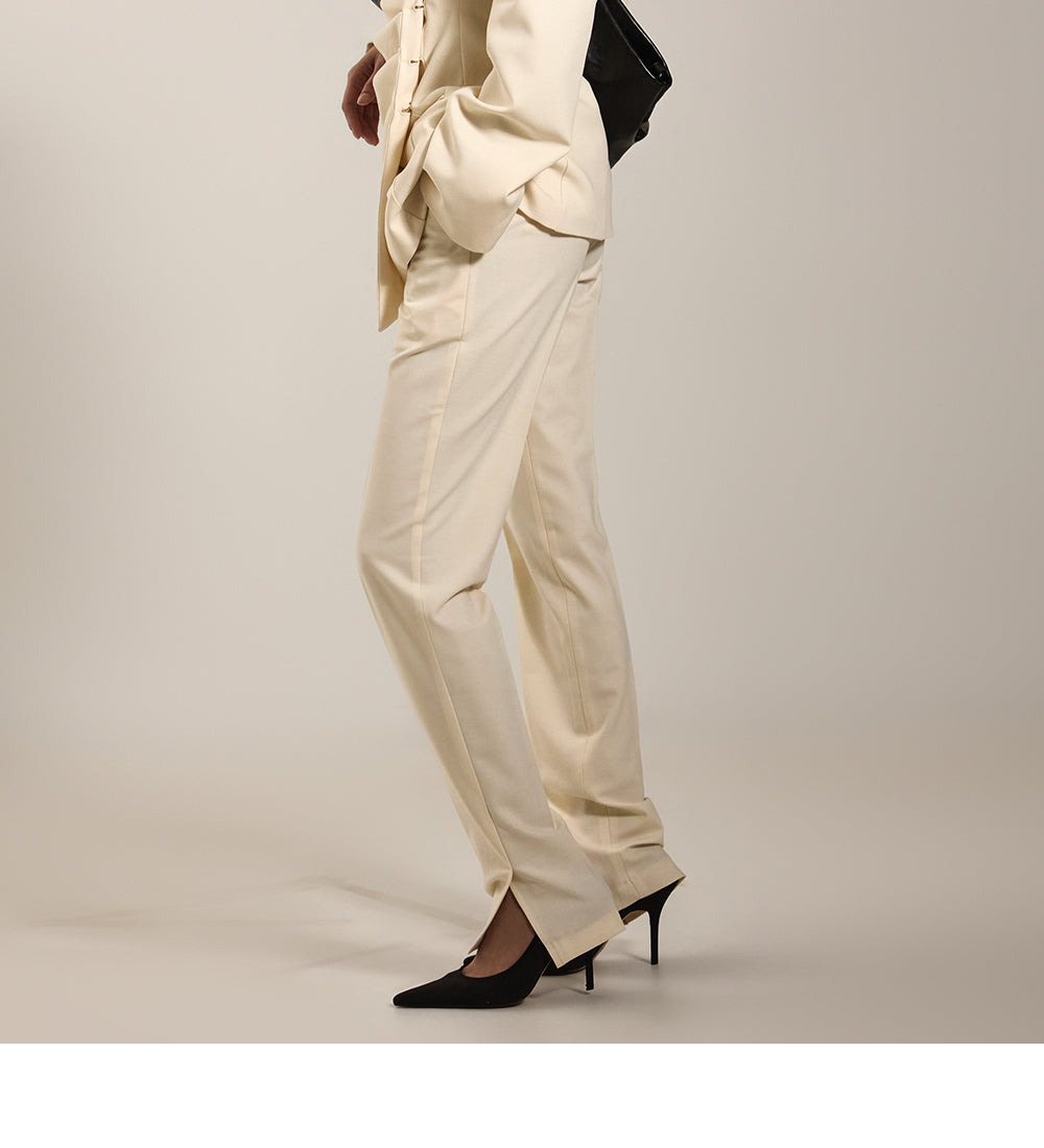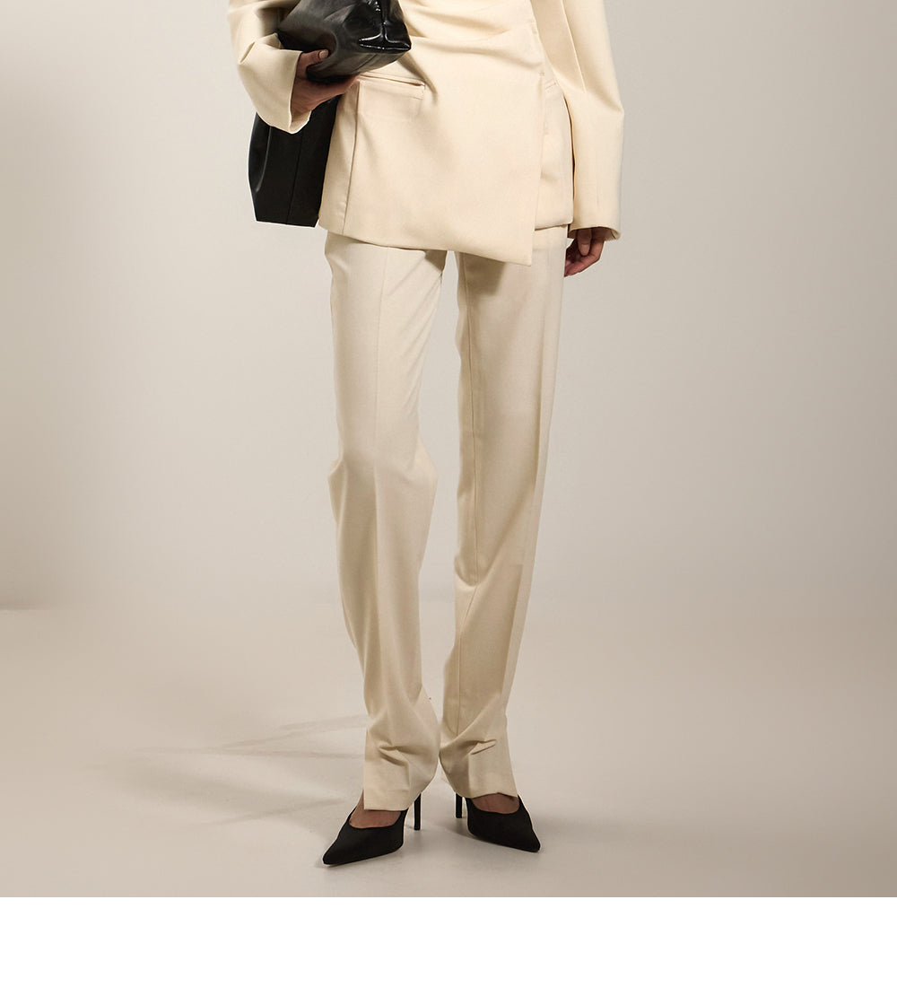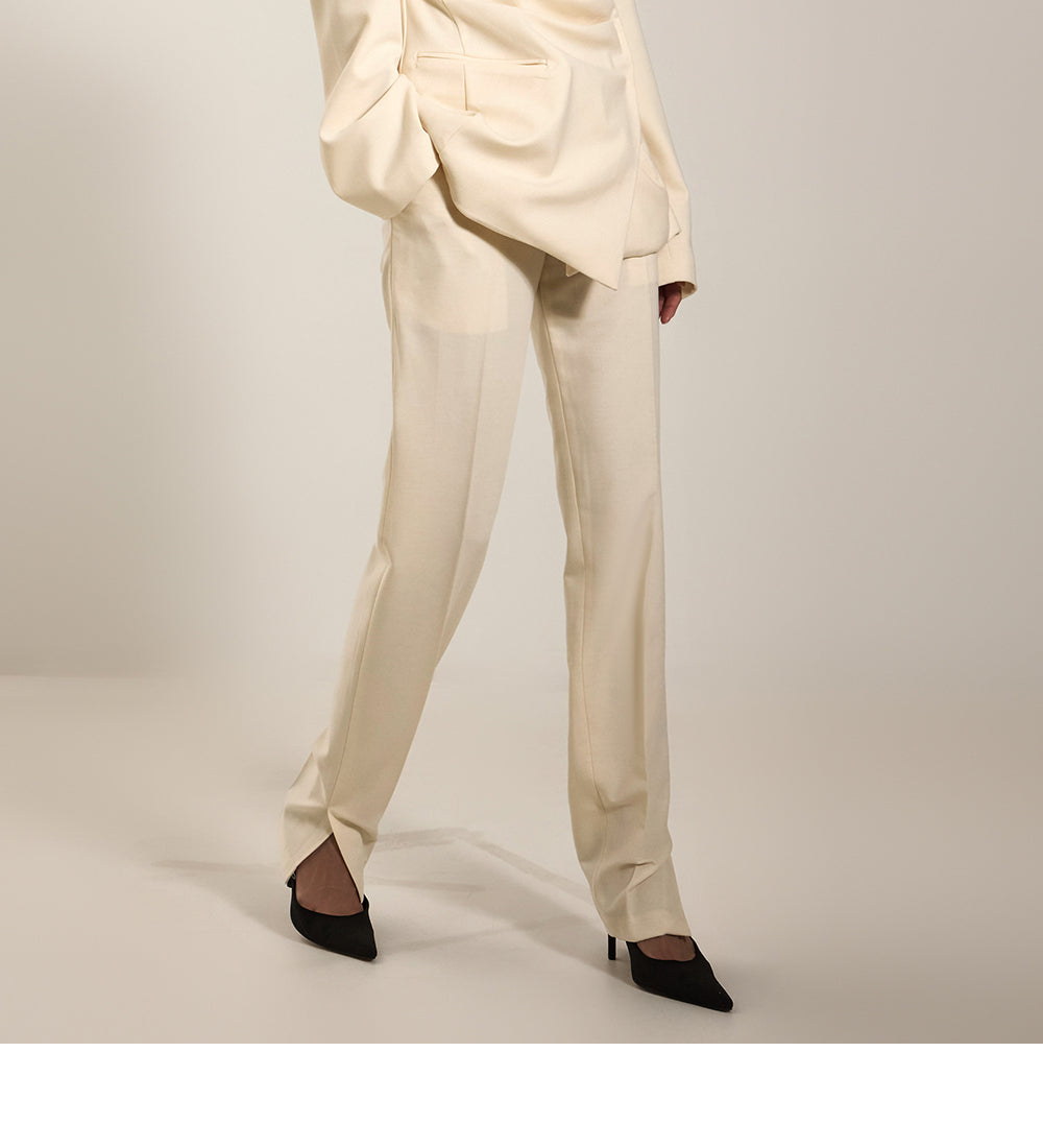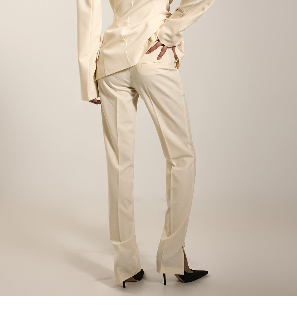 フロントのピンタックディテールと裾のスリットが、さりげなくもスタイリッシュな印象をプラスします。