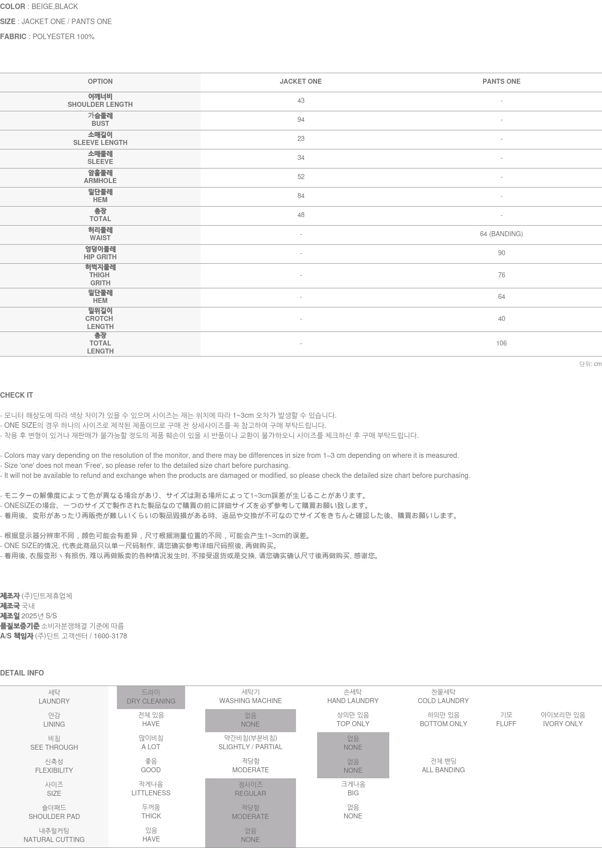 ジャケットとパンツはどちらもワンサイズです。