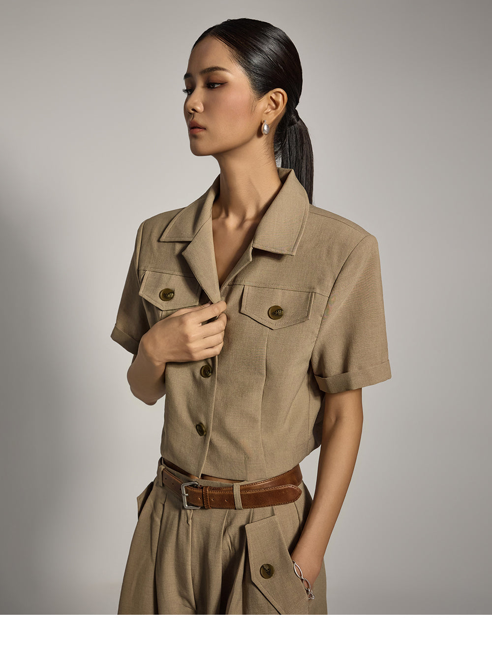 フェイクチェストポケットとフロントボタン留めがディテールをプラス。
