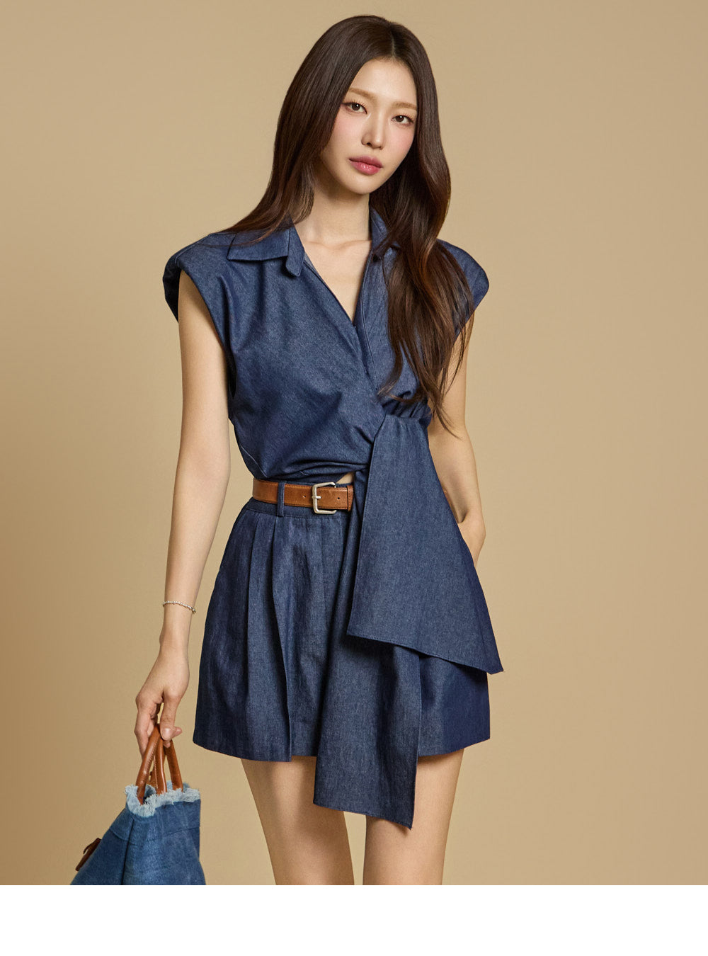 トップスは肩パッドとフロントのシャーリングタイのディテールが特徴で、