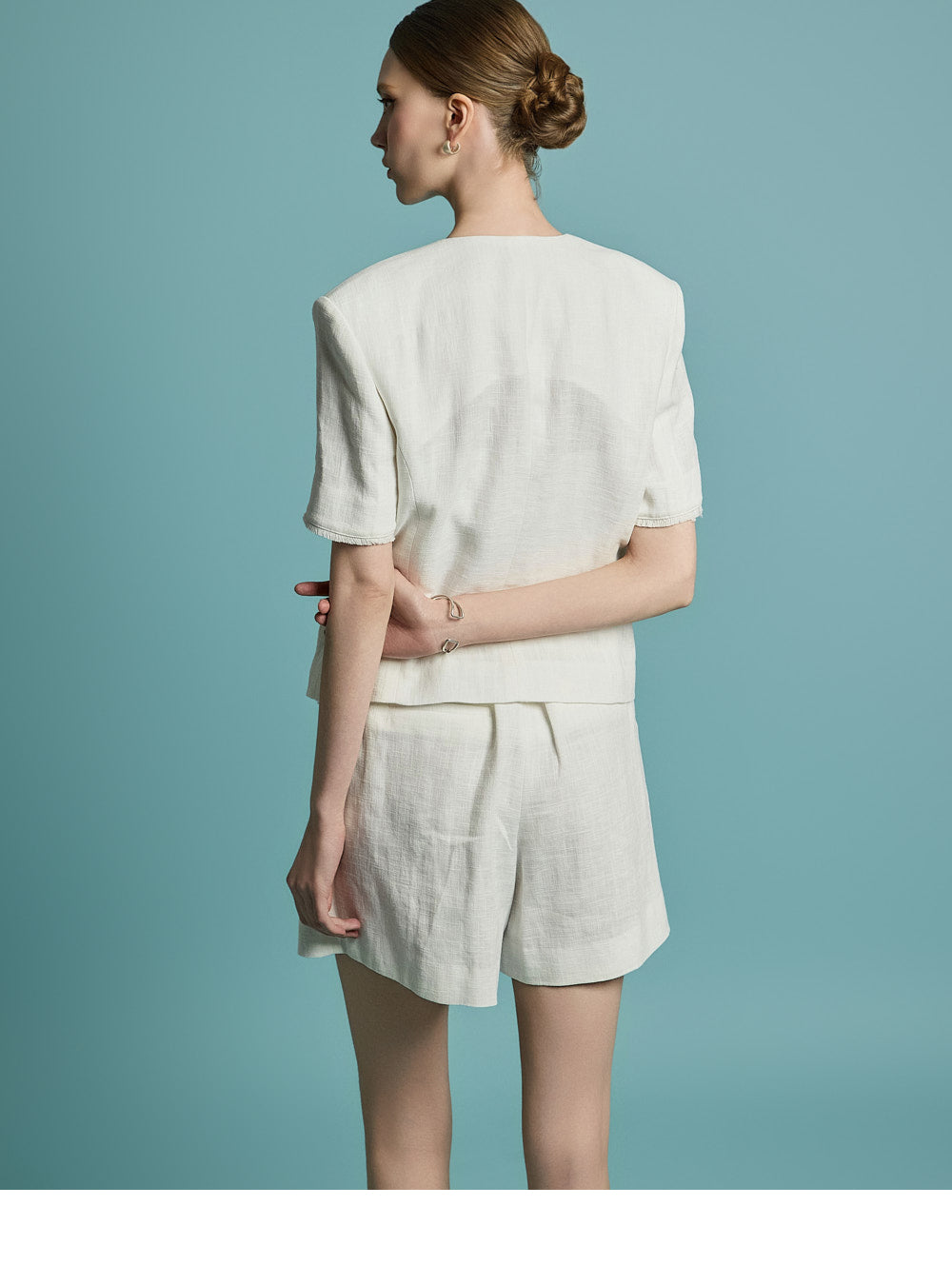 ノーカラージャケットにゆったりとしたハーフパンツを合わせた
