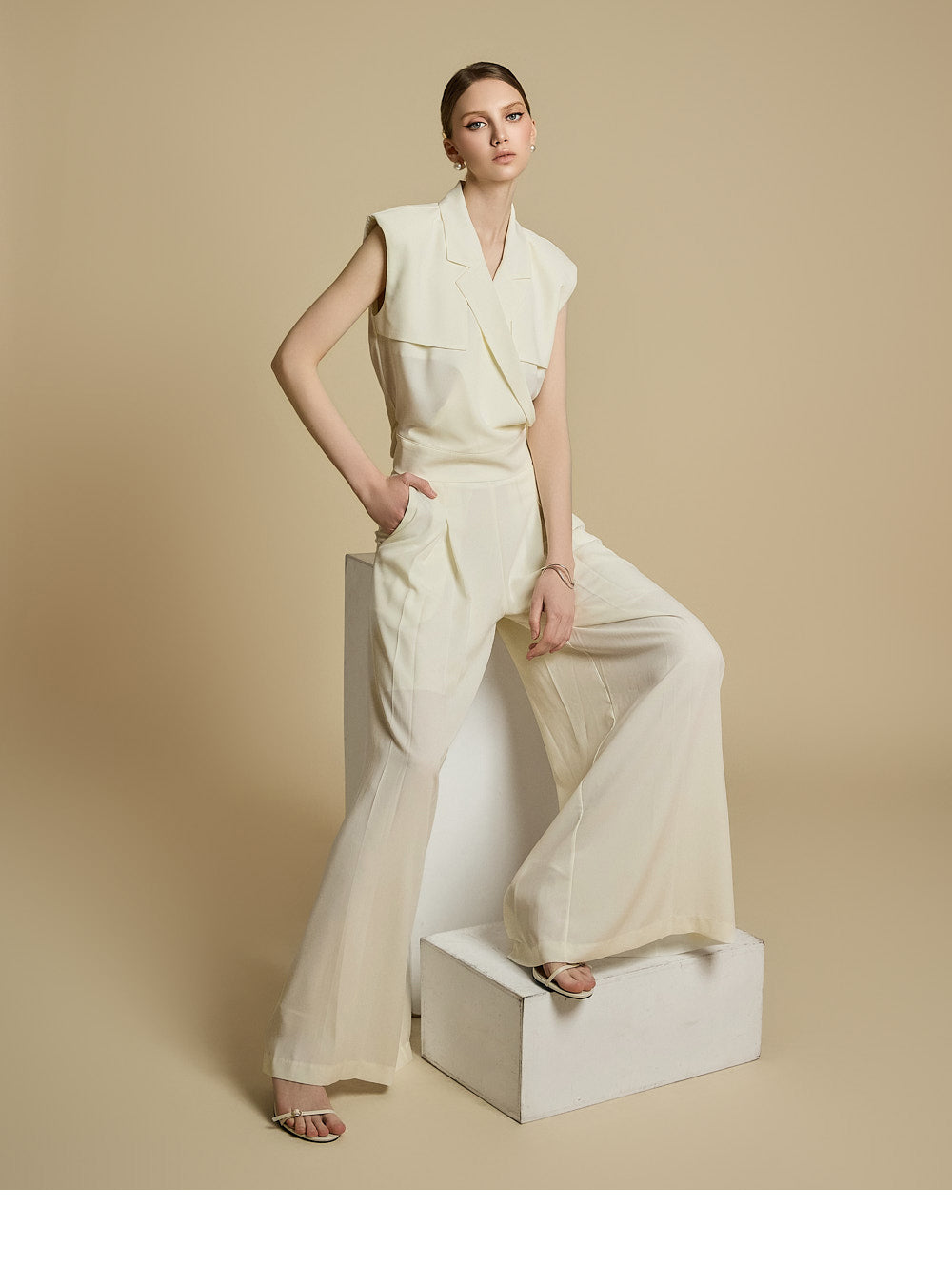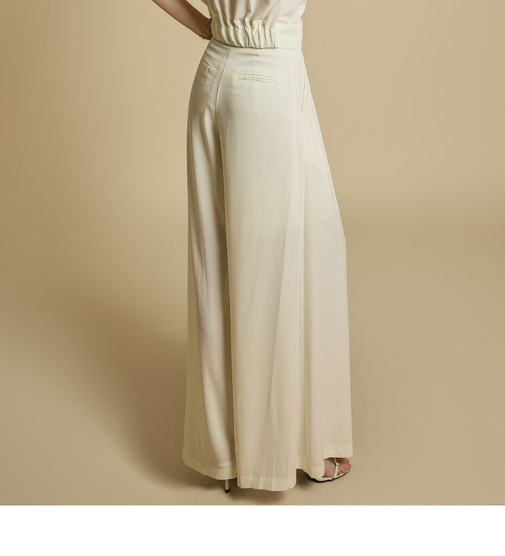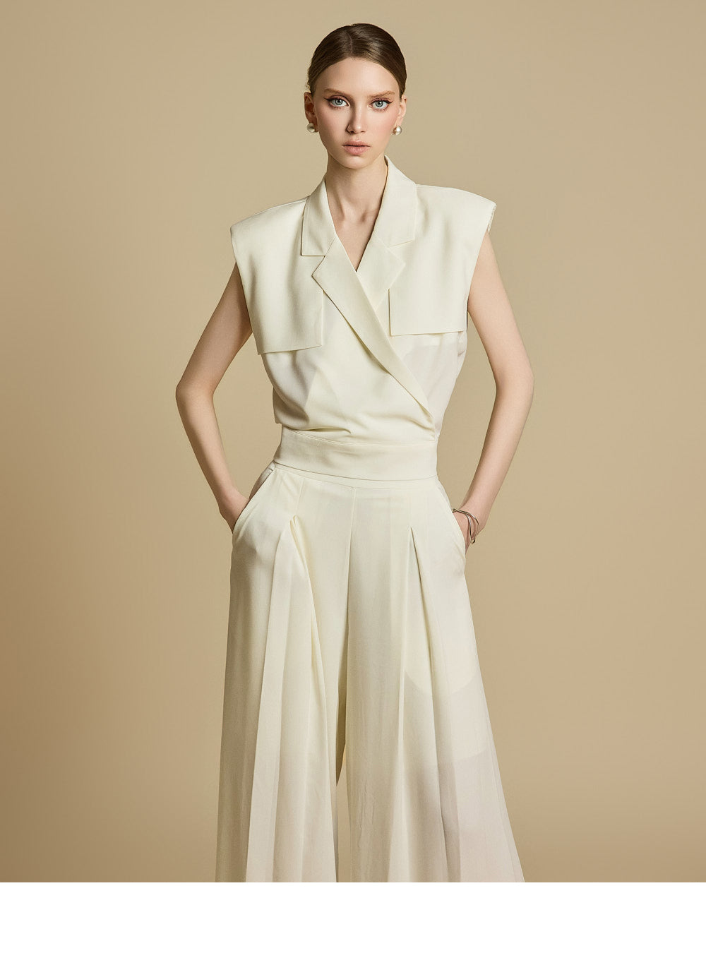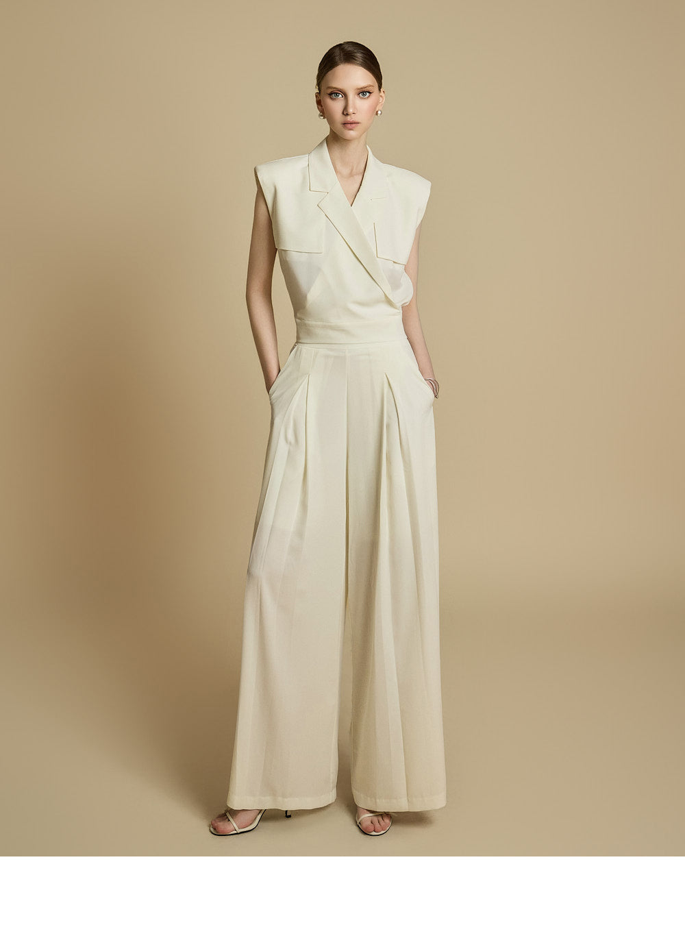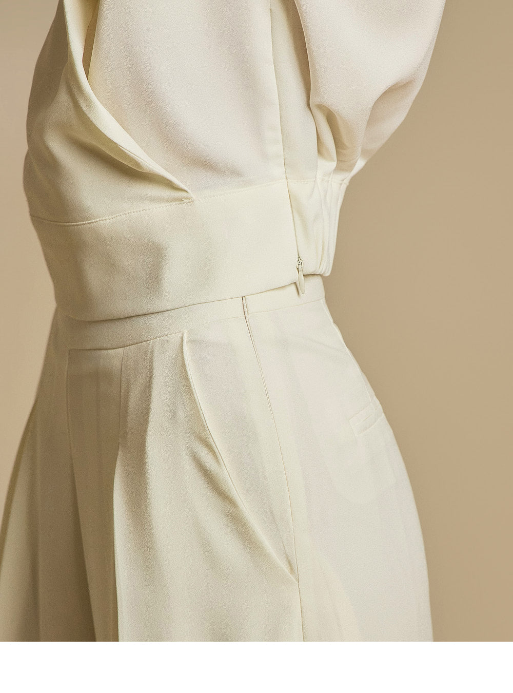 スラックスはピンタックのディテールが施されたワイドフィットで、