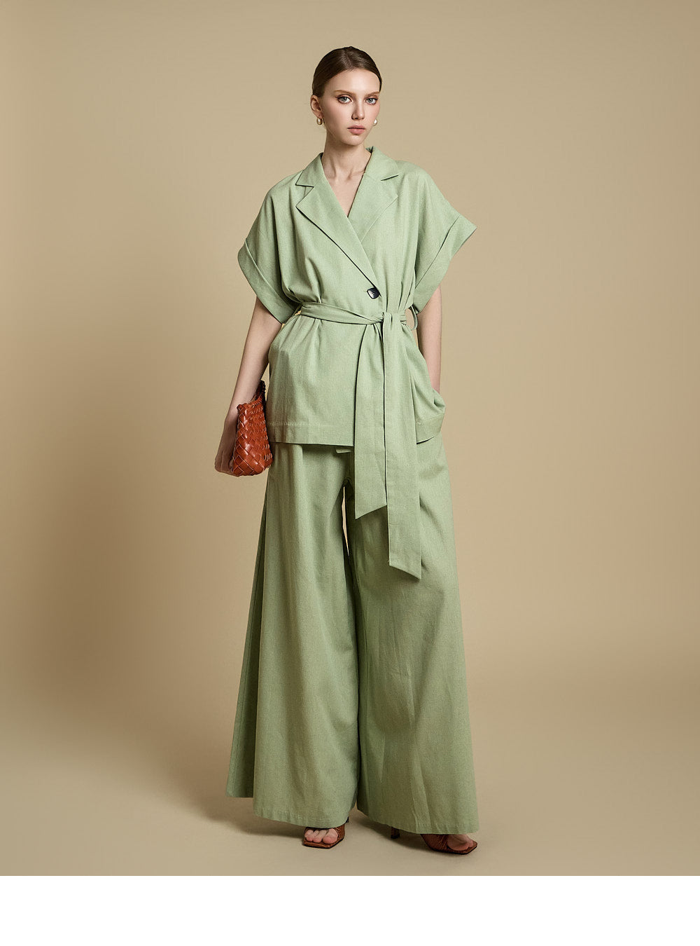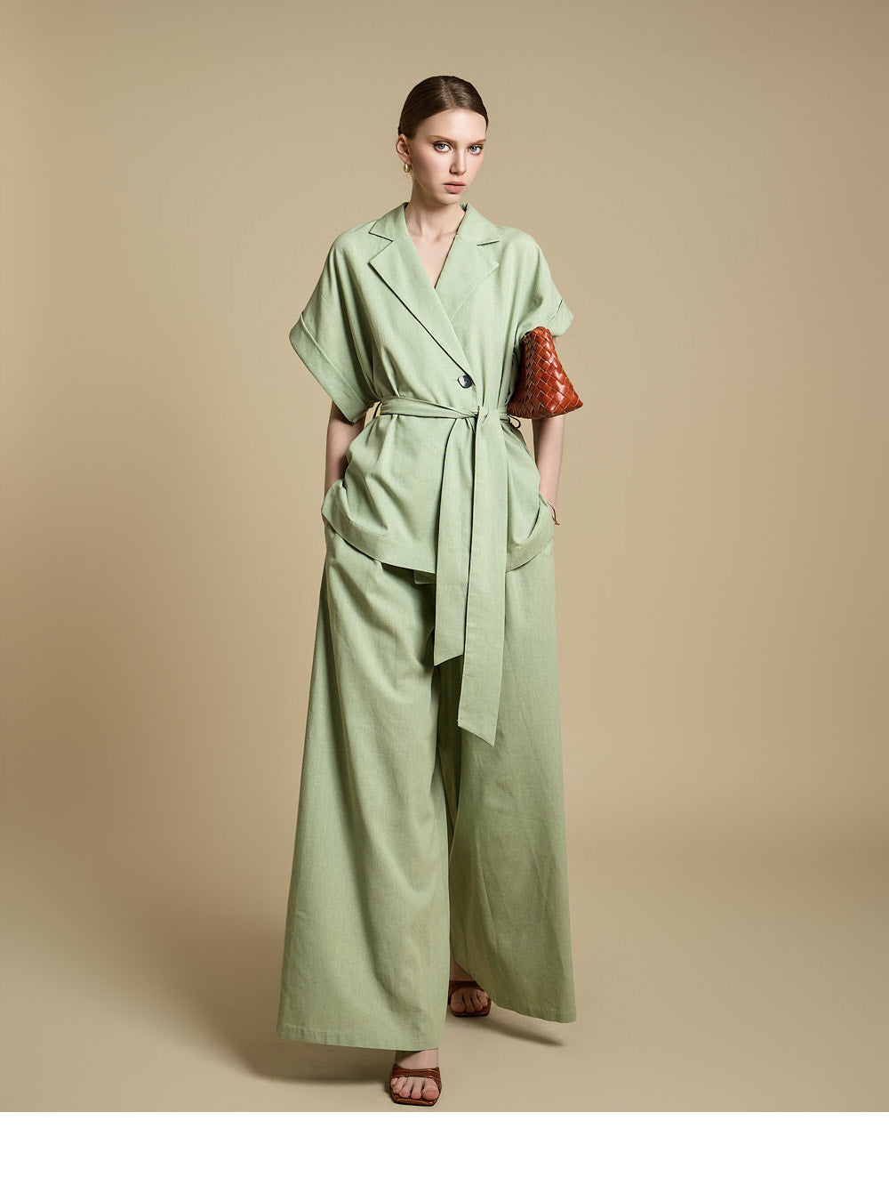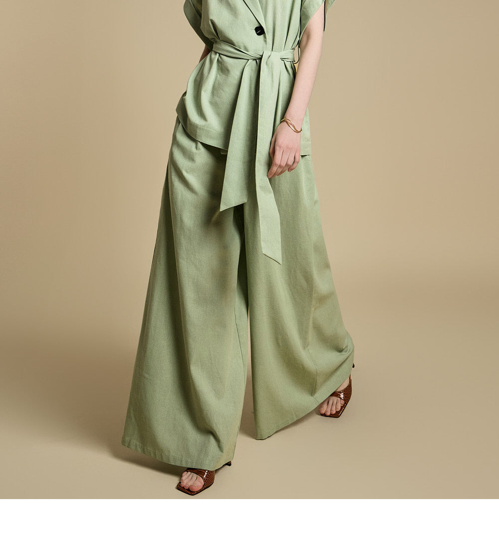 スラックスは長めのワイドレッグフィットで、すっきりとした快適なラインを演出します。