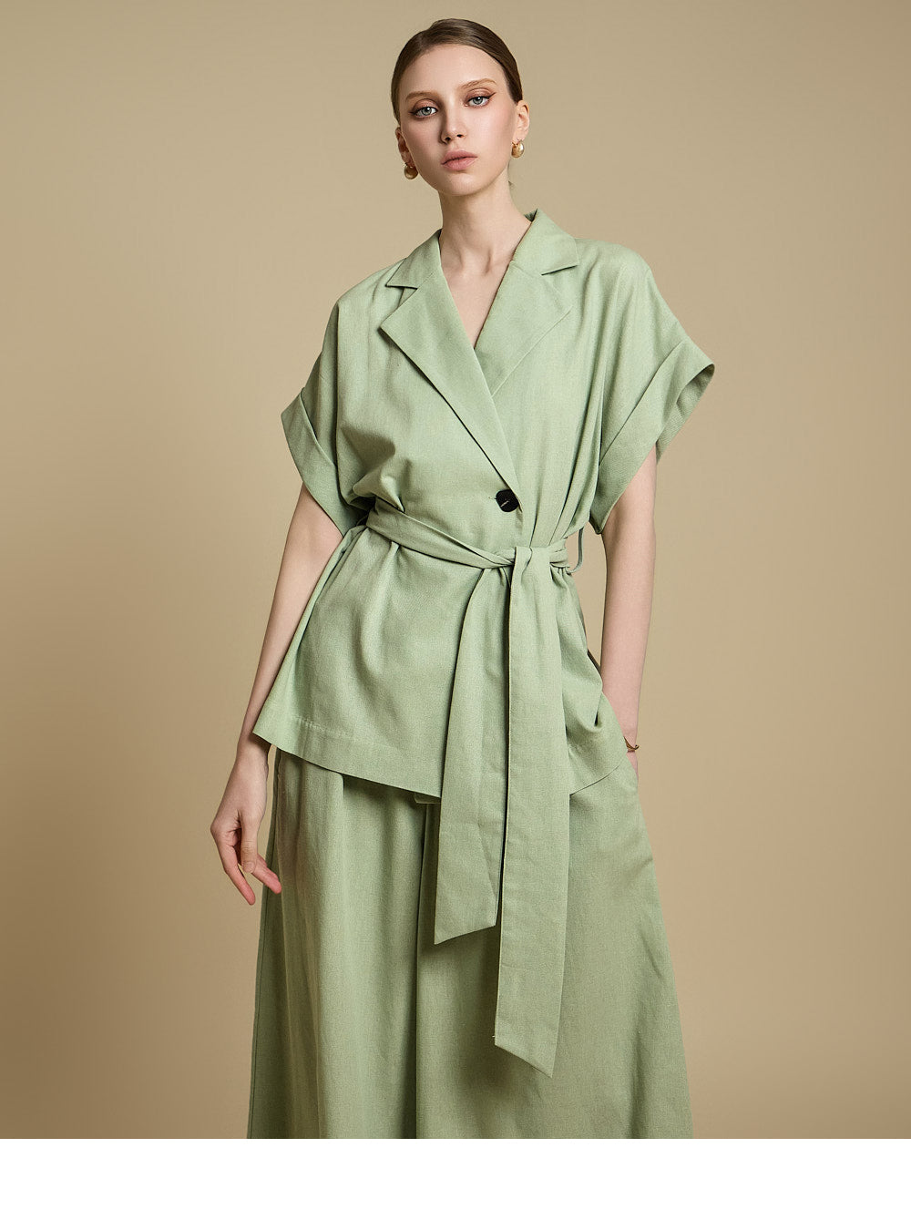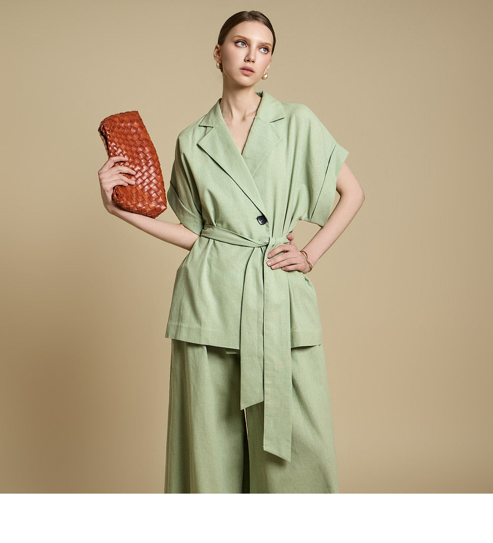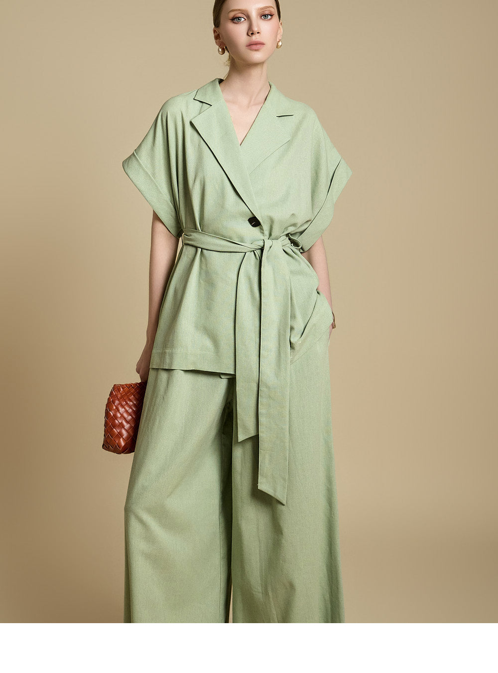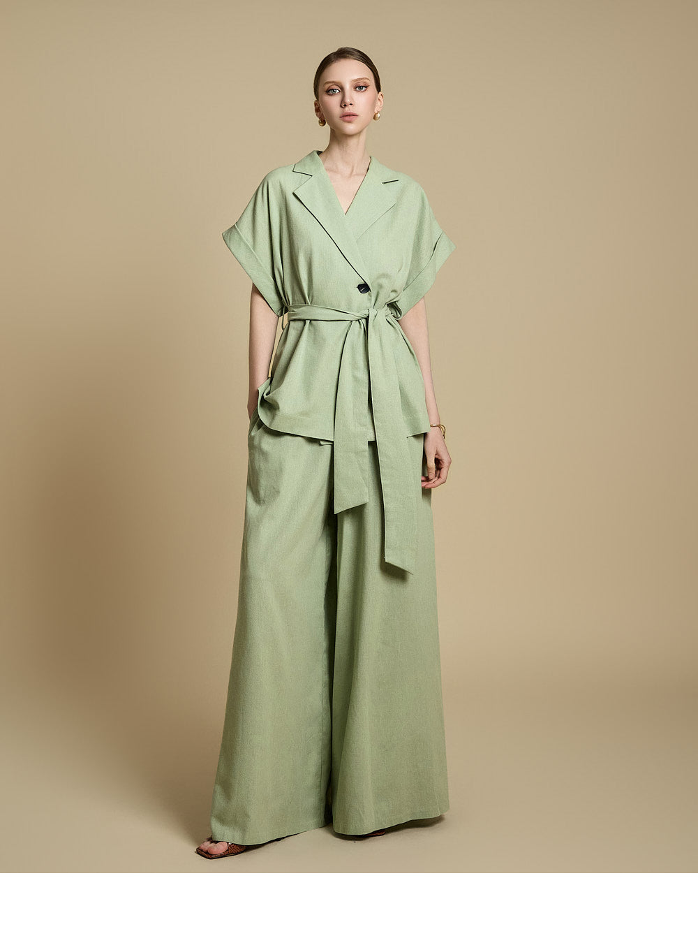 スラックスは長めのワイドレッグフィットで、すっきりとした快適なラインを演出します。