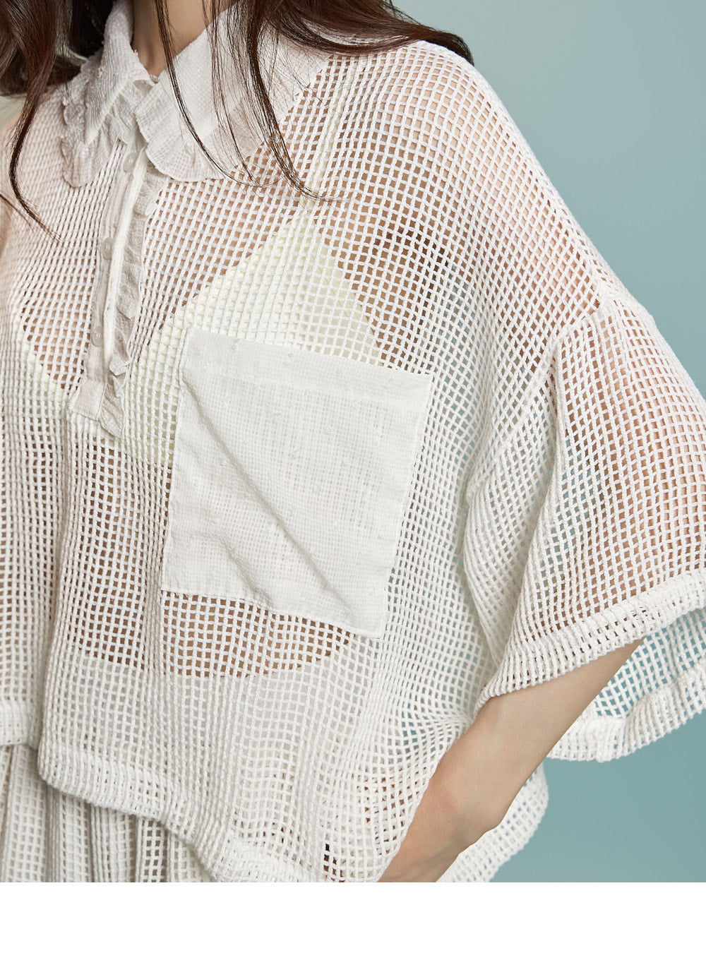 トップスはフリルカラーのゆったりとしたネットブラウス