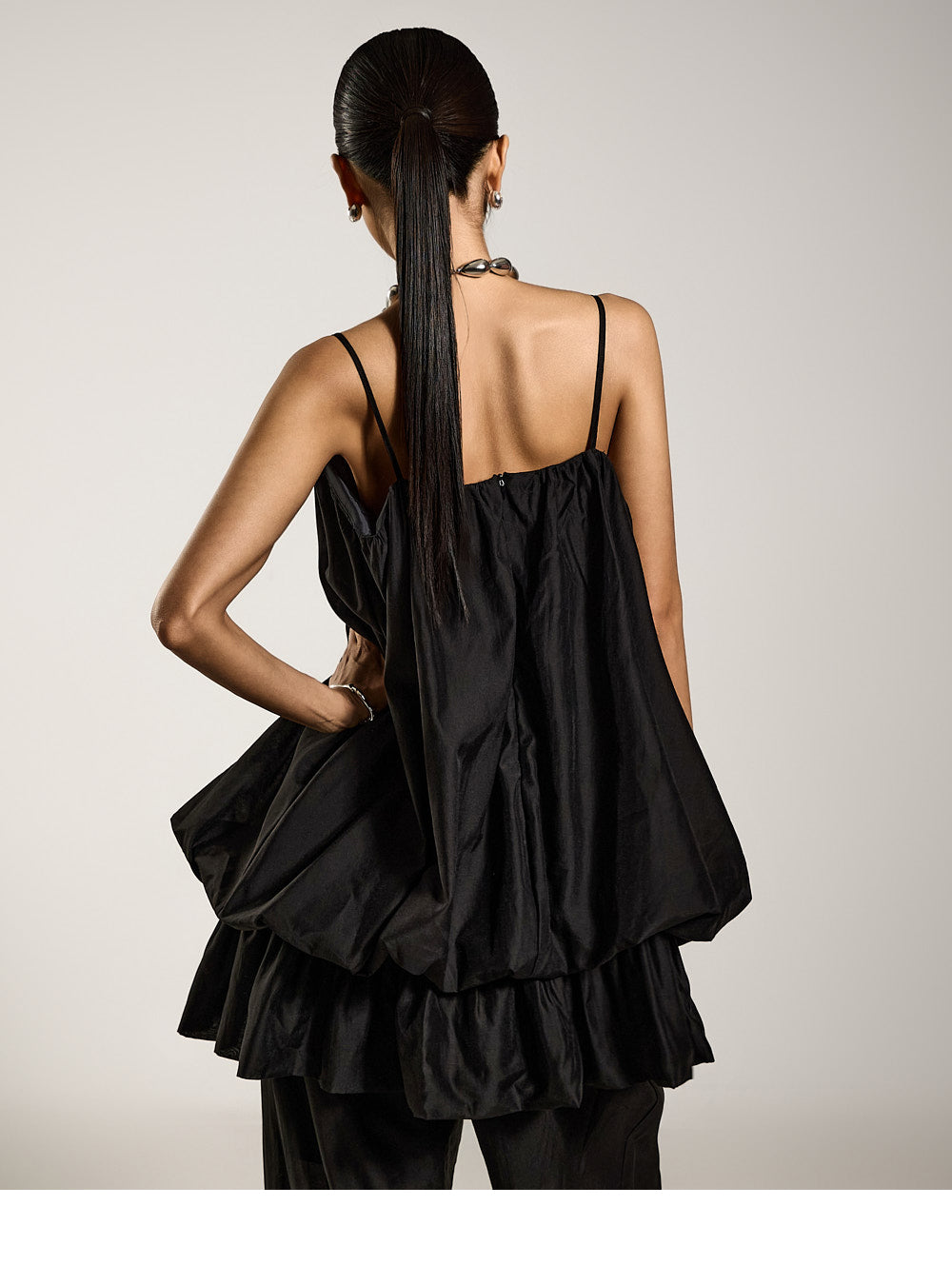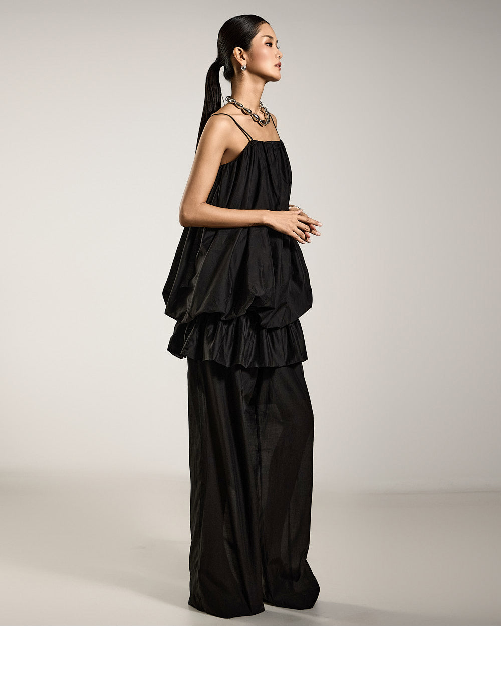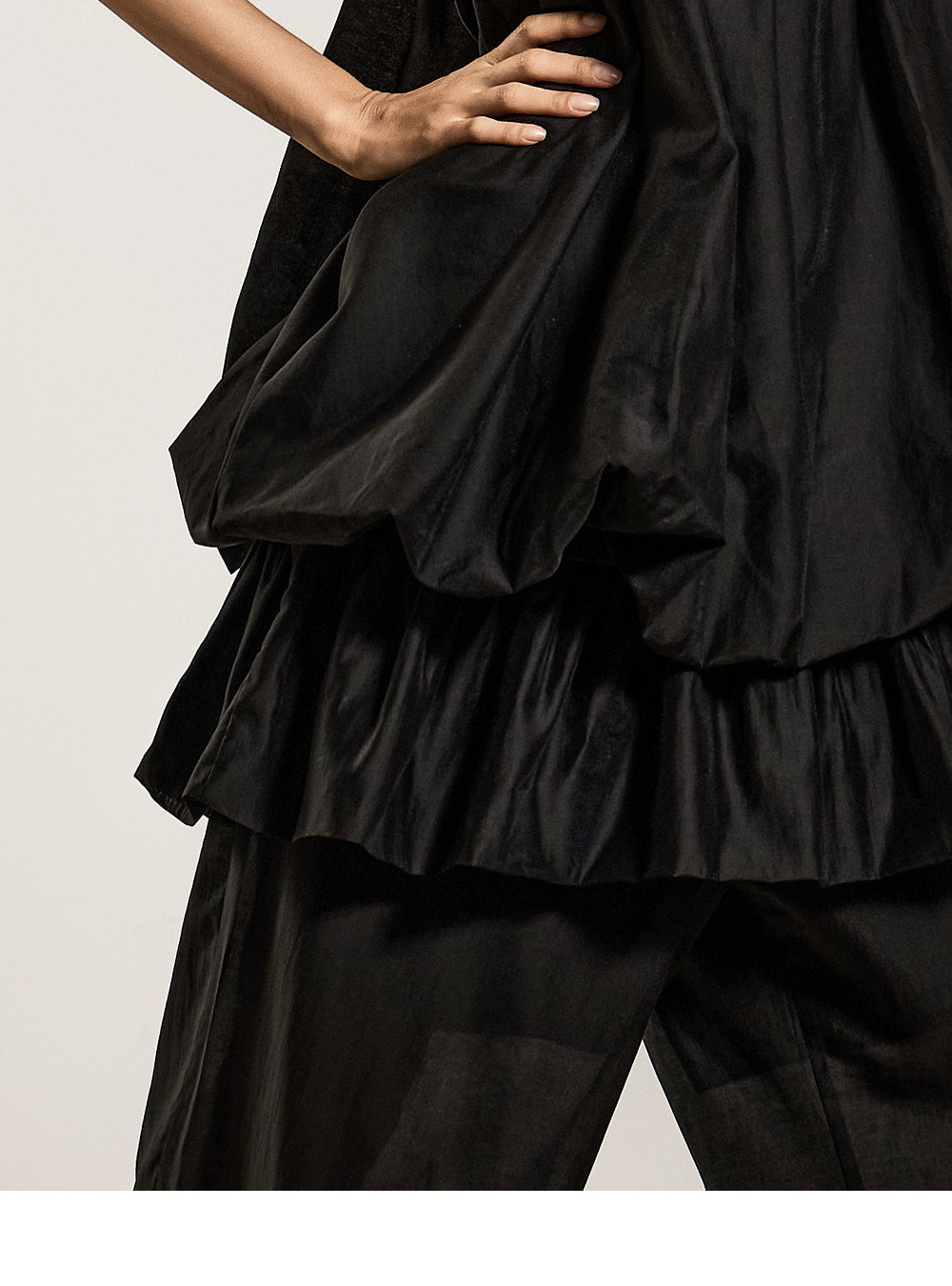 トップスは、ゆったりとしたバルーンシルエットに、裾にフリルを重ねたデザインです。