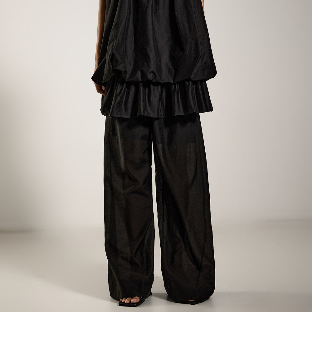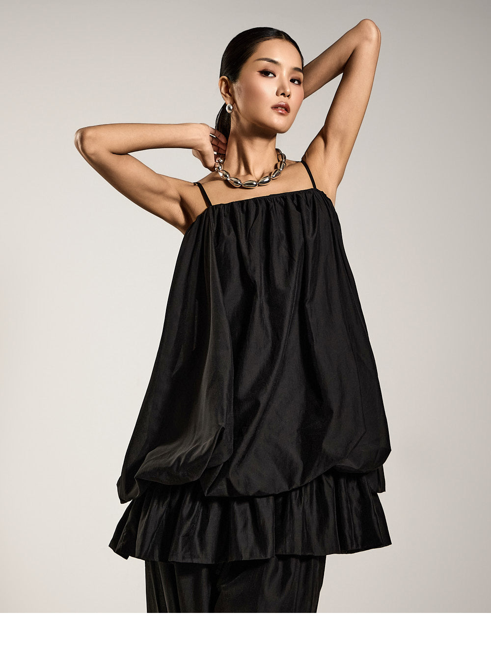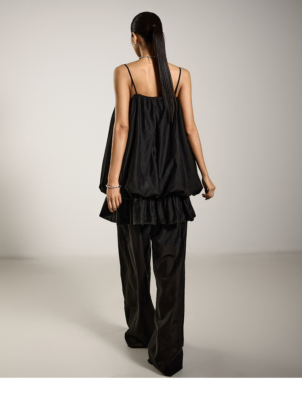 トップスは、ゆったりとしたバルーンシルエットに、裾にフリルを重ねたデザインです。