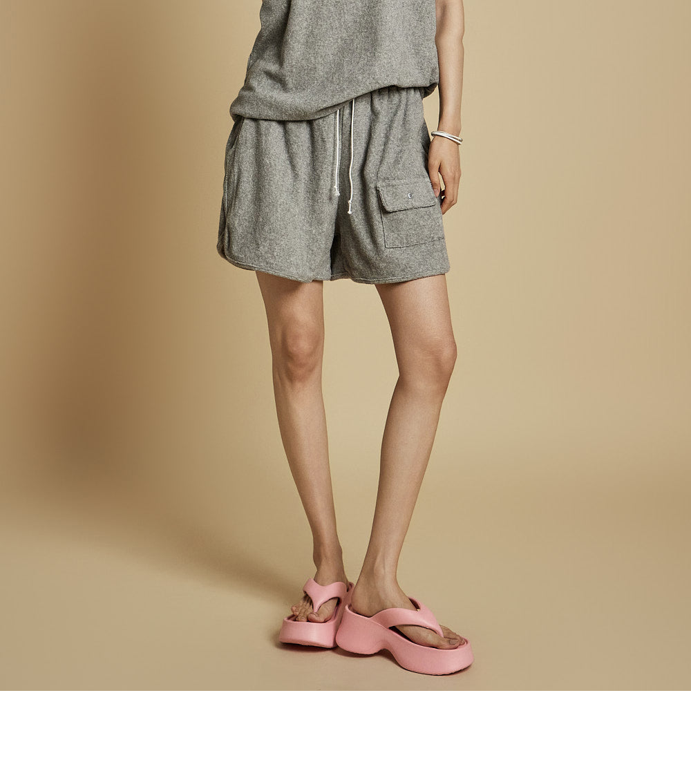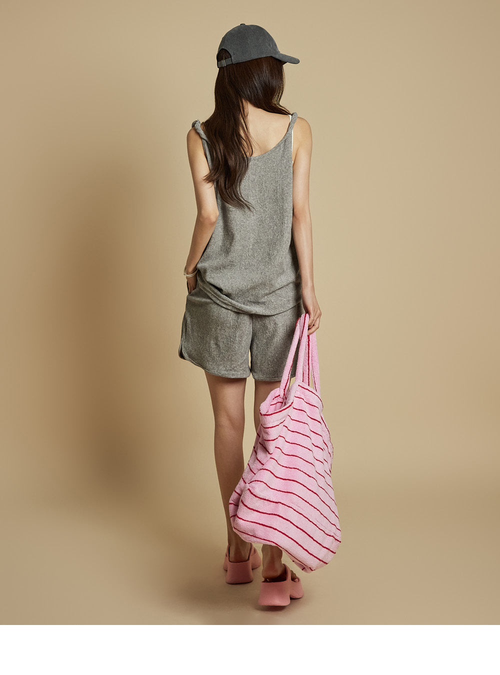 カジュアルでリラックスした雰囲気を演出するノースリーブのトップスとショーツのセットです。