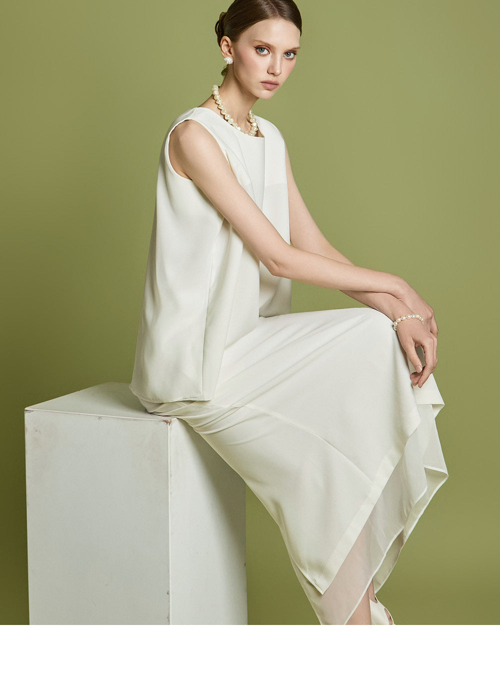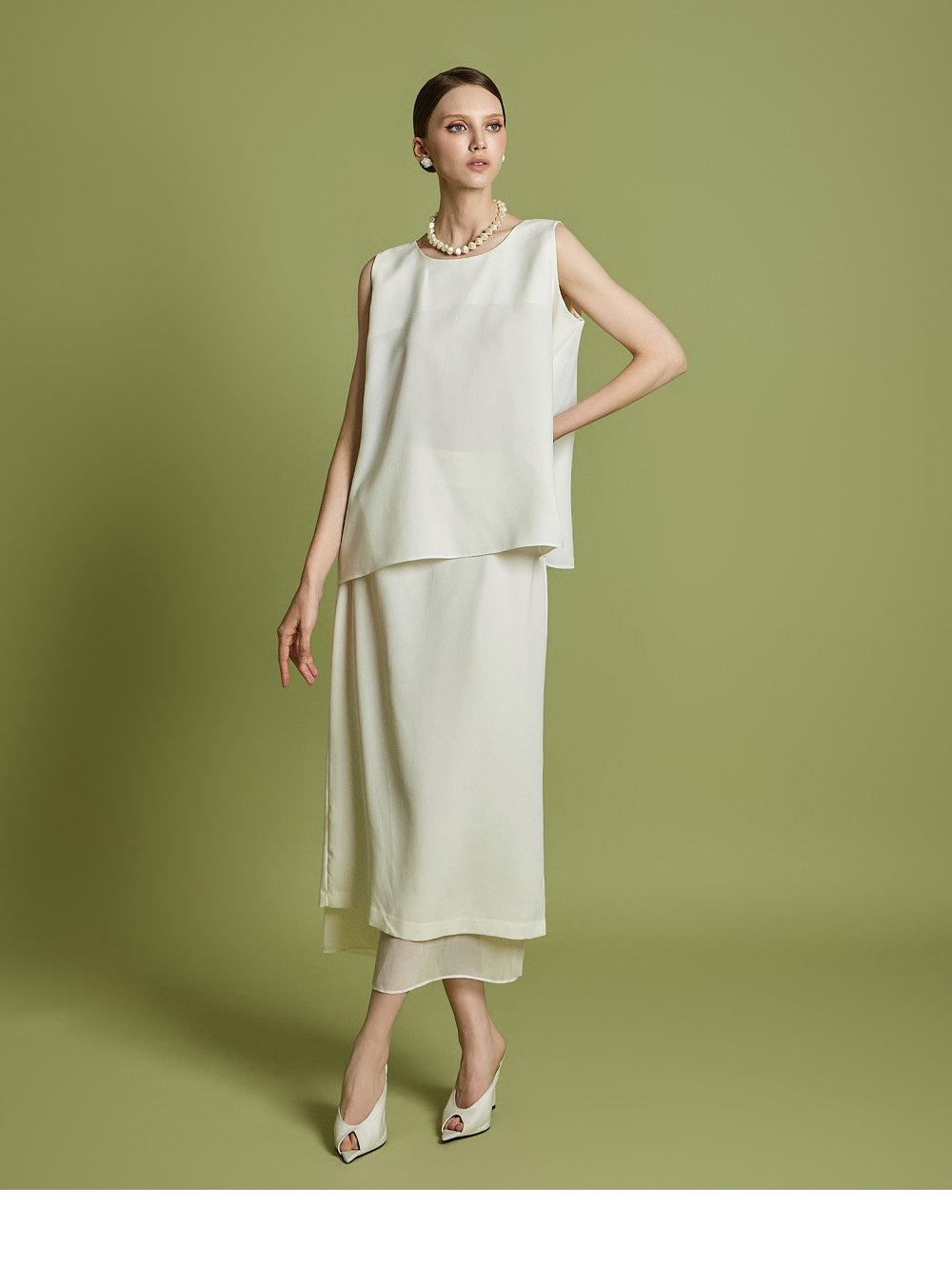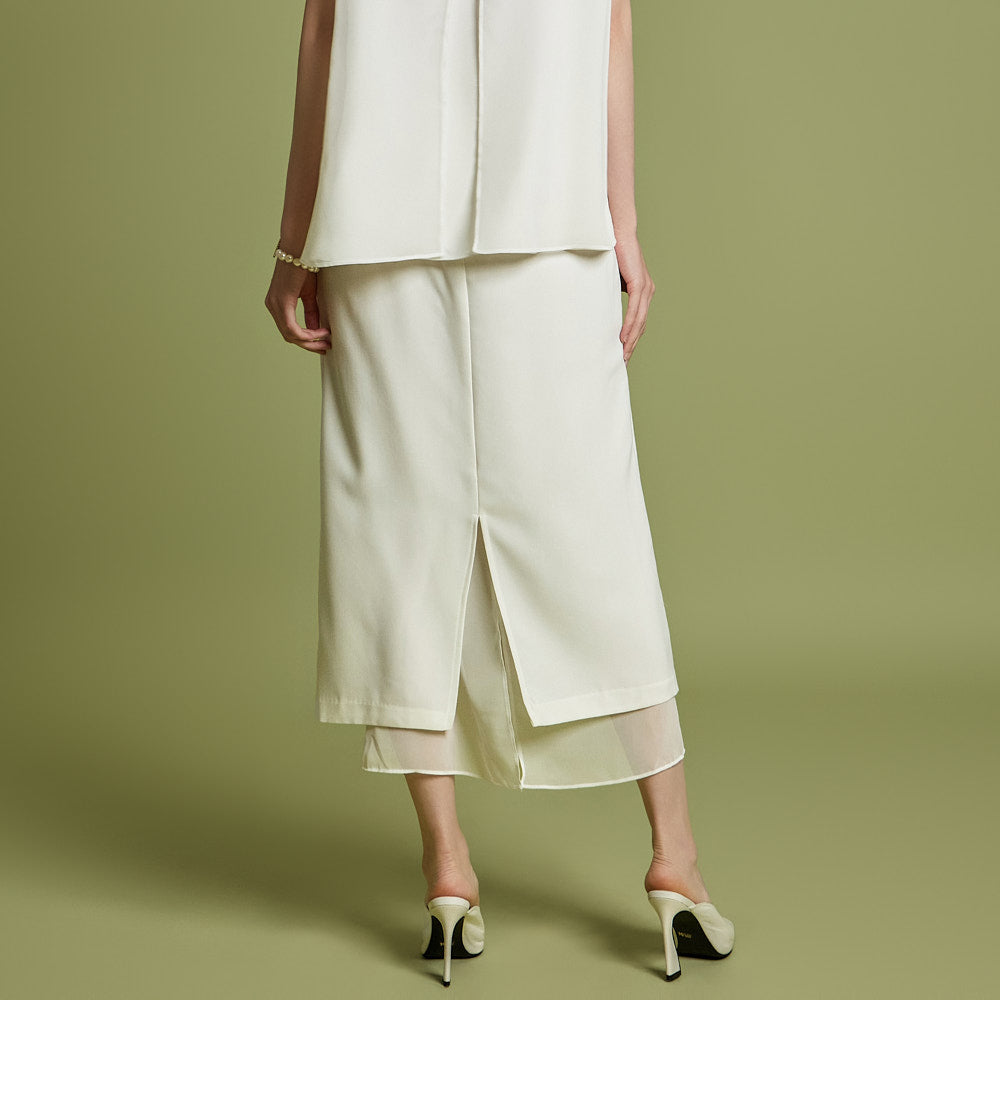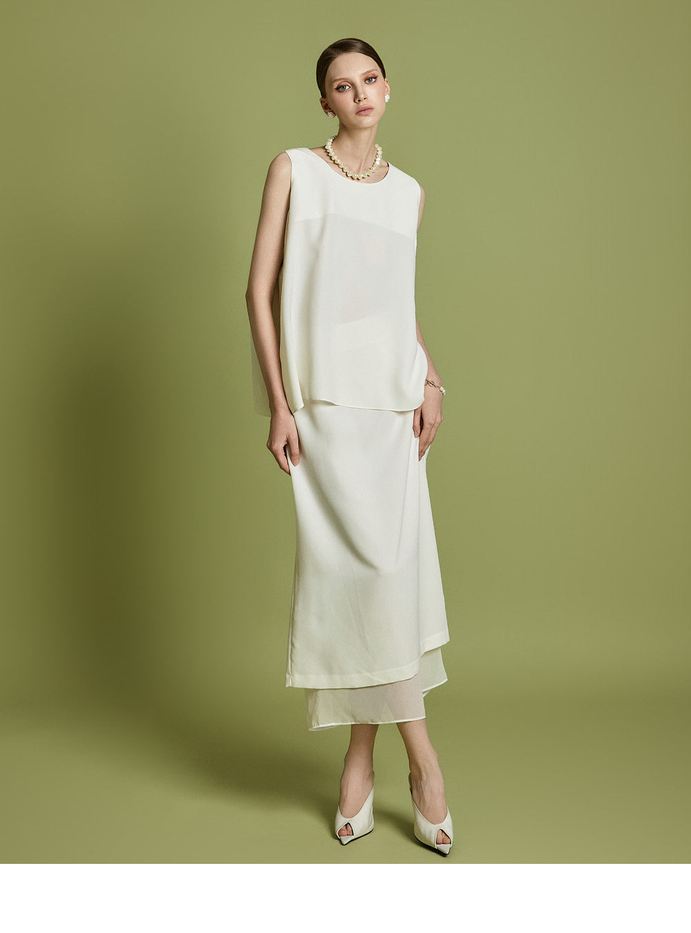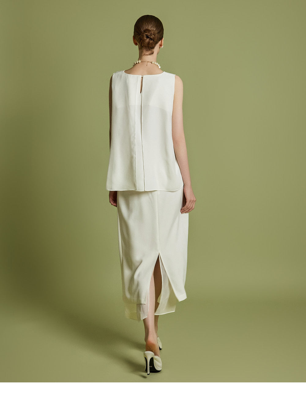 ノースリーブのトップスとスカートのセットは、洗練されたモダンなエレガンスを醸し出します。