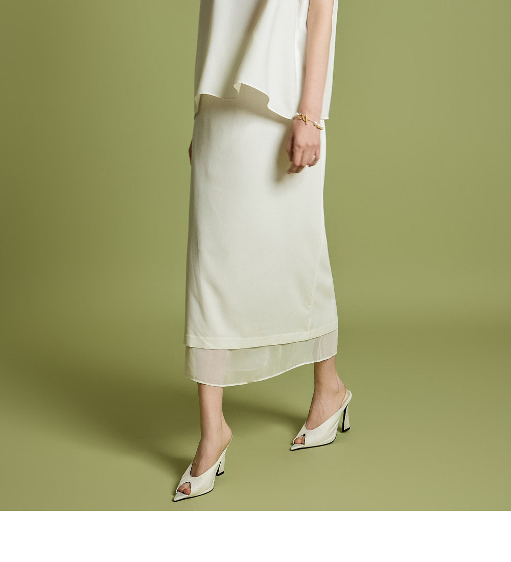 Hラインスカートは重ねたシアー素材のアクセントでデザインされ、