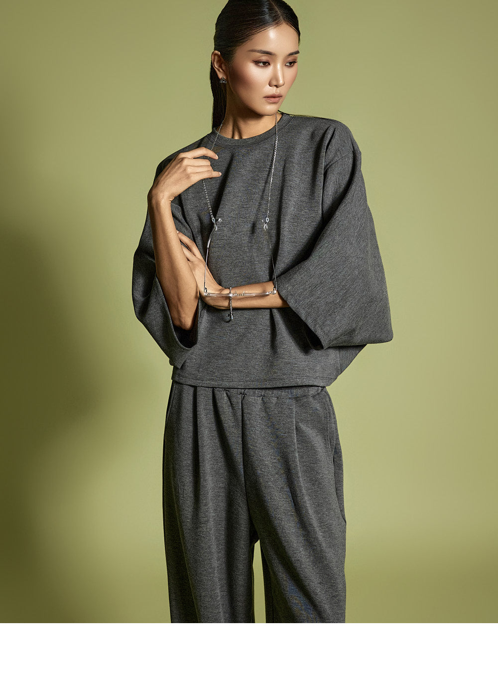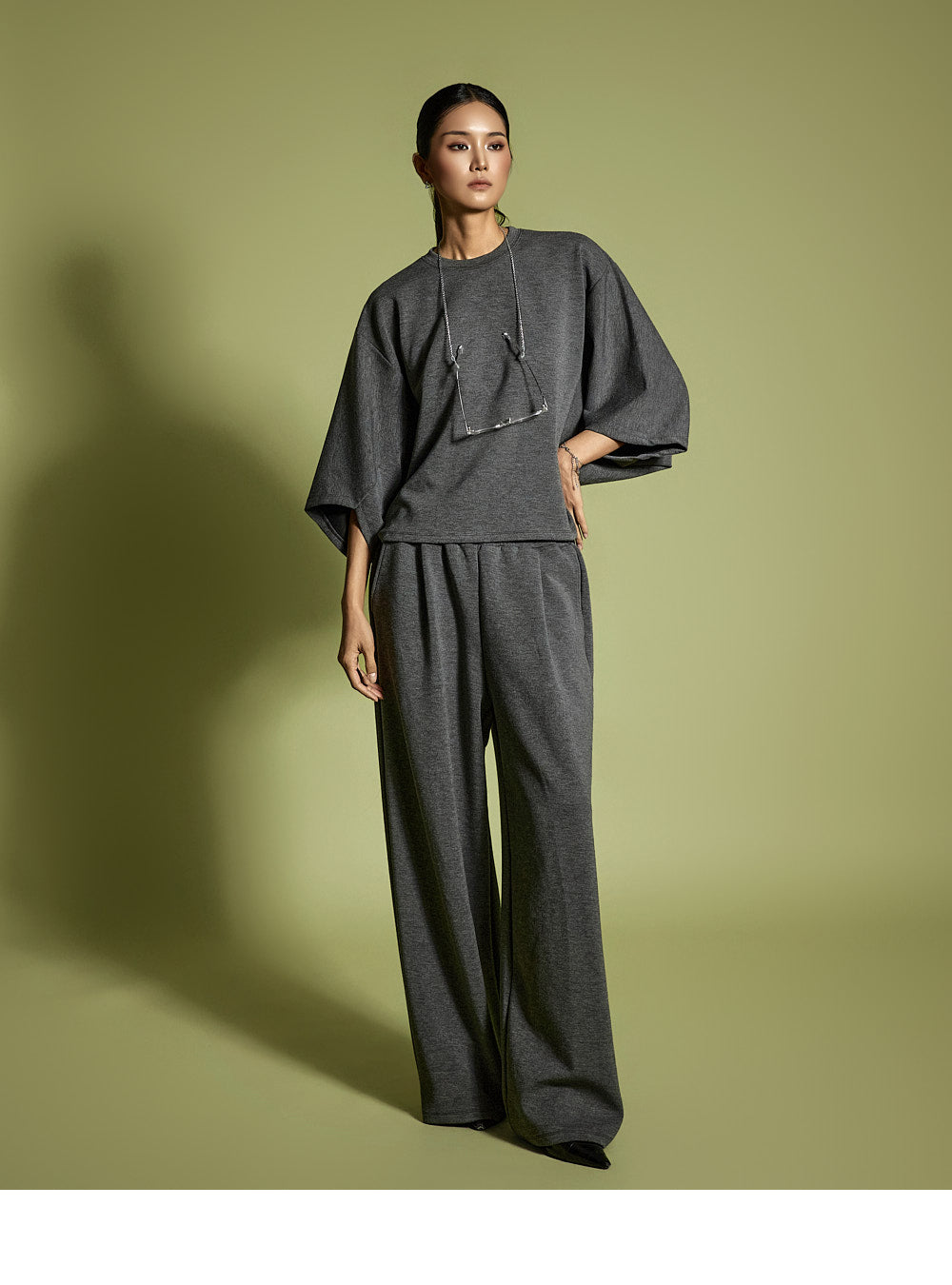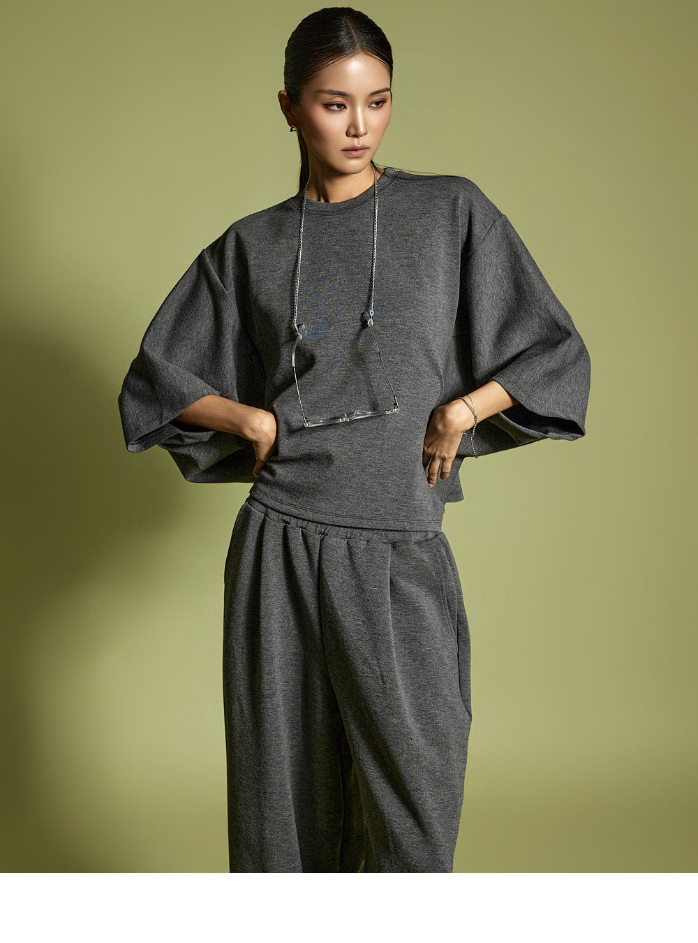 Model is 173CM, wearing ONE SIZE for both top and bottom in Charcoal.