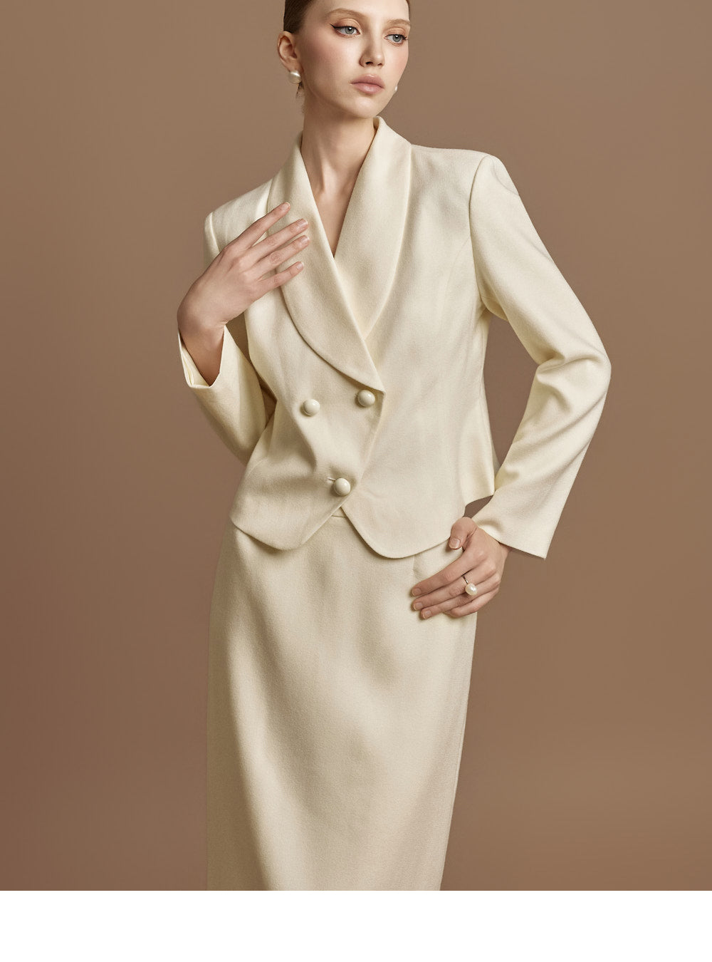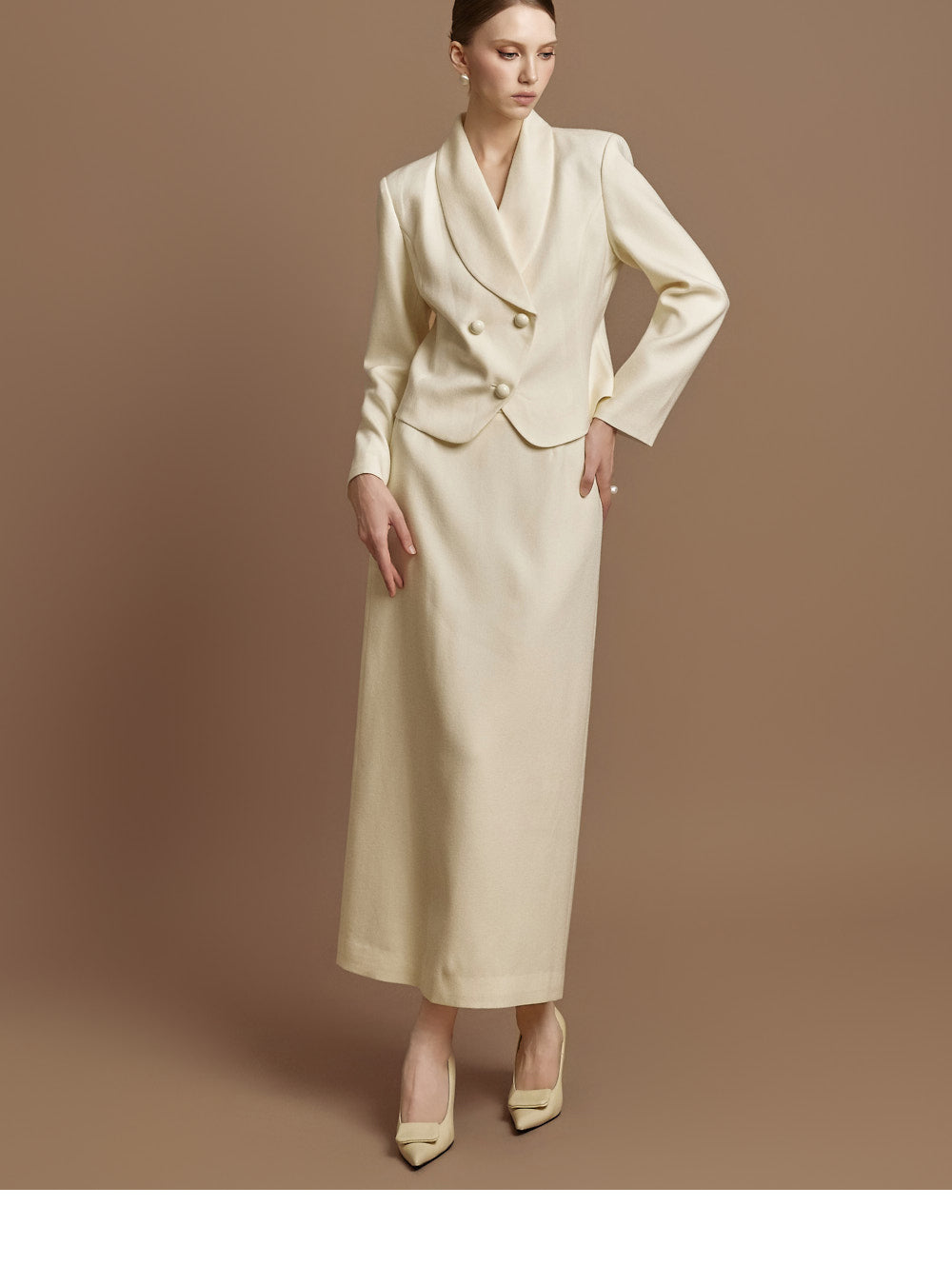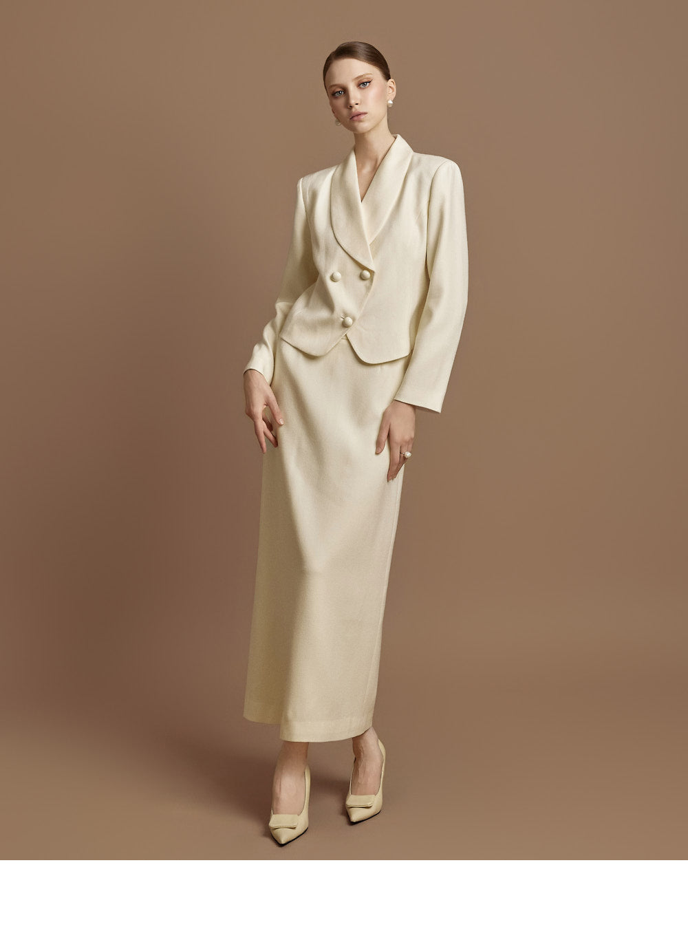 This jacket and skirt set exudes a classic vibe.